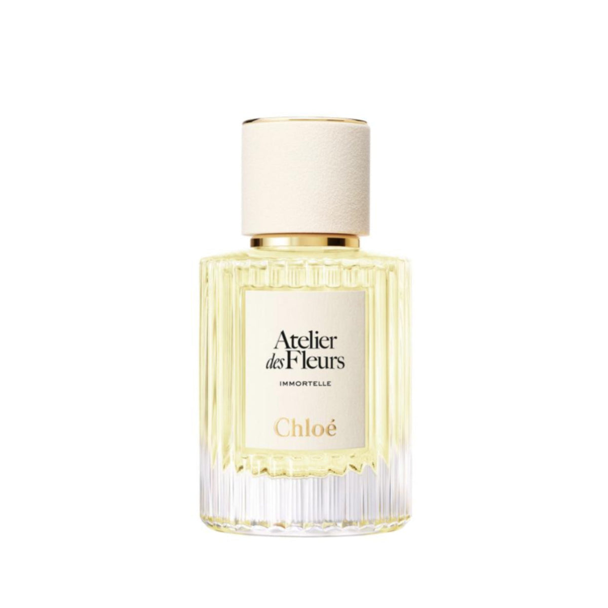 The collection is presented in the characteristic pleated glass bottle with an ivory cap that appears to be carved from stone. The gold accents on the neck and label edge skillfully underline the light hue of each Eau de Parfum