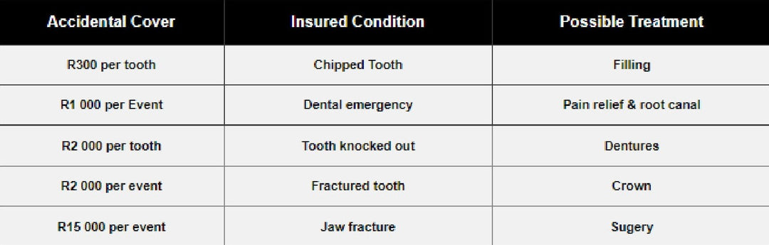 The dental Accident Plan will pay out cash in the event of dental claims as per the insured benefits.