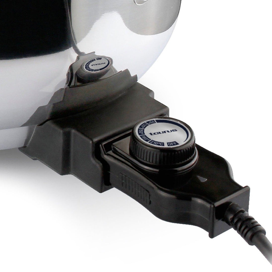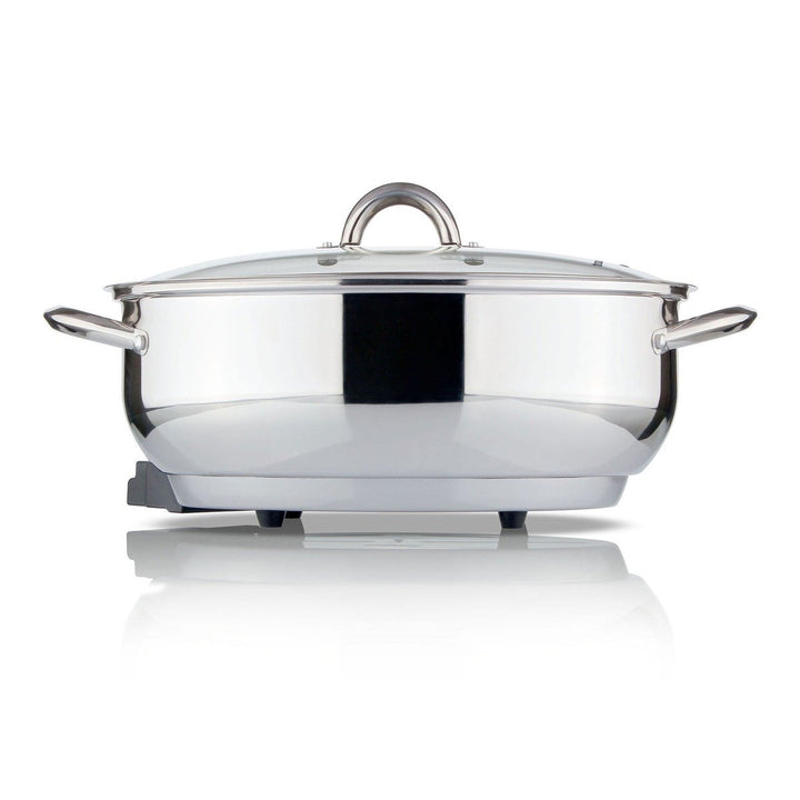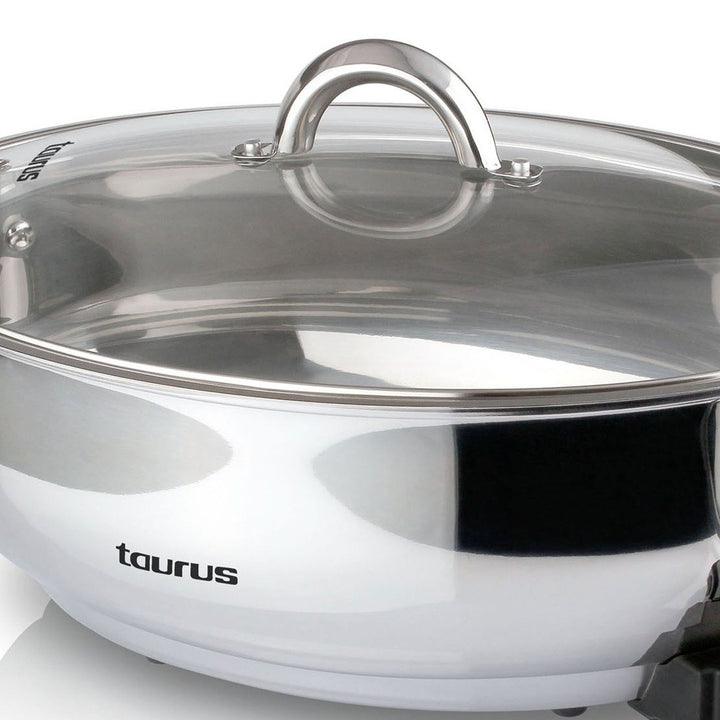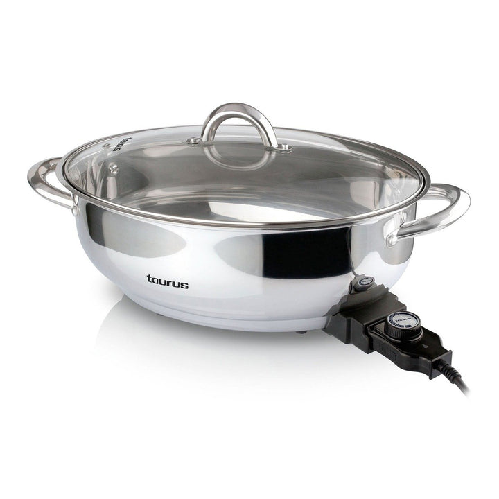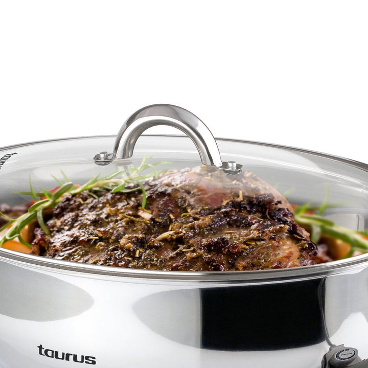 The Inox Torrat stainless steel roasting skillet from Taurus has stainless steel handles and knob with adjustable temperature probe.