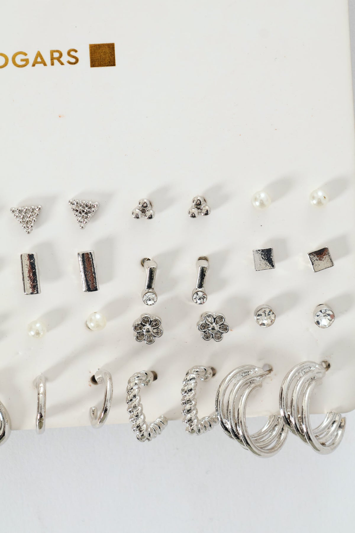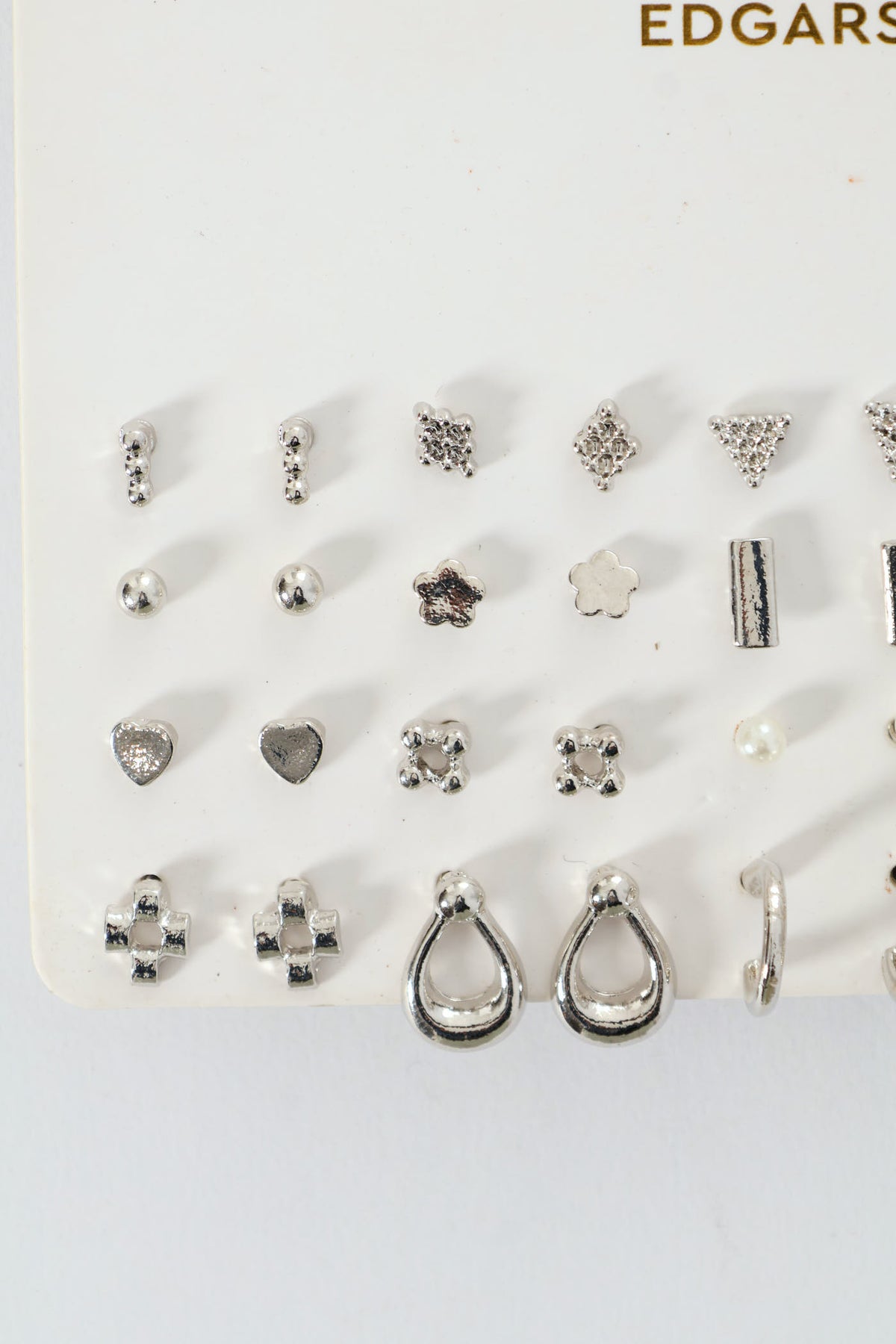20 Pack Floral Stud Small Hoop Earrings - Silver