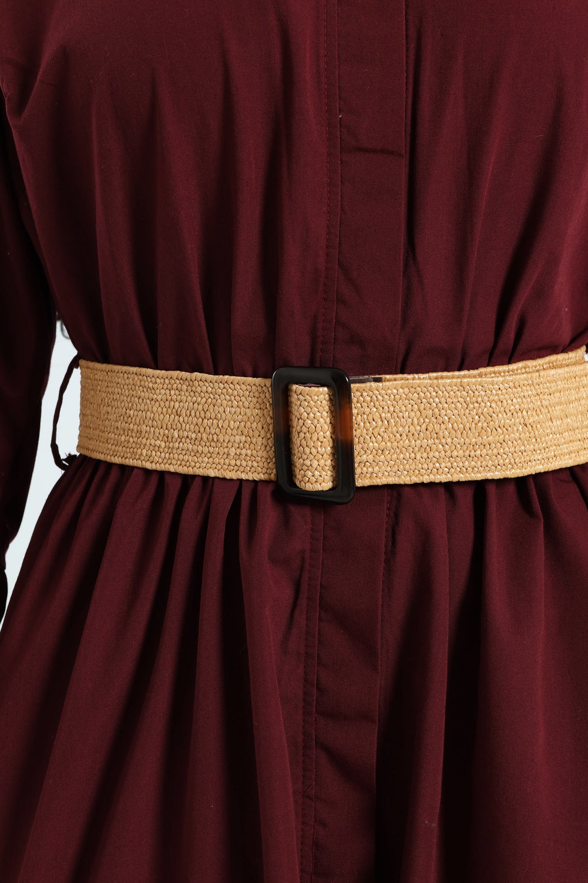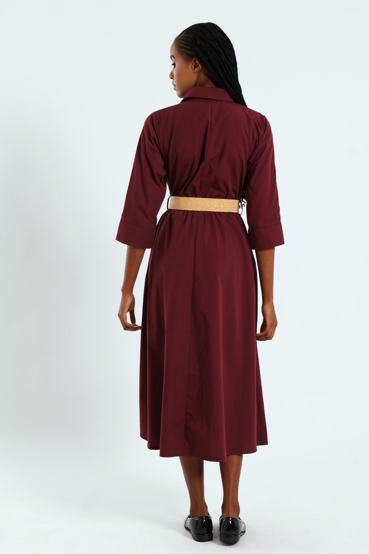 3/4 Sleeve Belted Midi Shirt Dress - Burgundy
