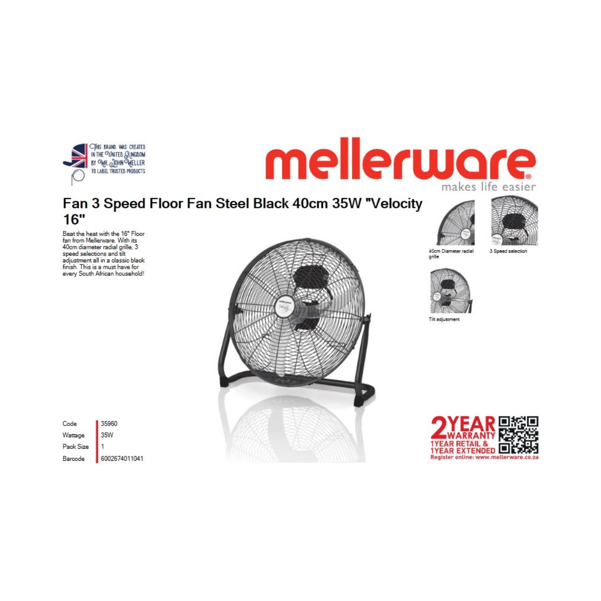 Beat the heat with the 16'' Floor fan from Mellerware. With its 40cm diameter radial grille, 3 speed selections and tilt adjustment all in a classic black finish. This is a must have for every South African household!