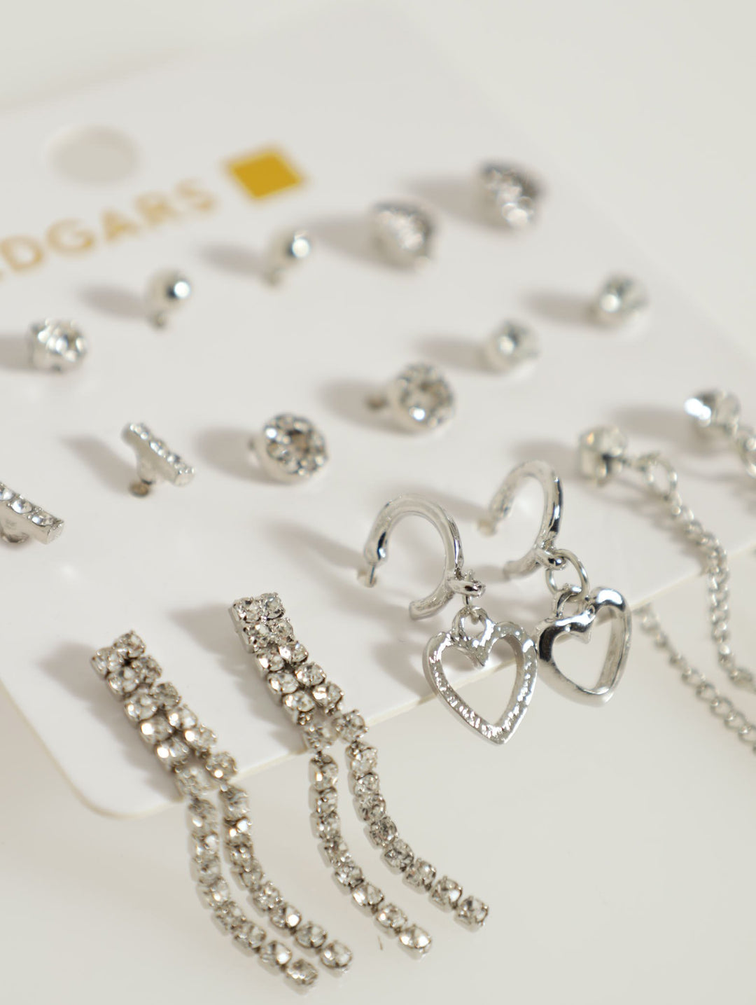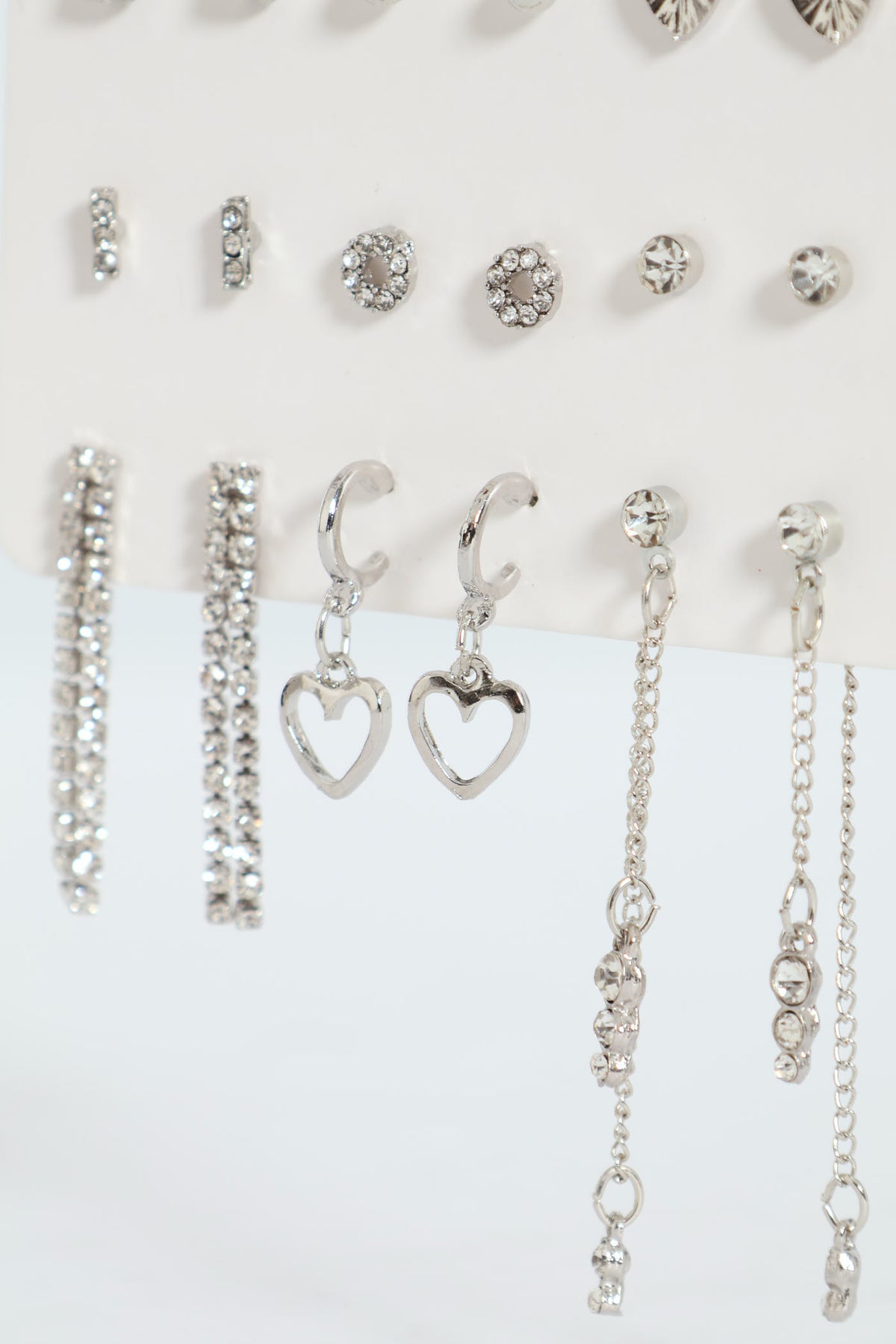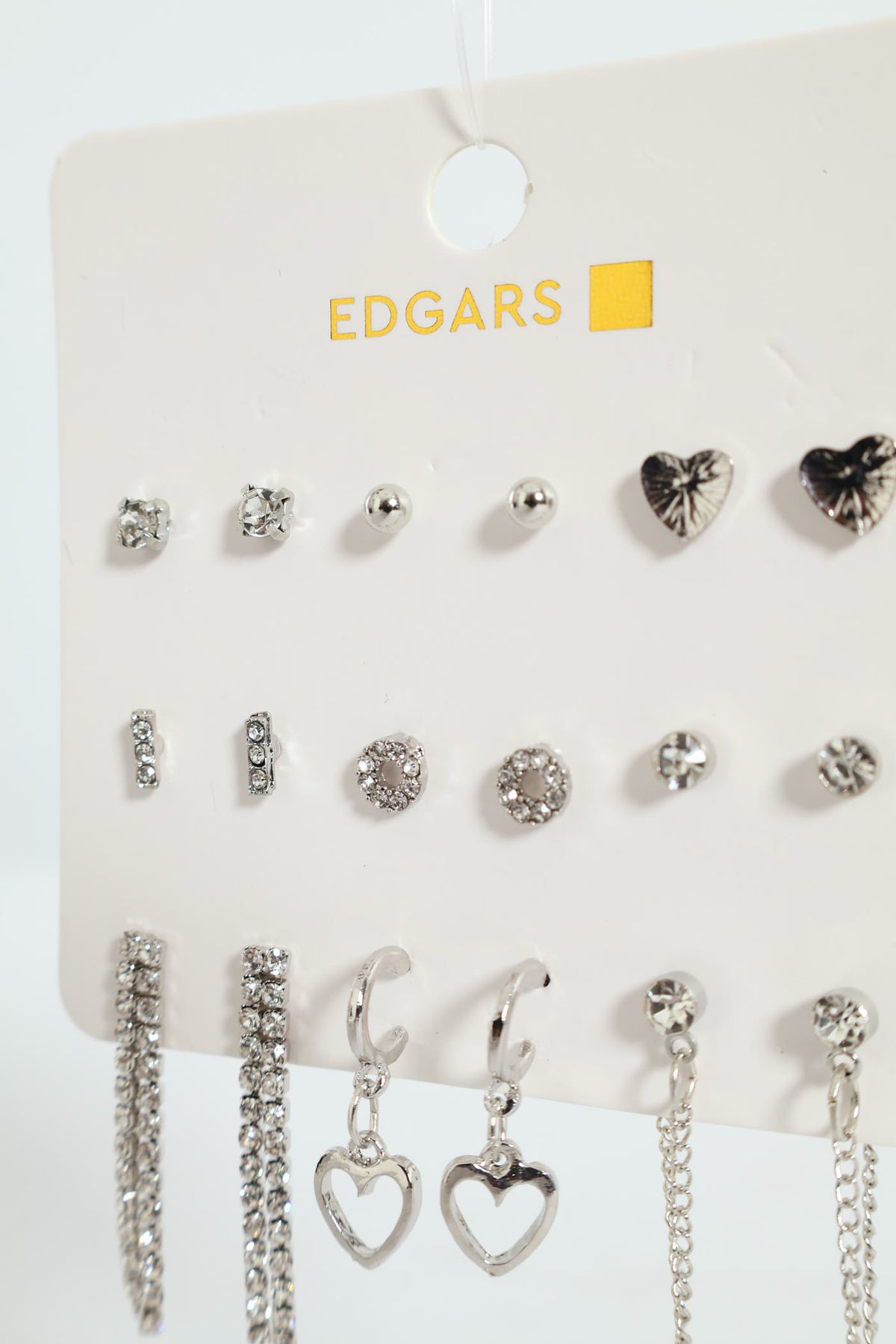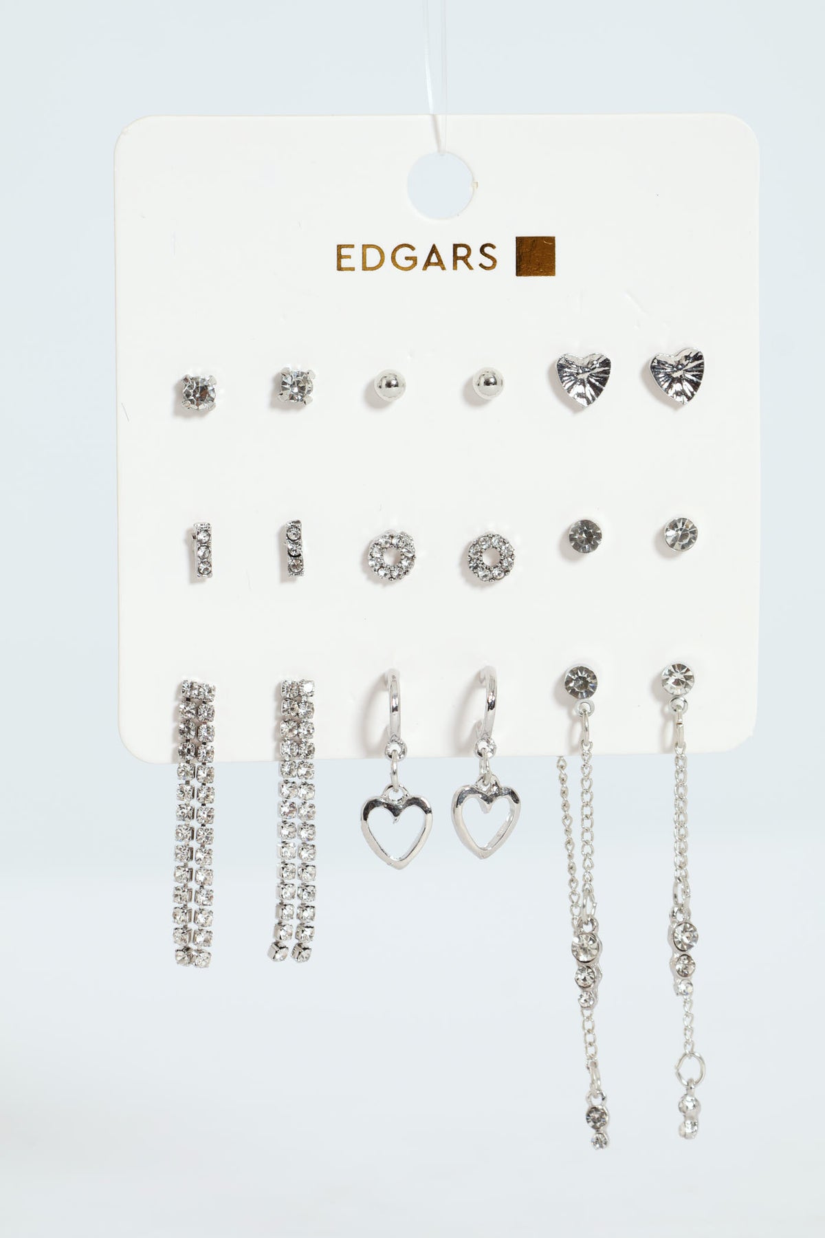 9 Pack Heart And Hanging Diamante Earrings - Silver