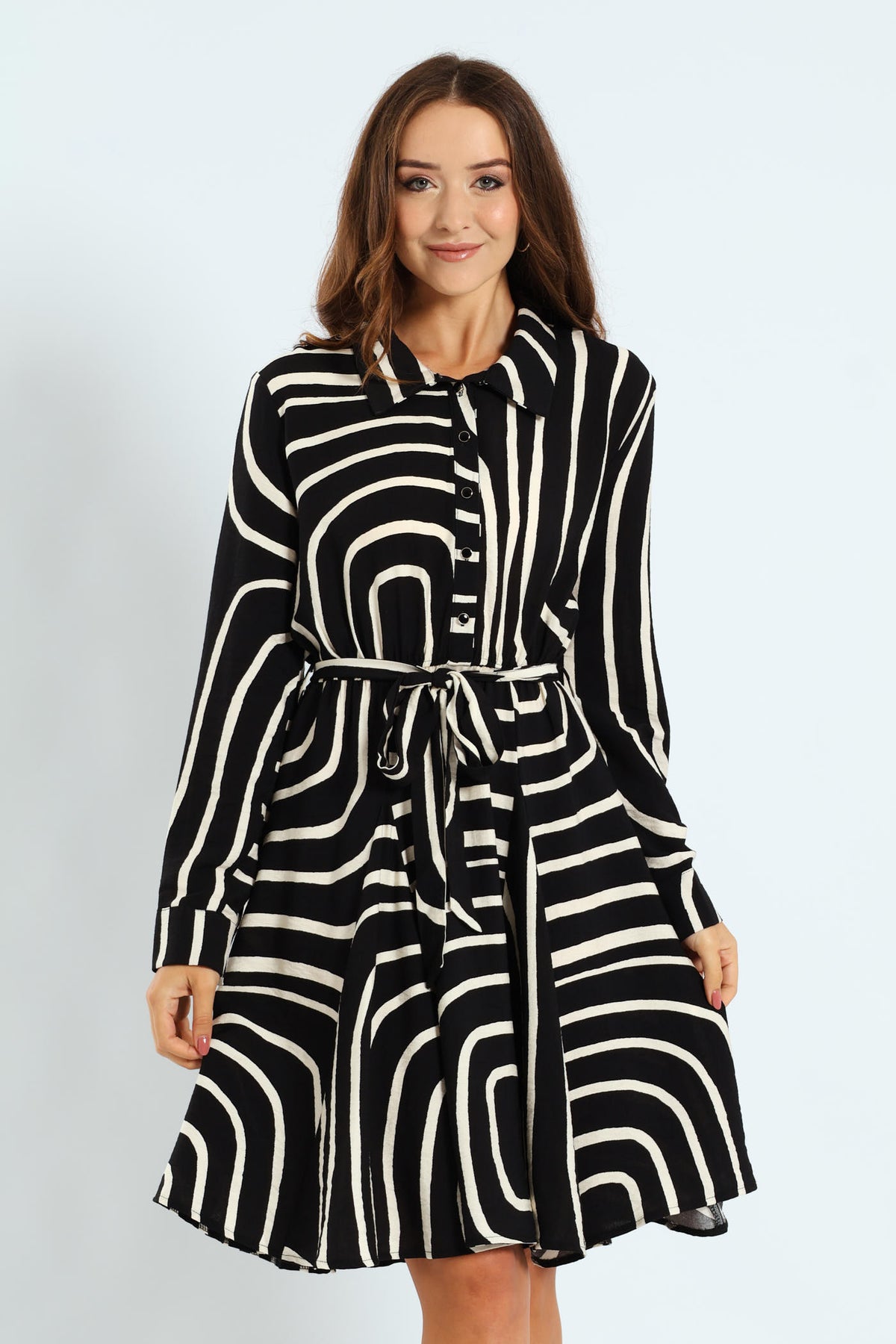 Abstract Button Through Godet Tea Dress - Black/Cream