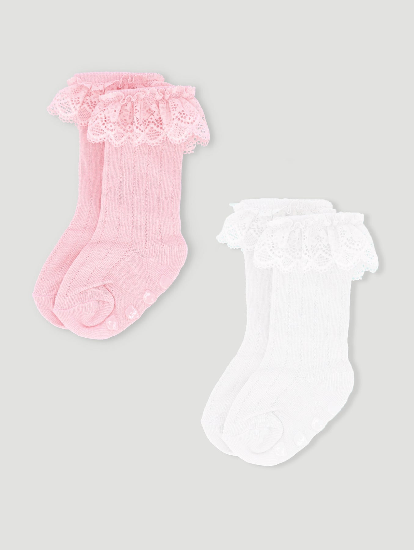 Baby Girls 2 Pack Knee High Lace Socks - Pink