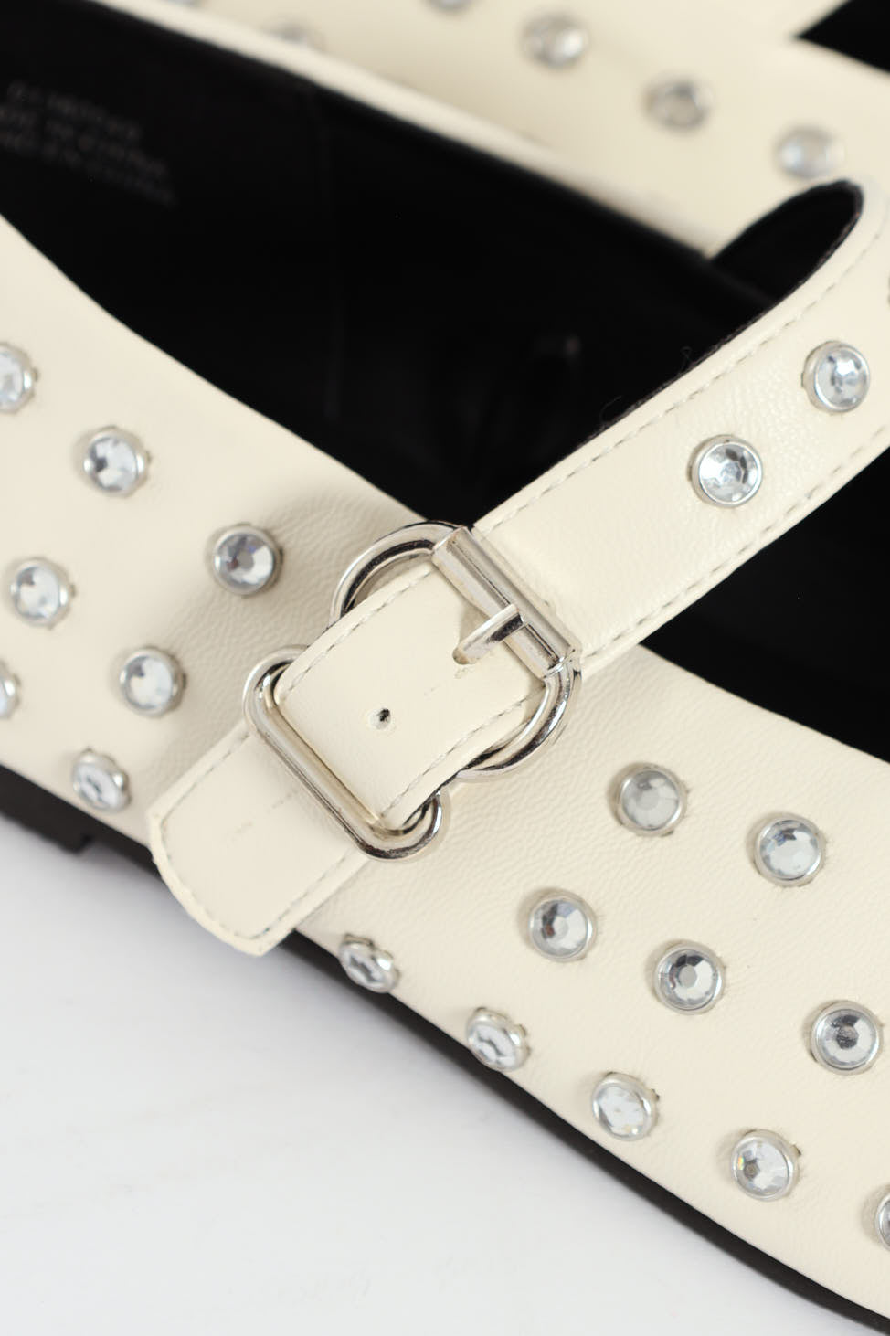 A pair of faux leather ballet flats featuring a Mary Jane design, allover faux gem embellishments, buckled strap, and round toe.