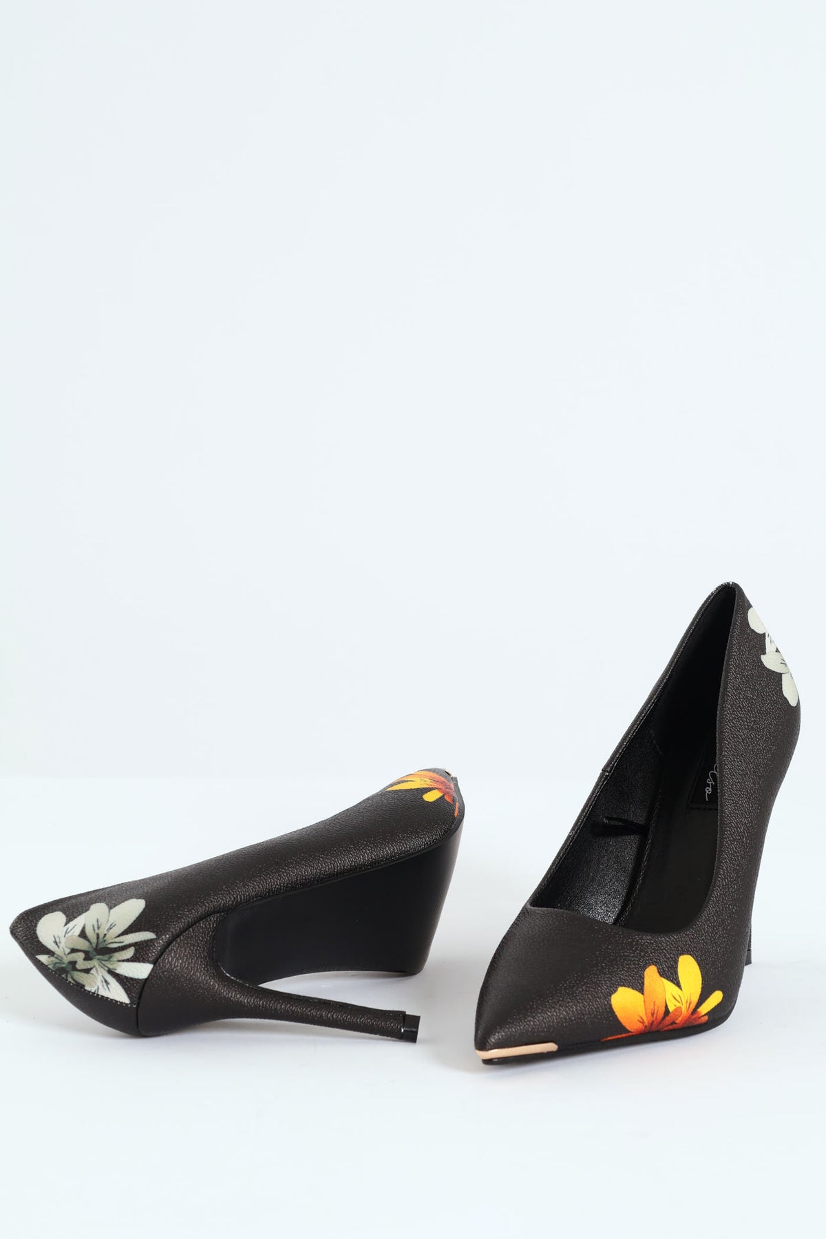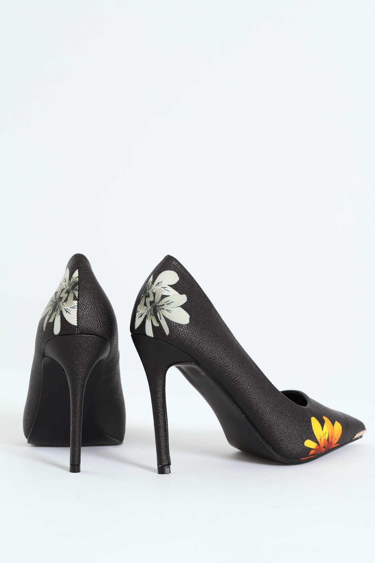 Embrace the beauty of nature with our Black Base Floral Print Stiletto Heel! The stunning yellow and white flower print adds a touch of elegance to the sleek black base, creating a bold and feminine look.