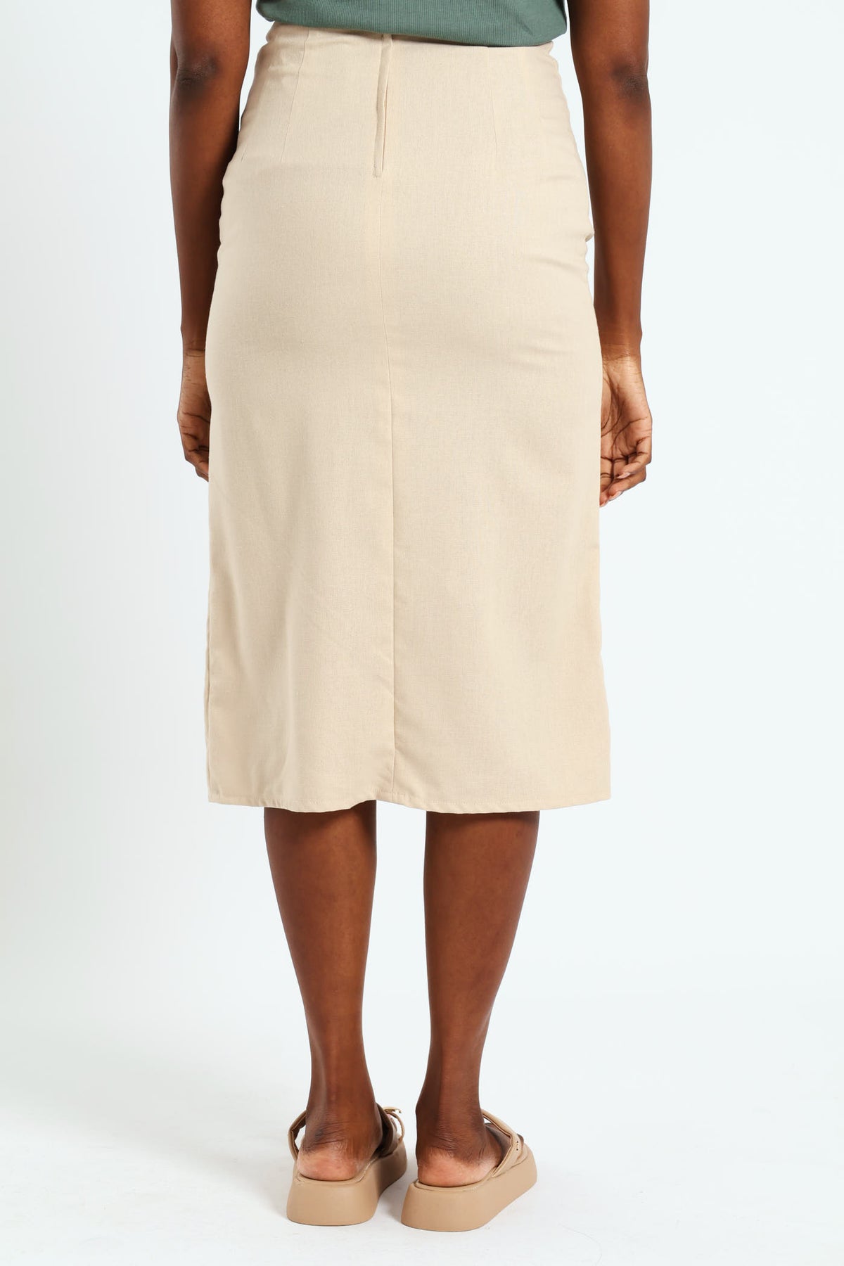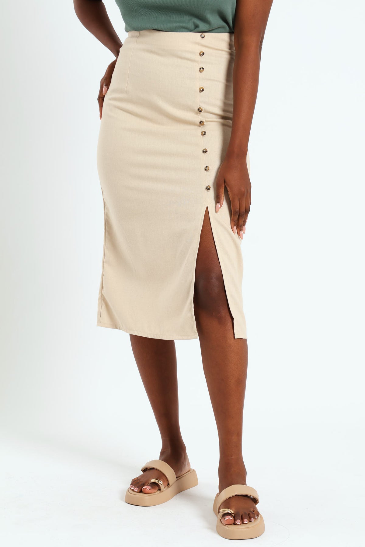 Button Detail & Slit Pencil Midi Skirt - Light Stone