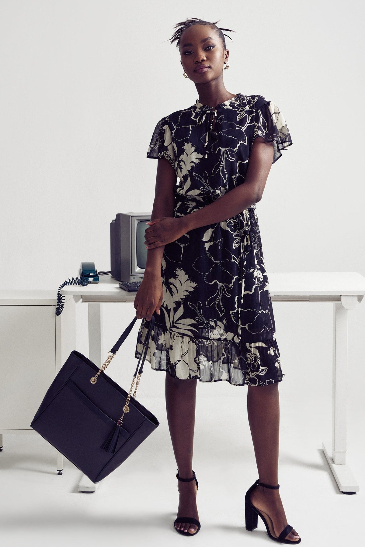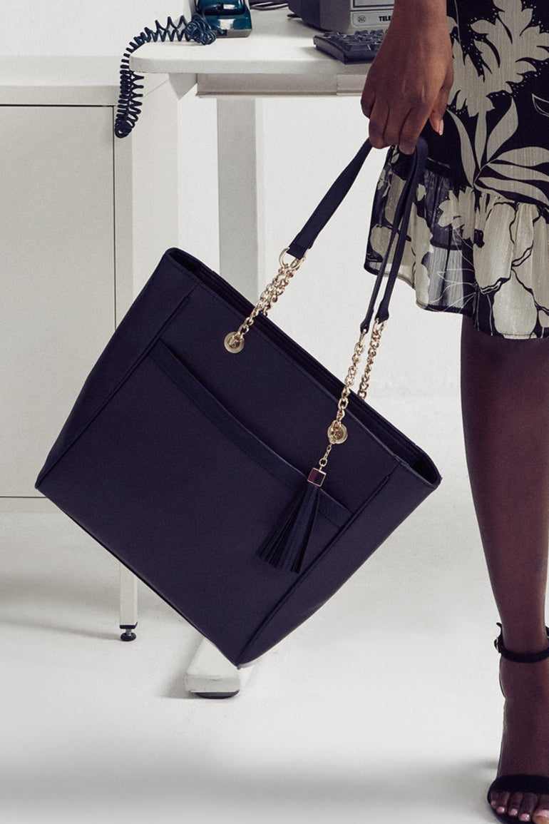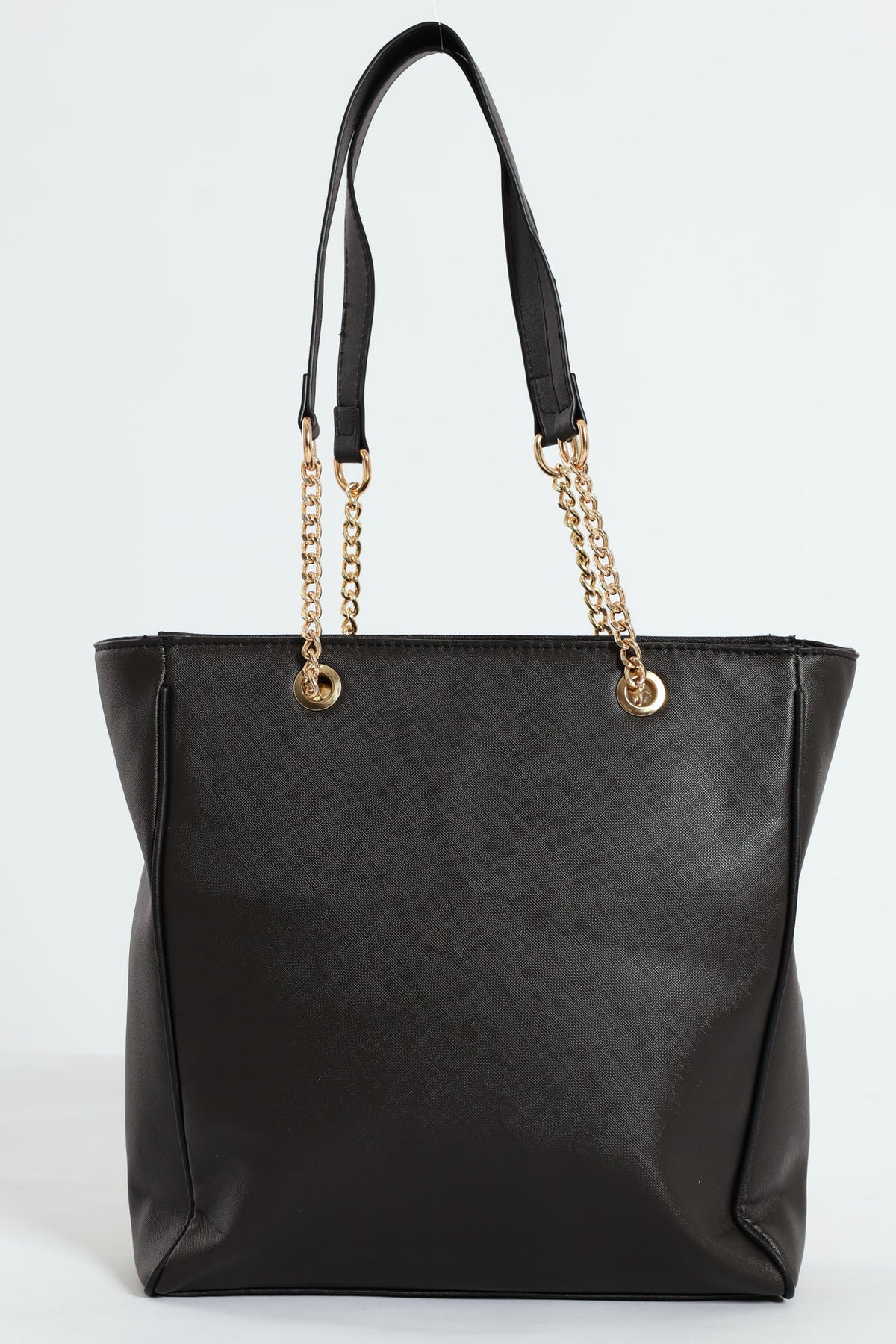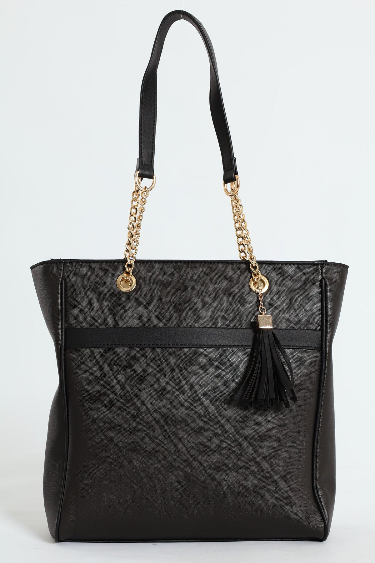 The Chain & Tassel Trim Shopper Bag in black is a chic and versatile accessory that will elevate any outfit. The chain and tassel details add a touch of glamour, while the practical design makes it the perfect bag for everyday use. Carry it with confidence and style.