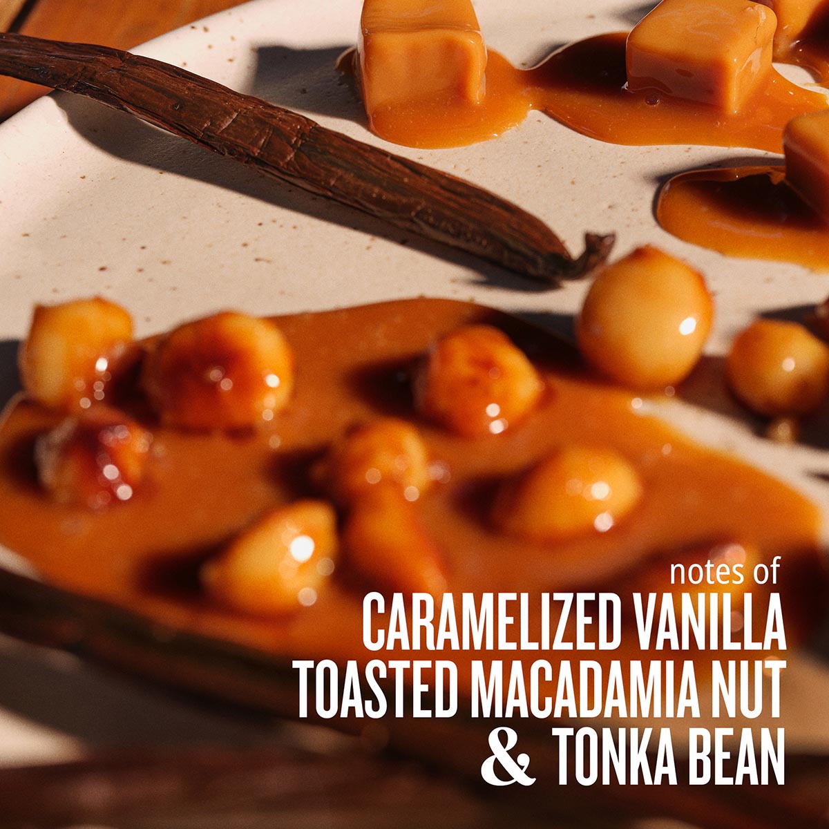 Warm and cozy, this decadent fragrance wraps you up in the comfort of caramelized vanilla drizzled over toasted macadamia nut and rich tonka bean.