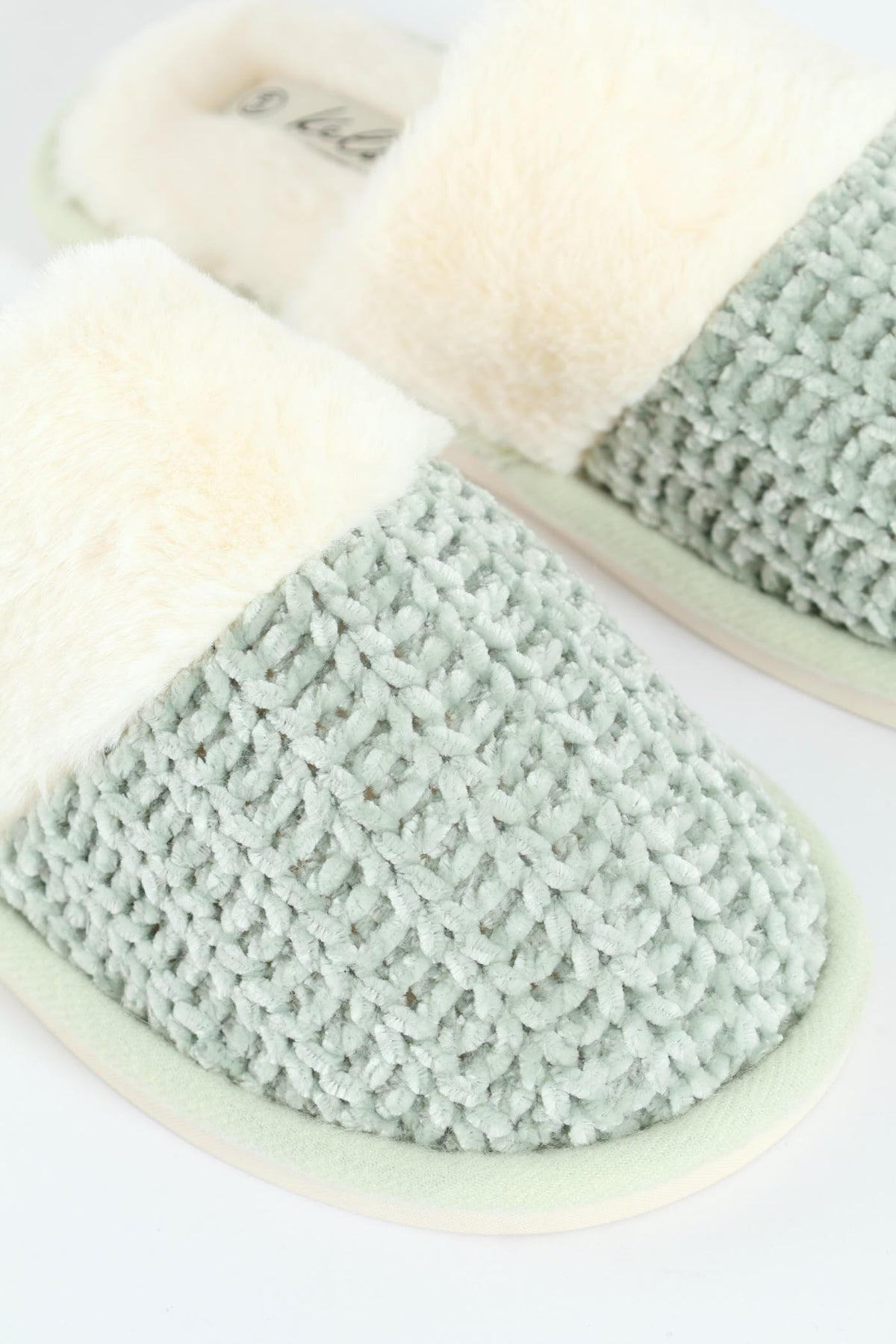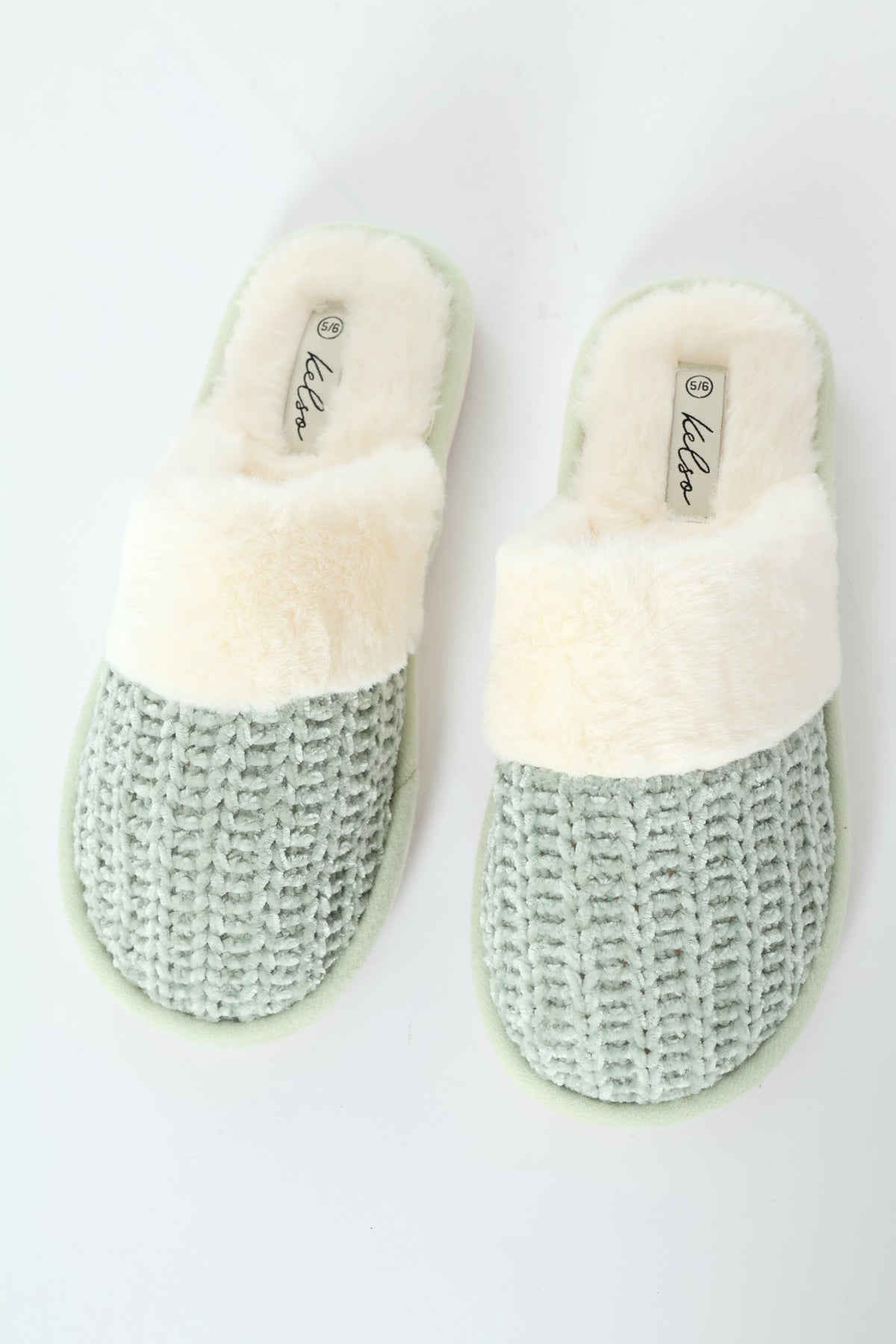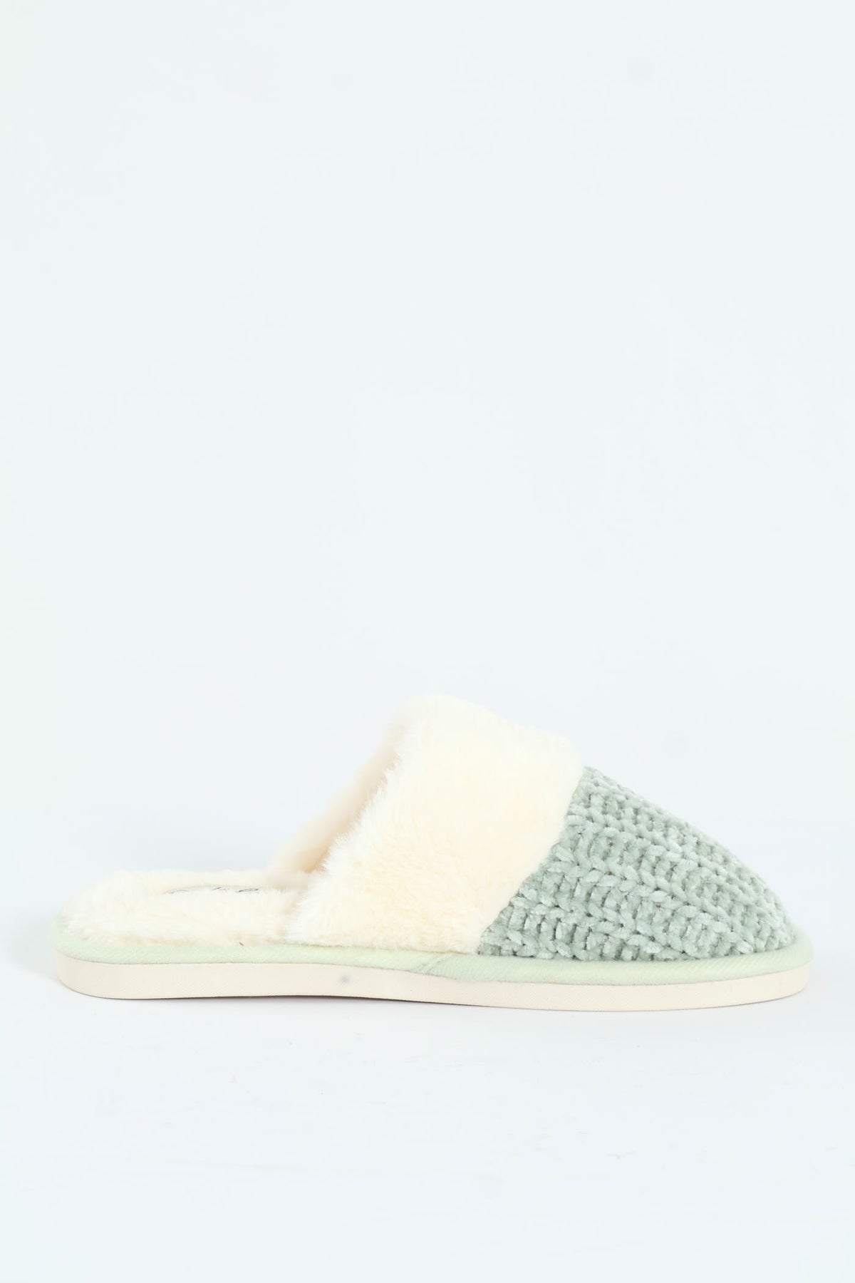 Chenille Closed Toe Slipper With Fur Topline - Sage
