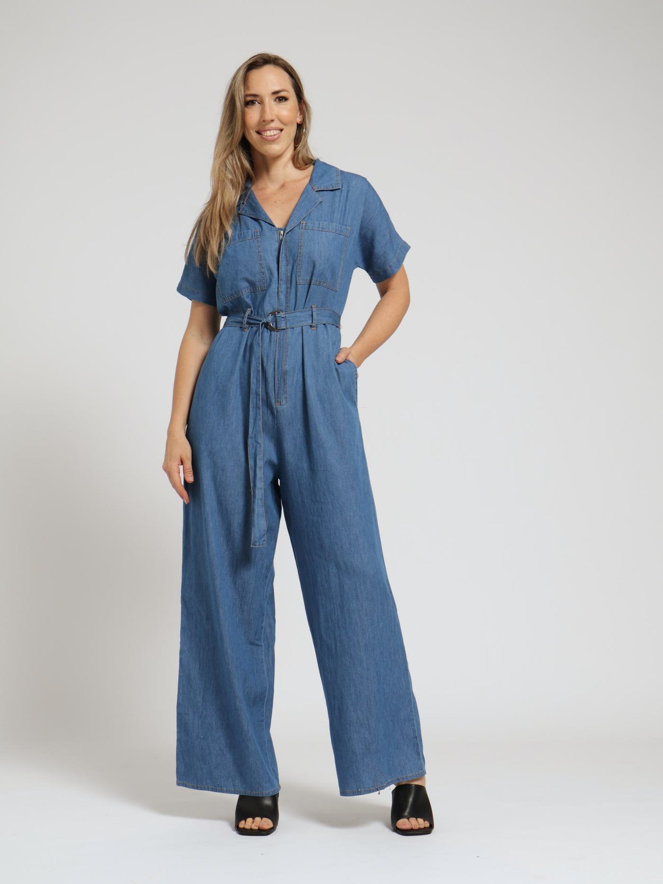 Collared Zip Through Belted Boiler Suit - Medium Wash