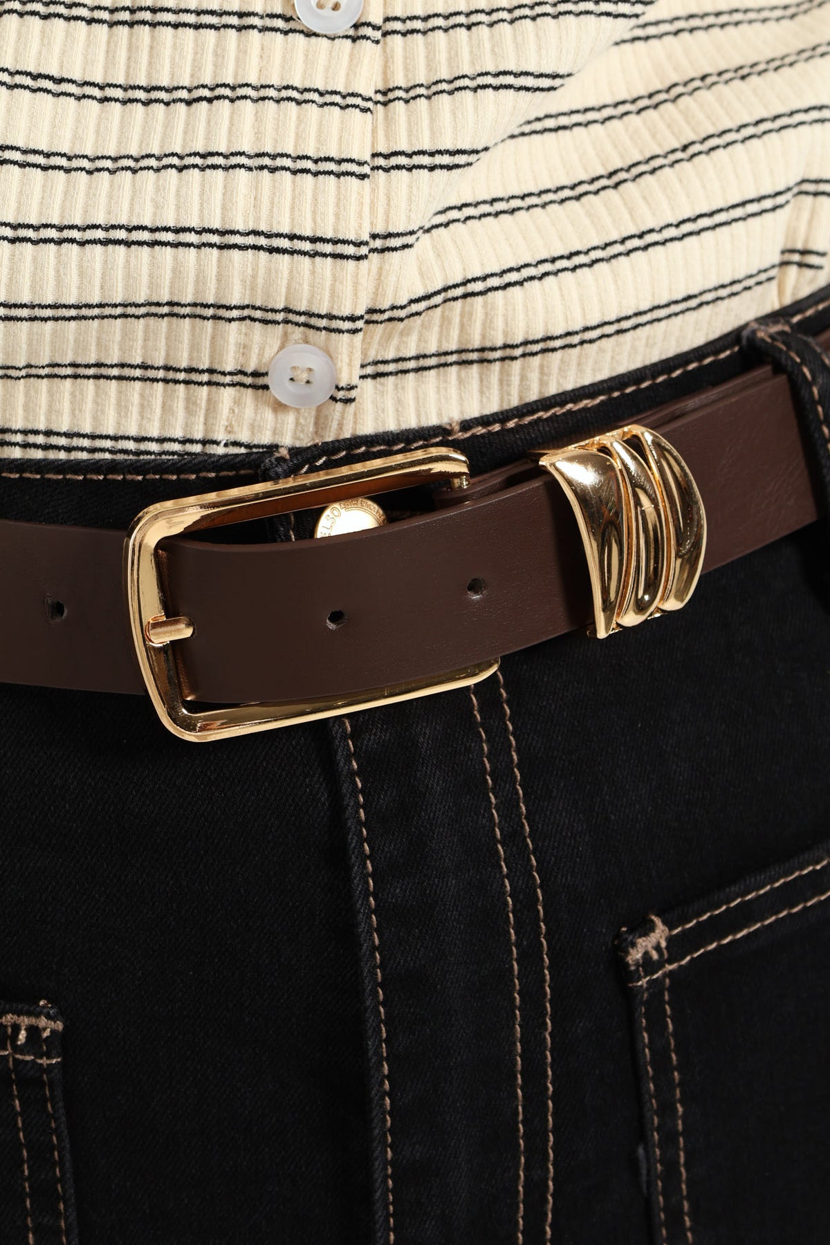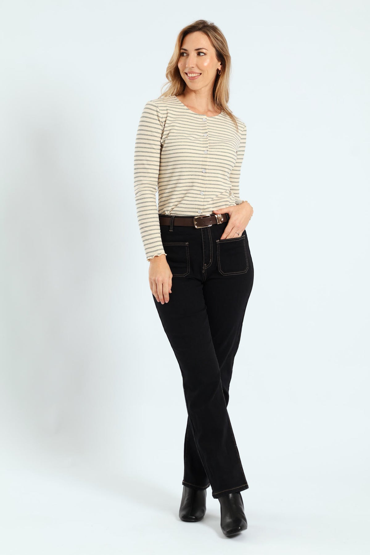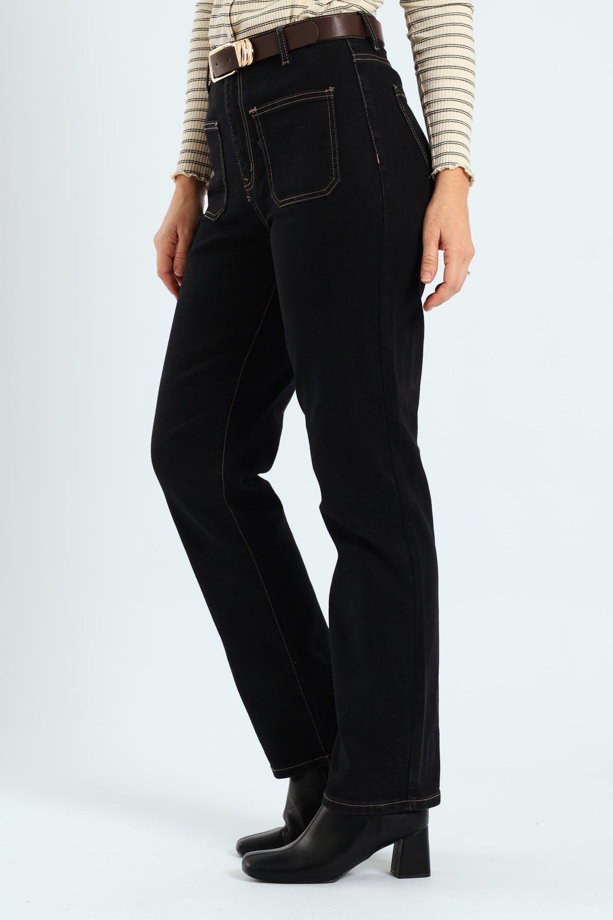 Contrast Stitch Patch Pocket Belted Straight Leg Jean - Black