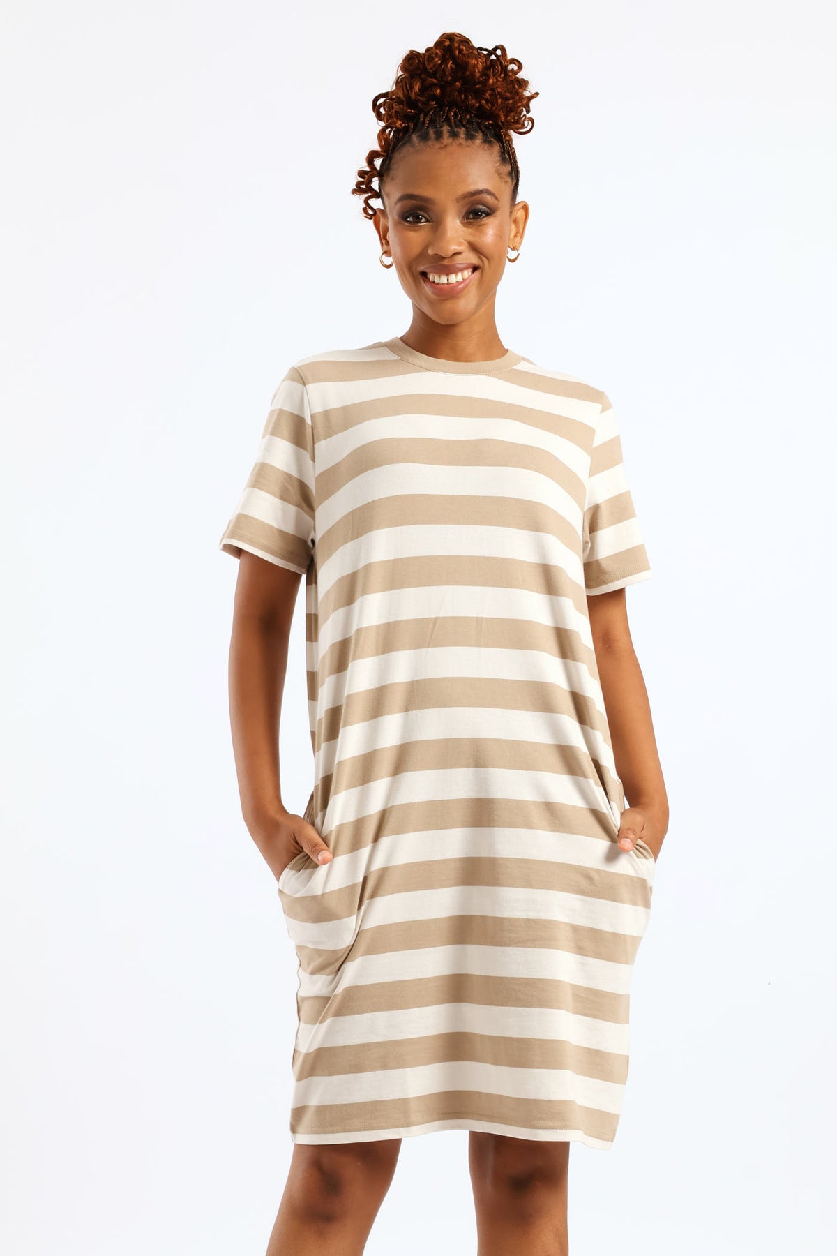 Crew Neck Stripe T-Shirt Dress - Beige/Mocha