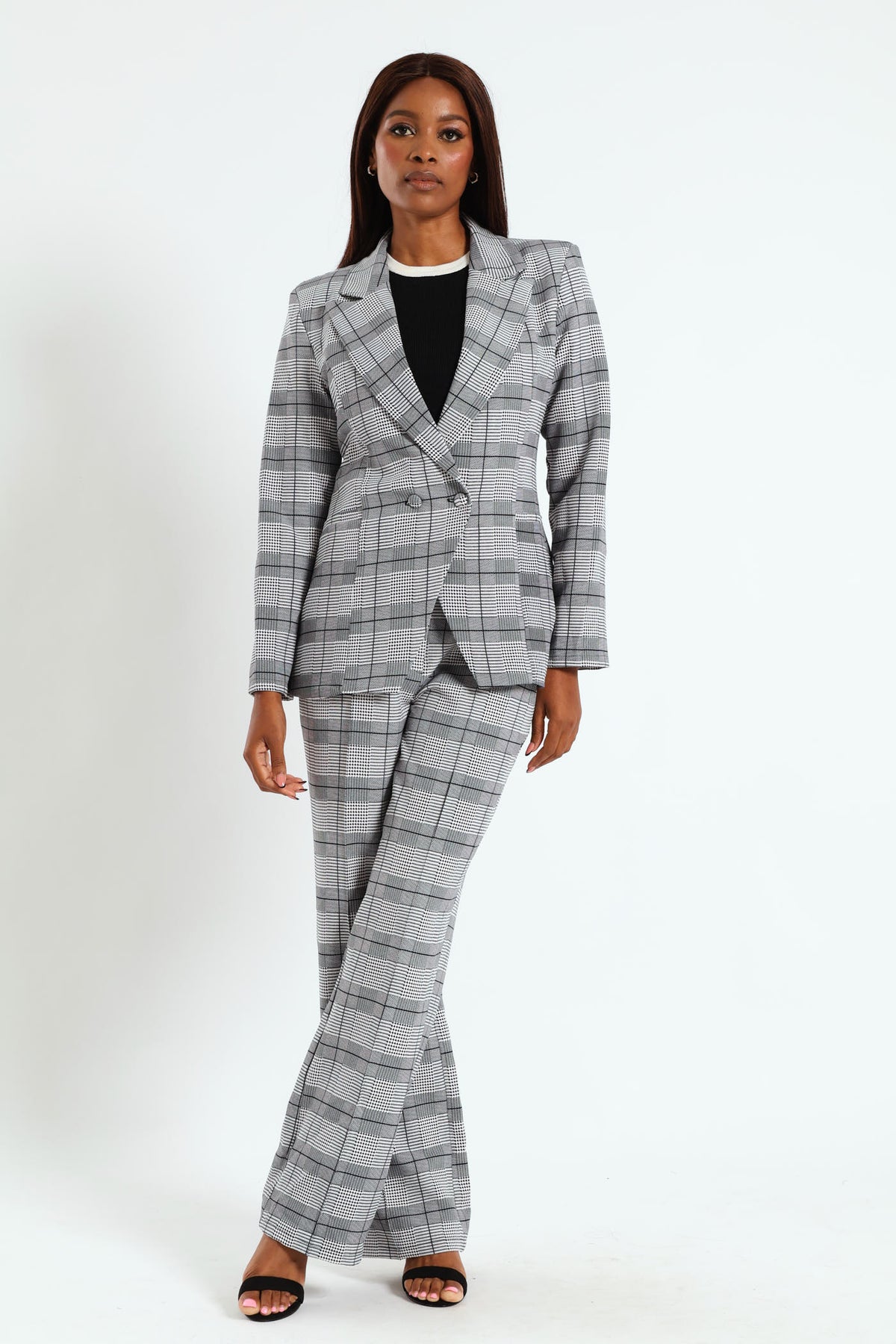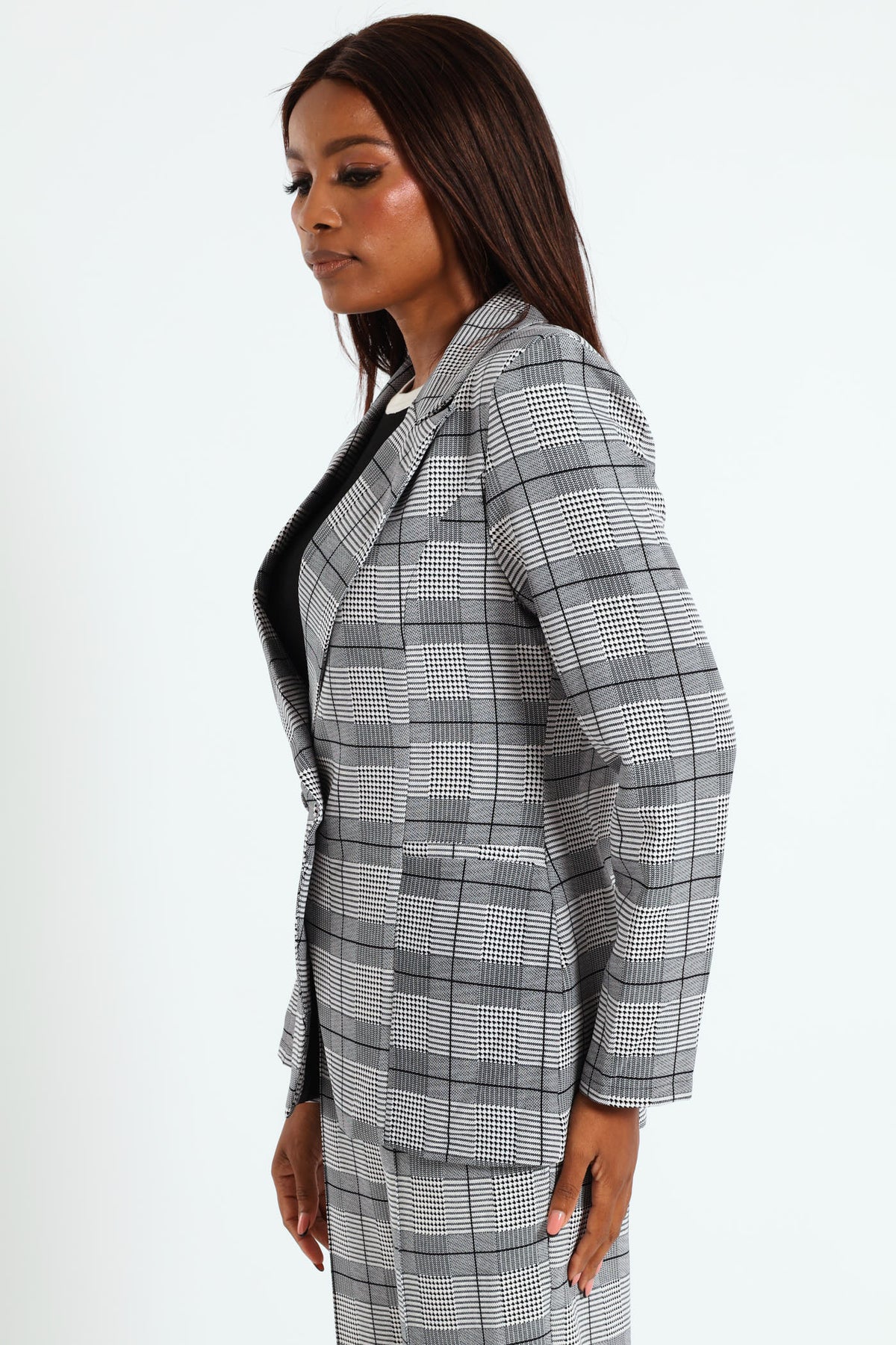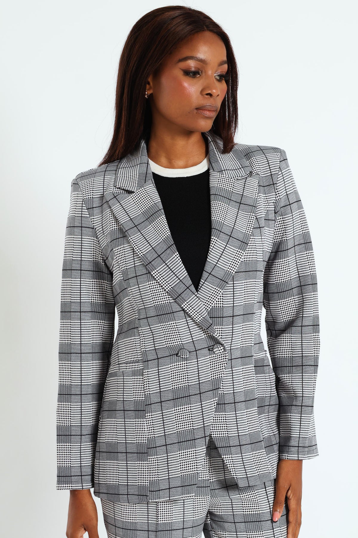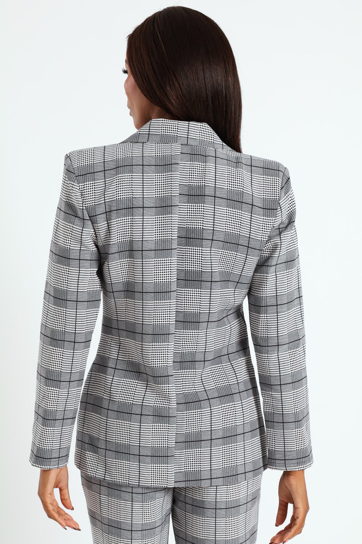 Elevate your style with our Double Houndstooth Check Blazer in grey. This versatile blazer is the perfect addition to your wardrobe, complete with a matching pant for a polished and put-together look. Stand out from the crowd confidently and make a statement with this must-have piece.