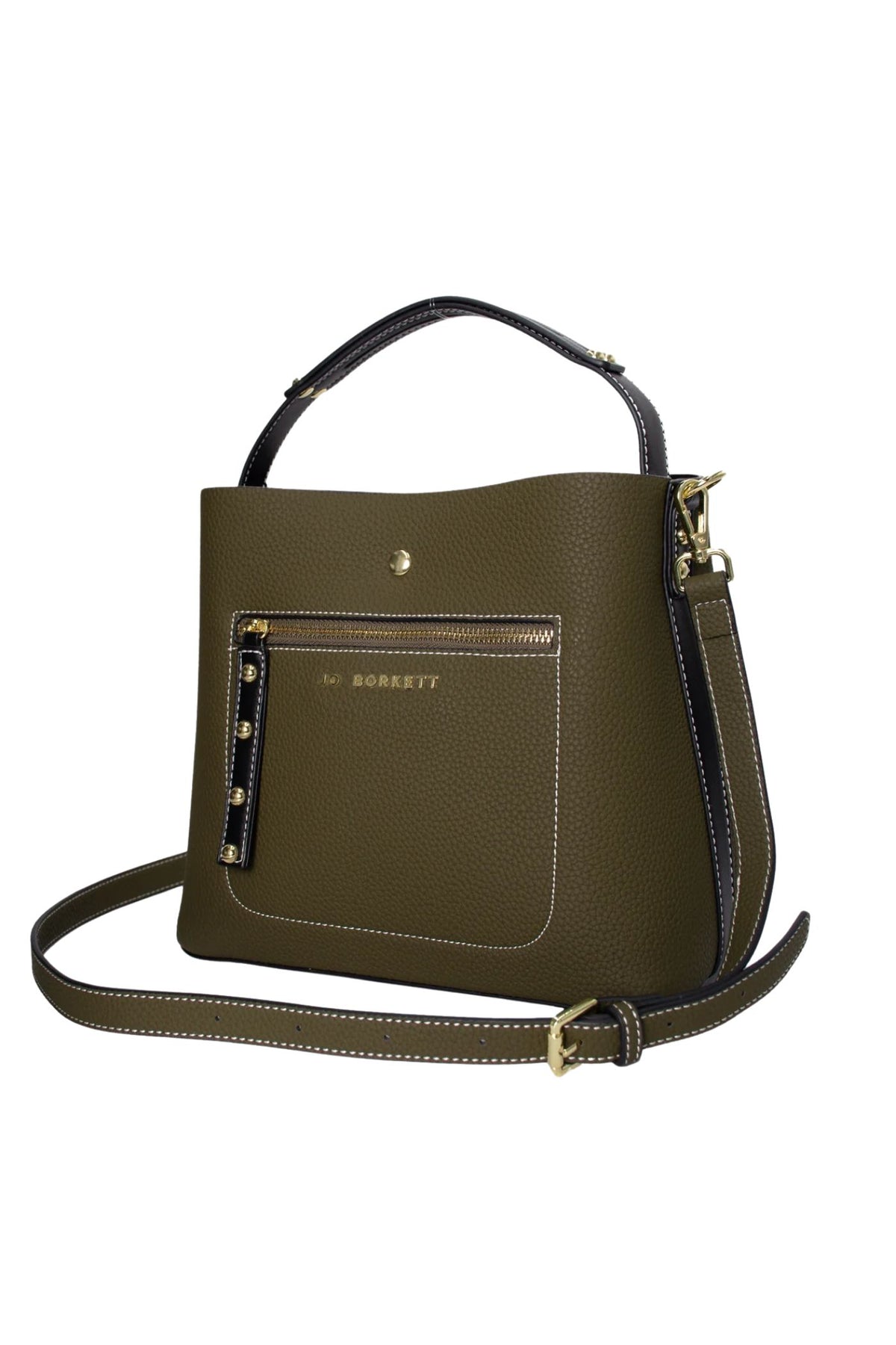 Sophisticated and functional, this popular bucket shape features an elegant contrast strap and studded zip puller. With an exposed metal zip on the front, this bag is both practical and aesthetically pleasing.