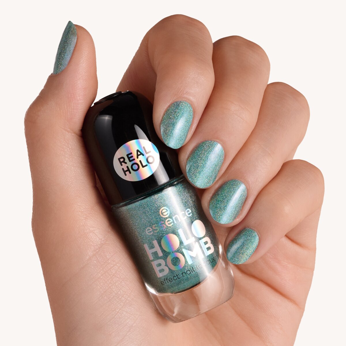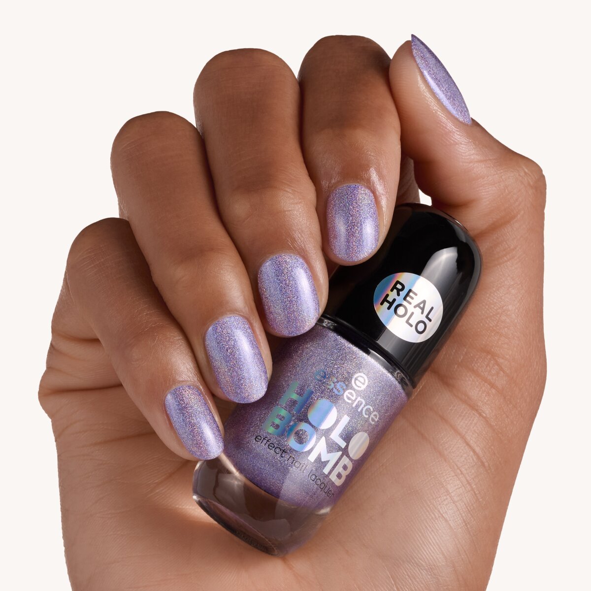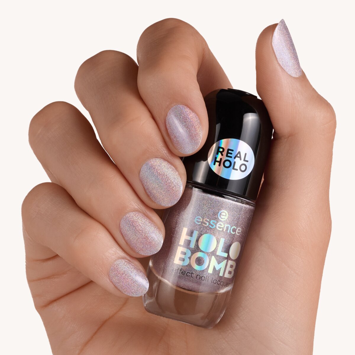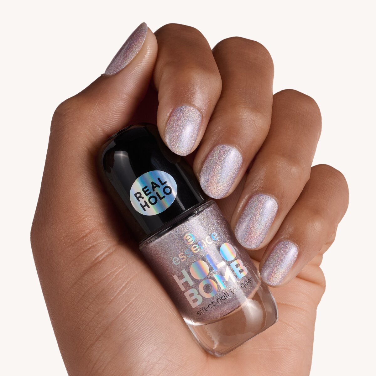 The essence HOLO BOMB effect nail lacquers have a unique finish thanks to holographic pigments that glow in every colour of the rainbow.