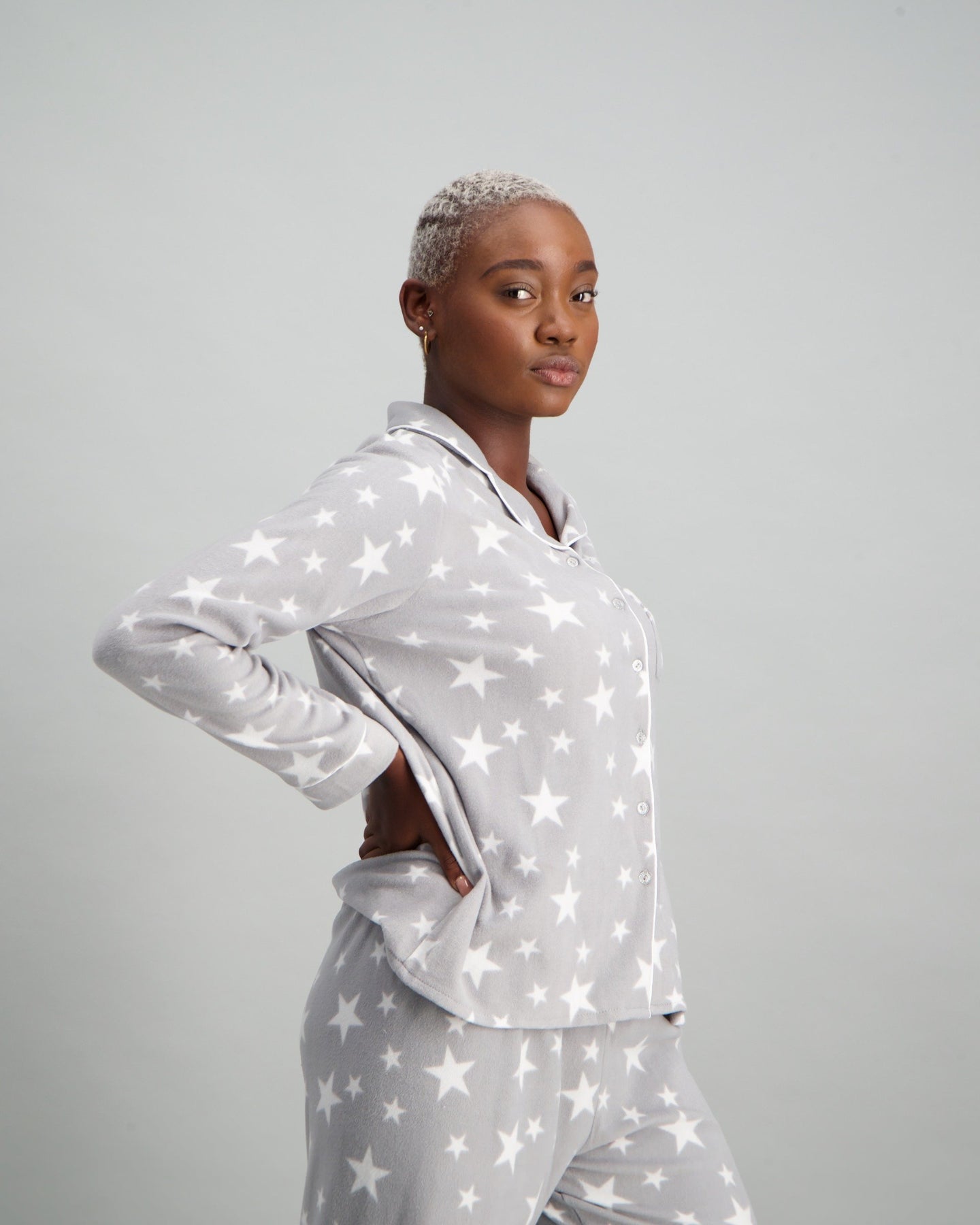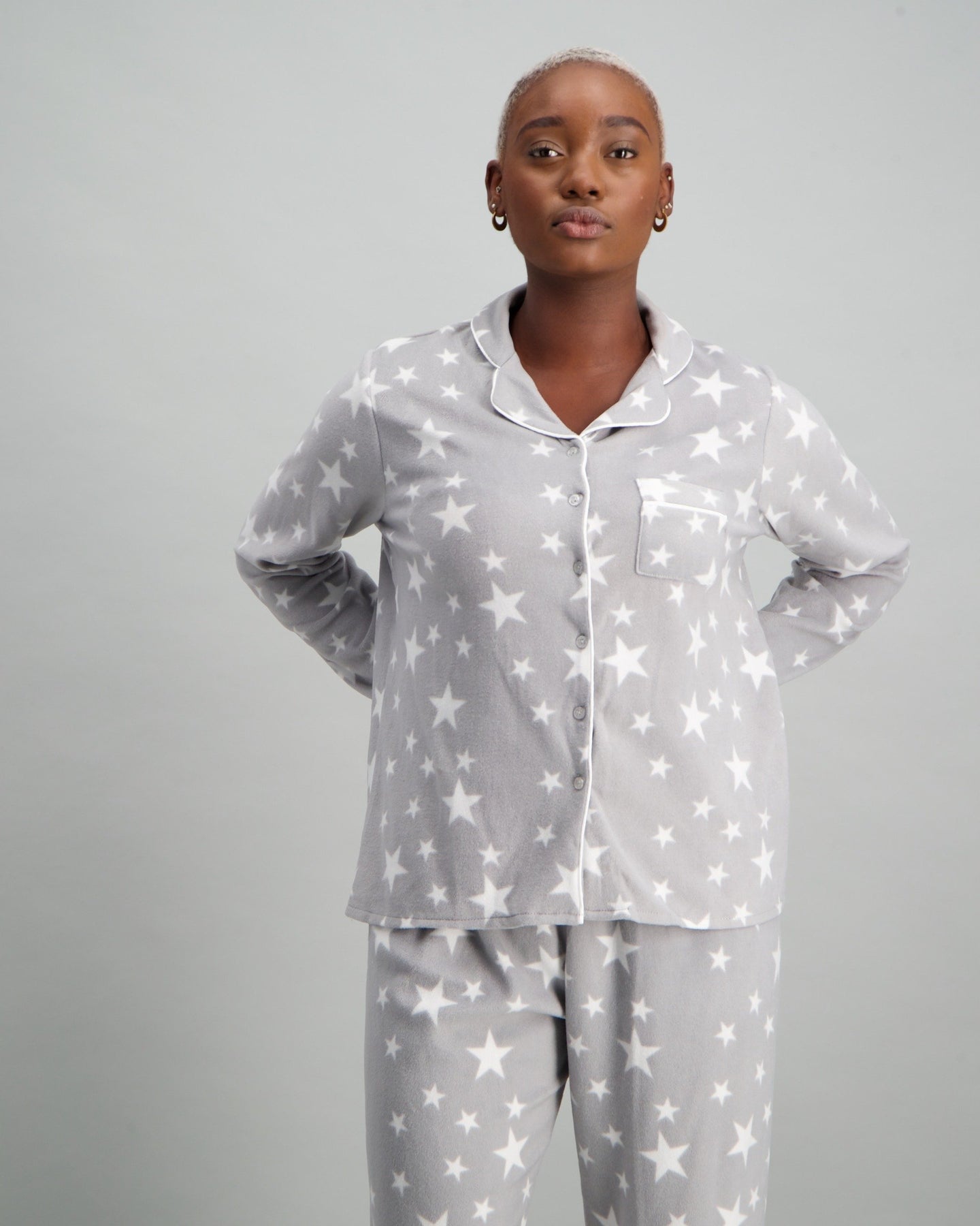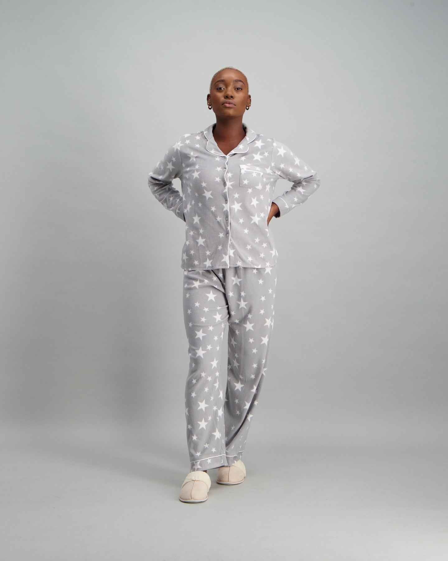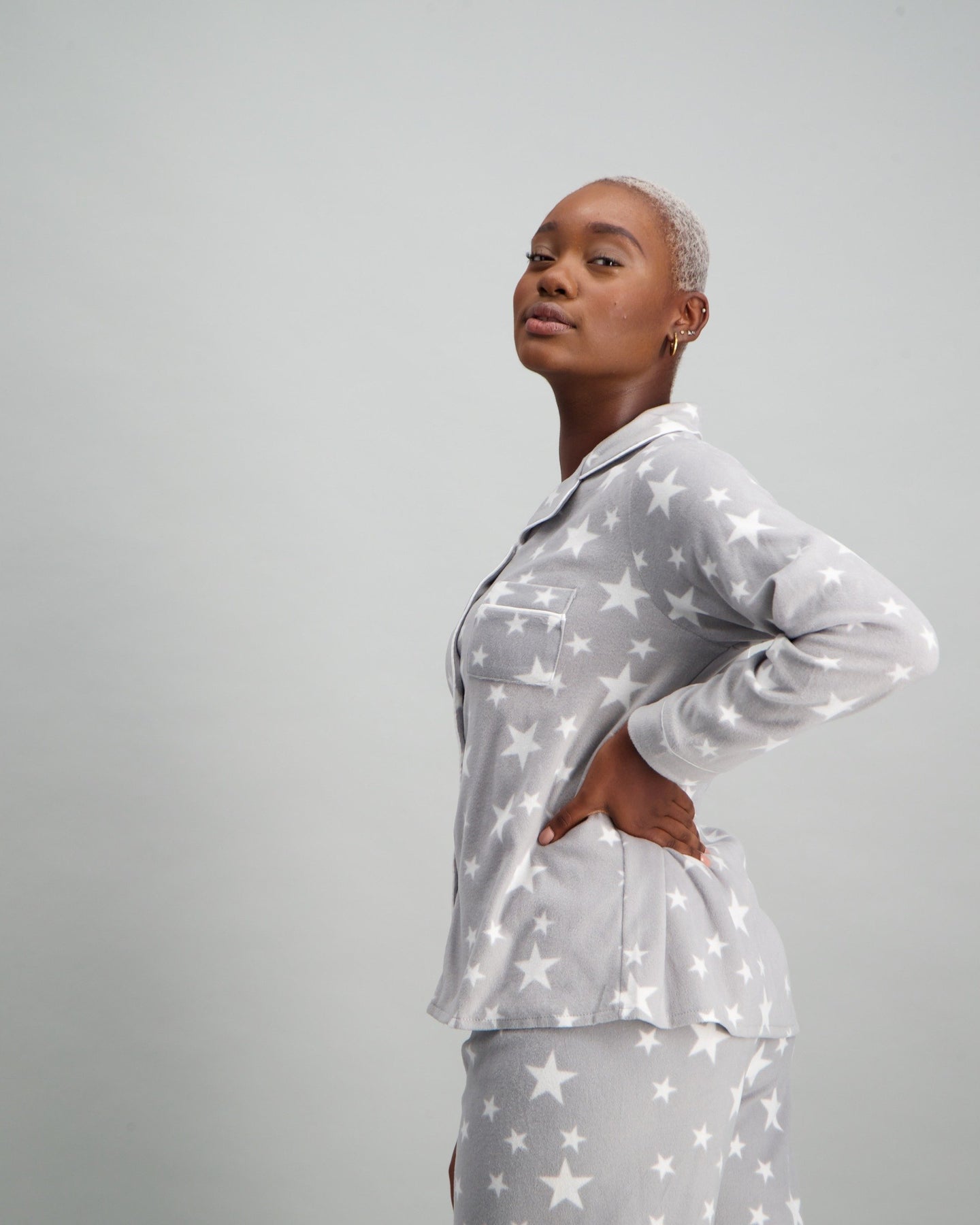 Keep warm this winter with this Grey Butter Fleece Pyjama Set that features a cute all-over star print.