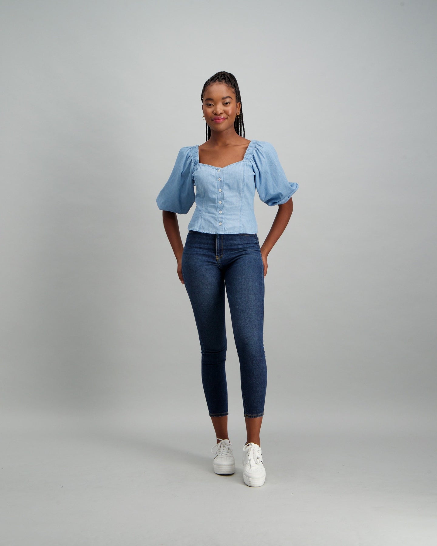 This Button Through Denim Blouse can be easily paired with your favourite pair of jeans and a stylish pair of heels for a fashionable look.
