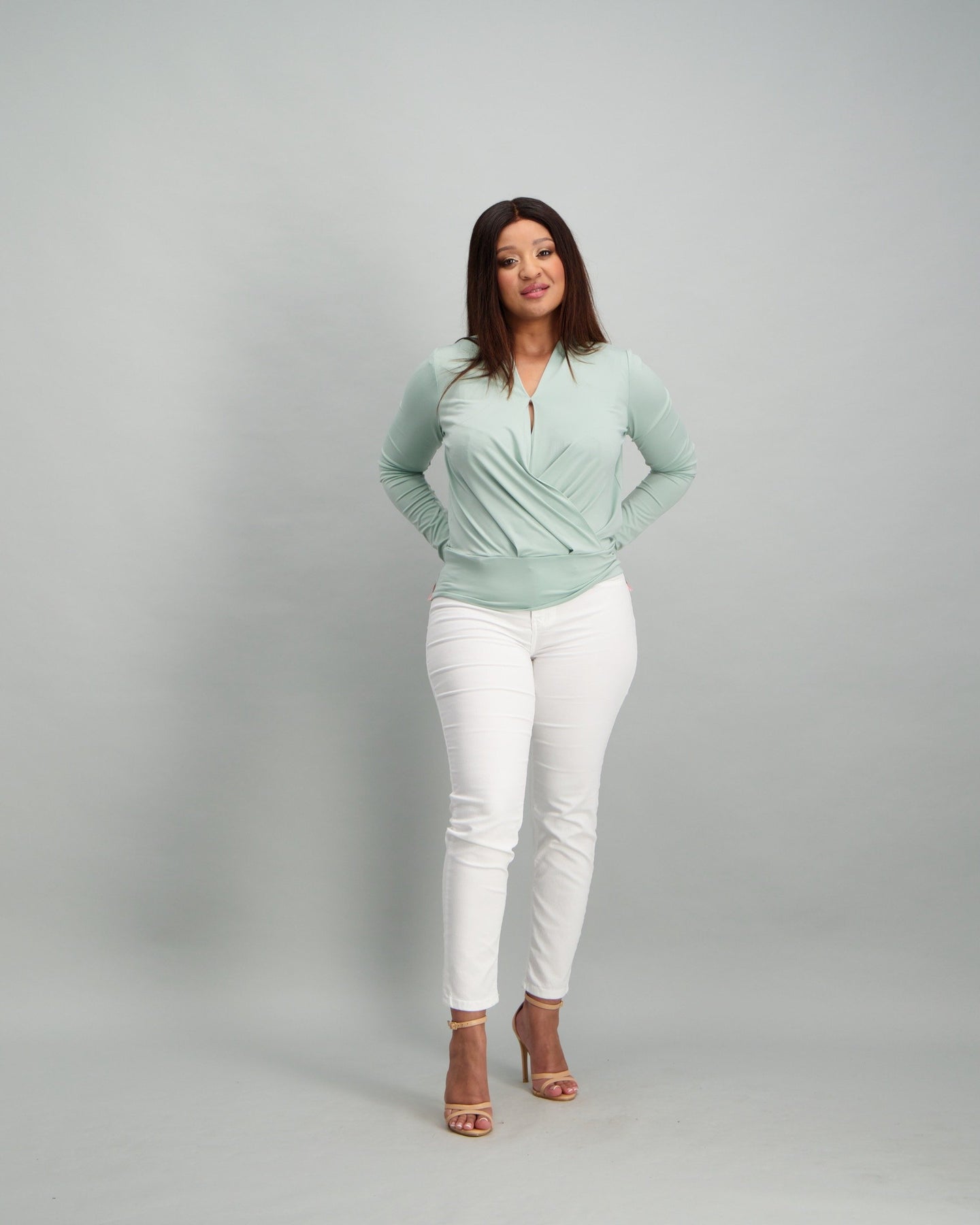 Freshen up your winter wardrobe with this flattering fit top. This romantic long sleeve features a v neckline with a keyhole closure detail, a wrap front design and a cuff hem. Style with trousers and block heels for a chic look.