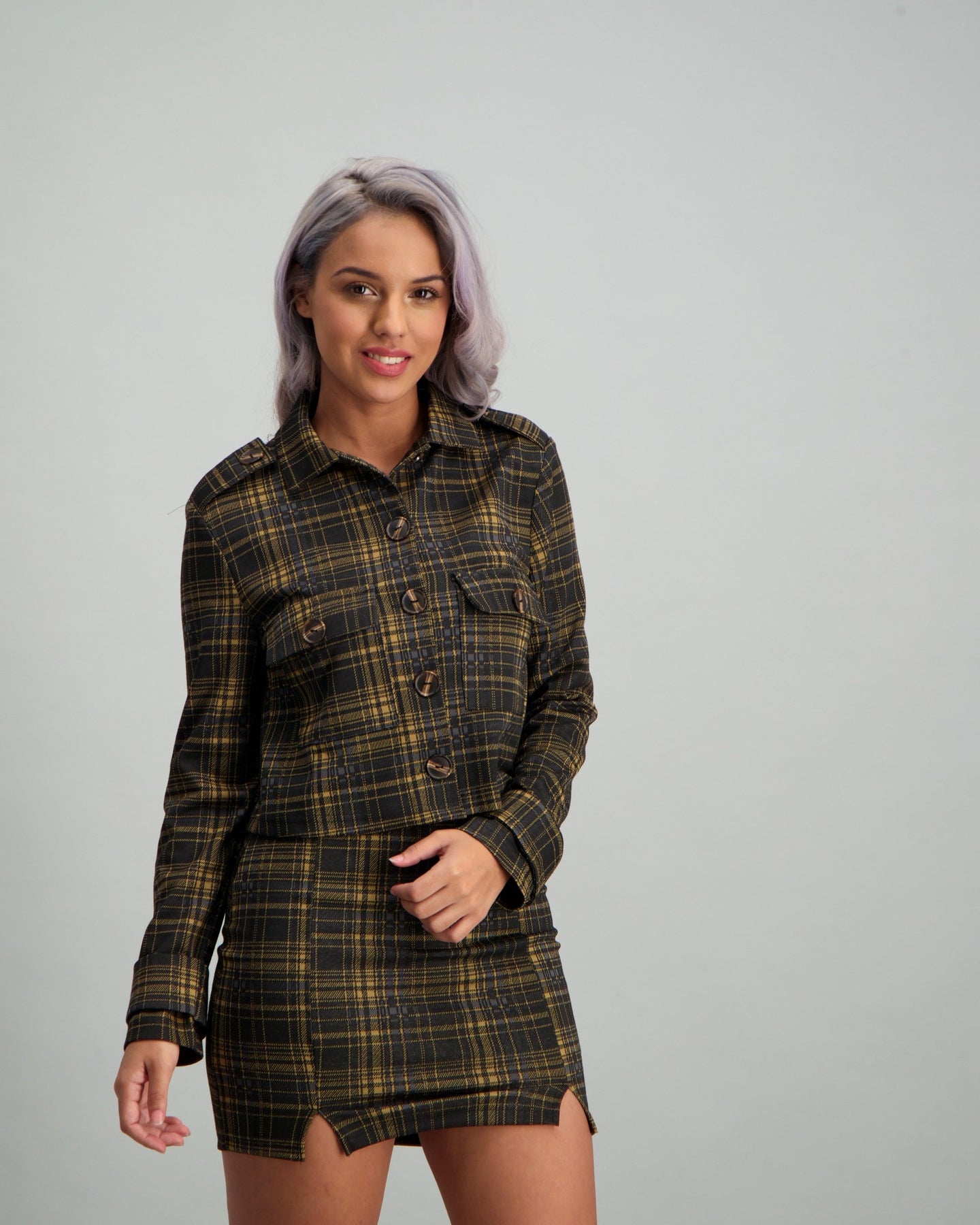 Give your weekend look a preppy vibe with this cropped checkered jacket. Style with faux leather bottoms and boots for an on-trend look.