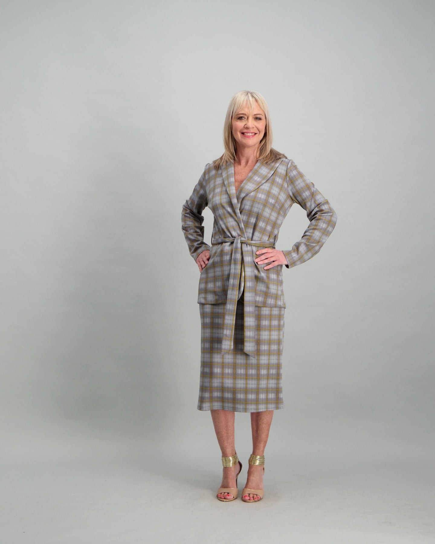 Add this check blazer to your everyday office collection. This removable belted blazer features a notch lapel collar and belt loops. Style over a relaxed fit shirt and the matching pencil with pump heels for a preppy office look.
