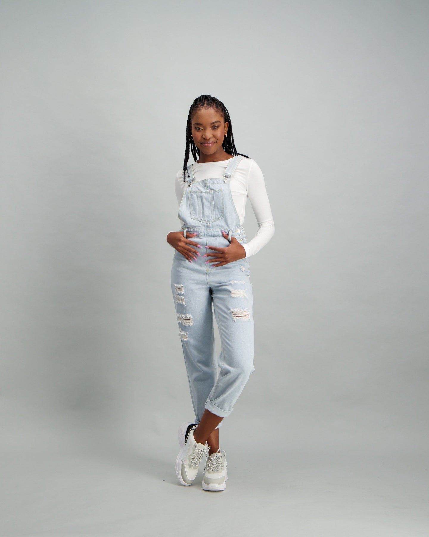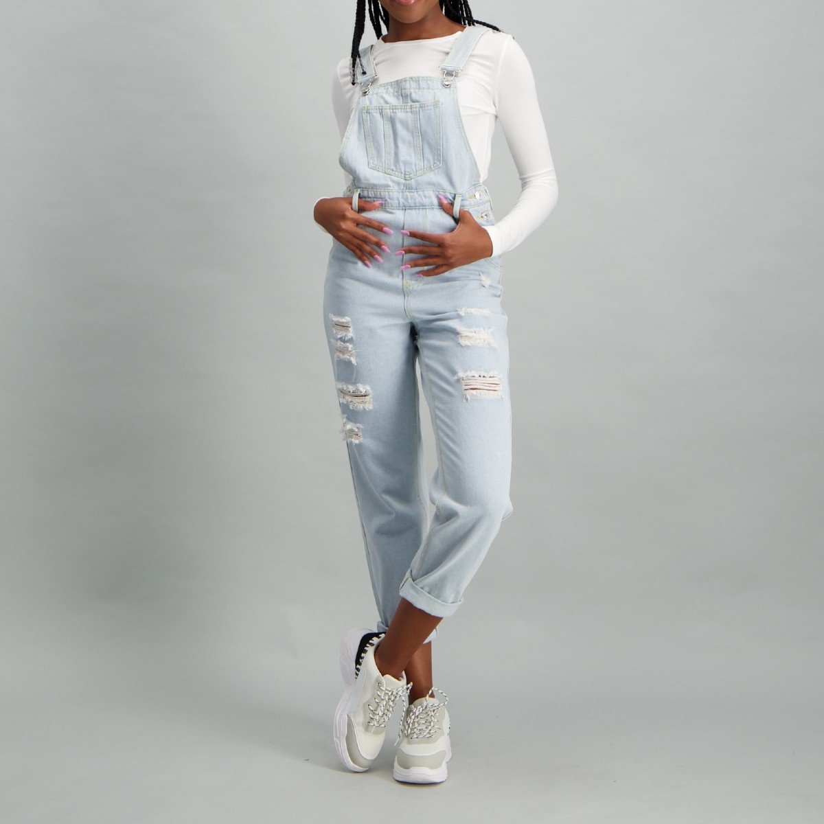 A must have for every casual collection. These 100% cotton ripped dungarees feature the classic clips, a front chest pocket, two lower pockets, and three side button fastenings. Complete with adjustable straps, belt loops and two back pockets. Pair with white chunky sneakers and a solid colour top for an on trend urban look.