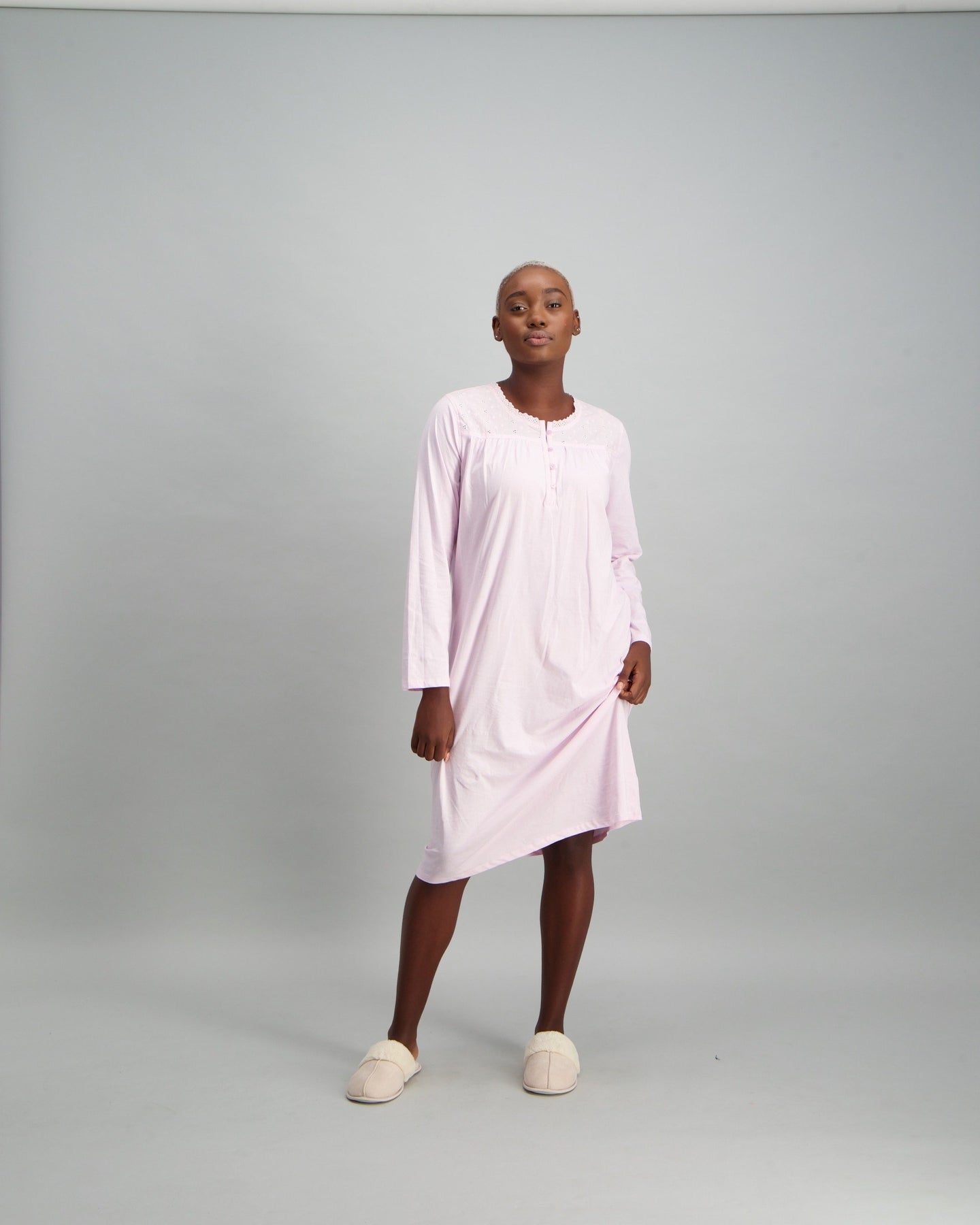 Feel super cosy with this Lilac Long Sleeve Night Dress that features a delicate crochet design along the neck-line.