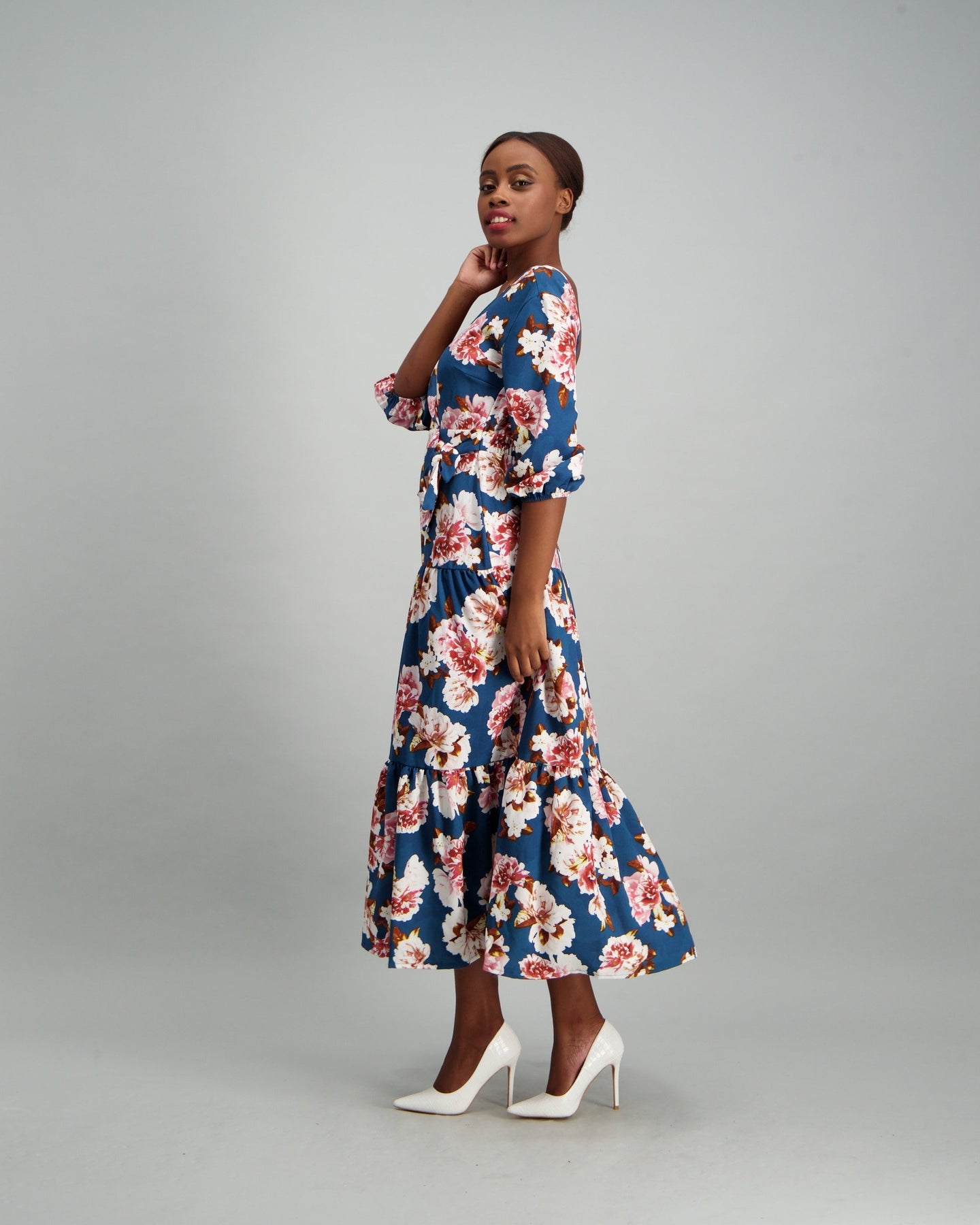 Ladies Long Sleeve Open Backed Tiered Dress - Floral Print