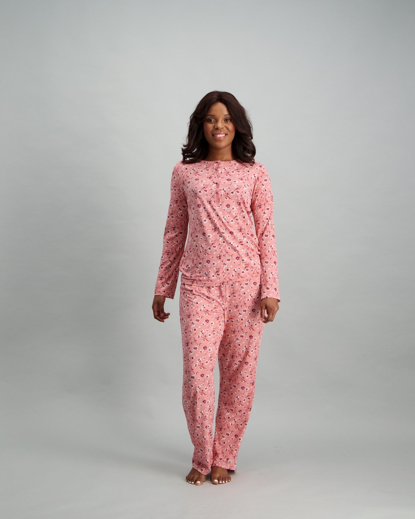 Snuggle up in our feminine long sleeve floral top. Pair this buttoned front tee with the matching bottoms and fluffy slip on shoes.