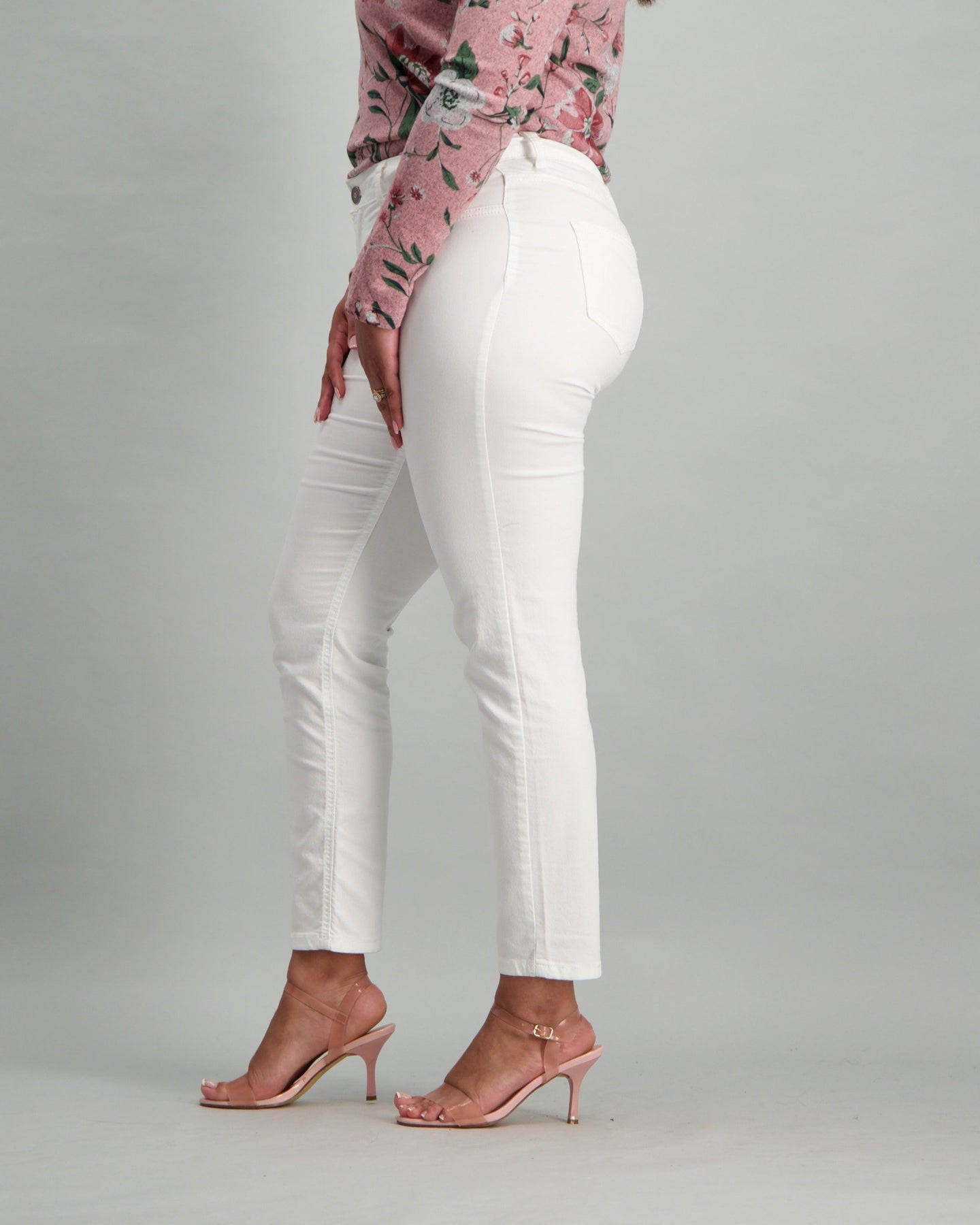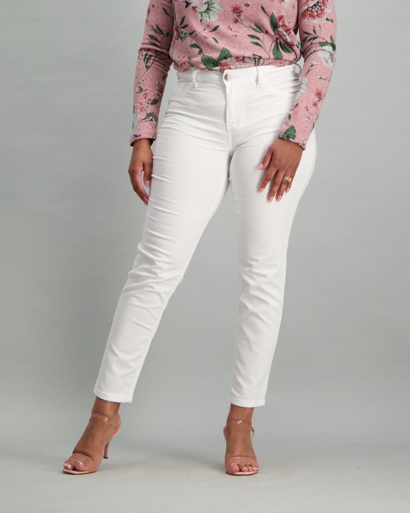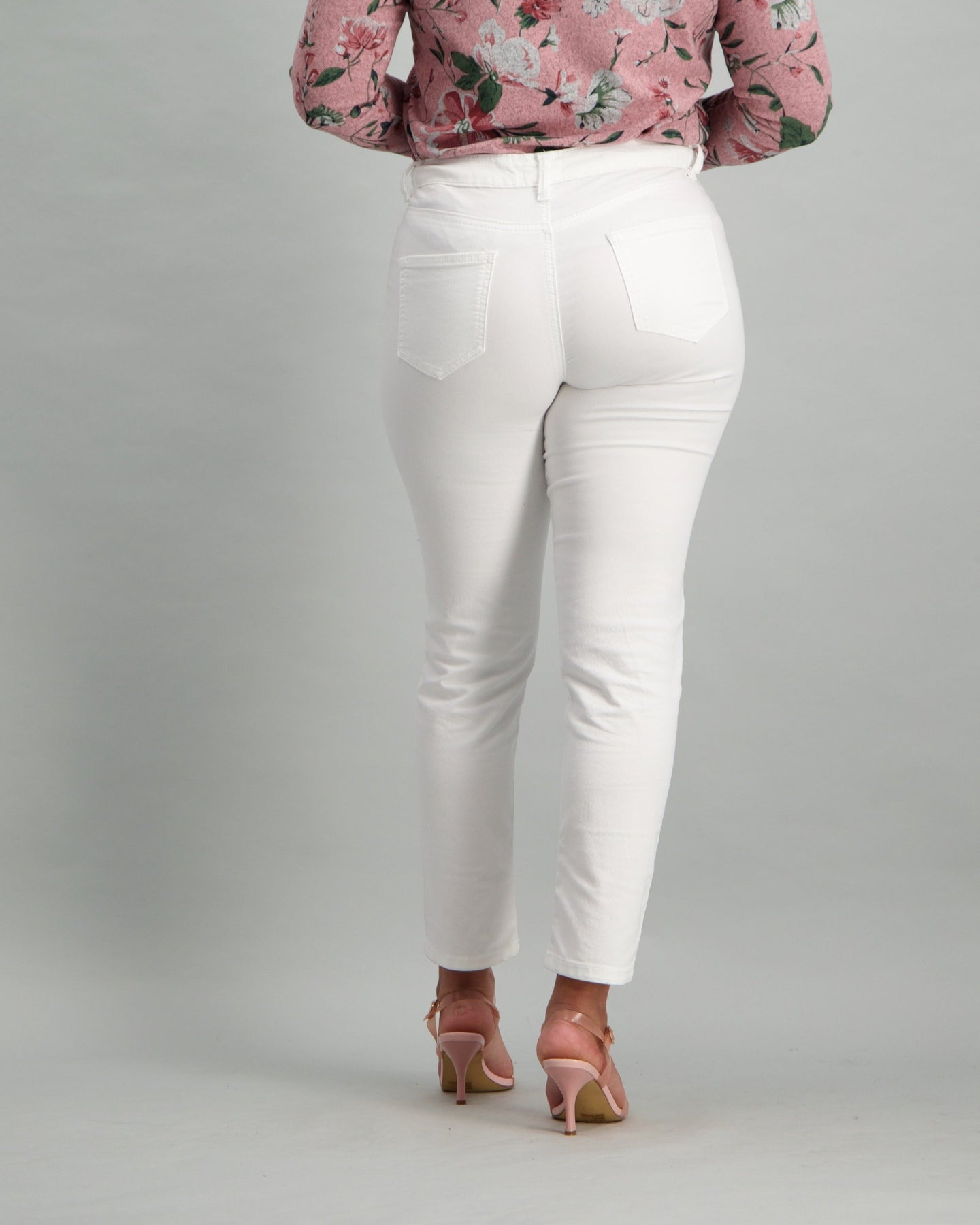 Swap out your jeans for these stretchy pants. These basic regular fit bottoms feature two back pockets, a front zip and button. Pair with a stripe tee and mules for a classic parisian style.