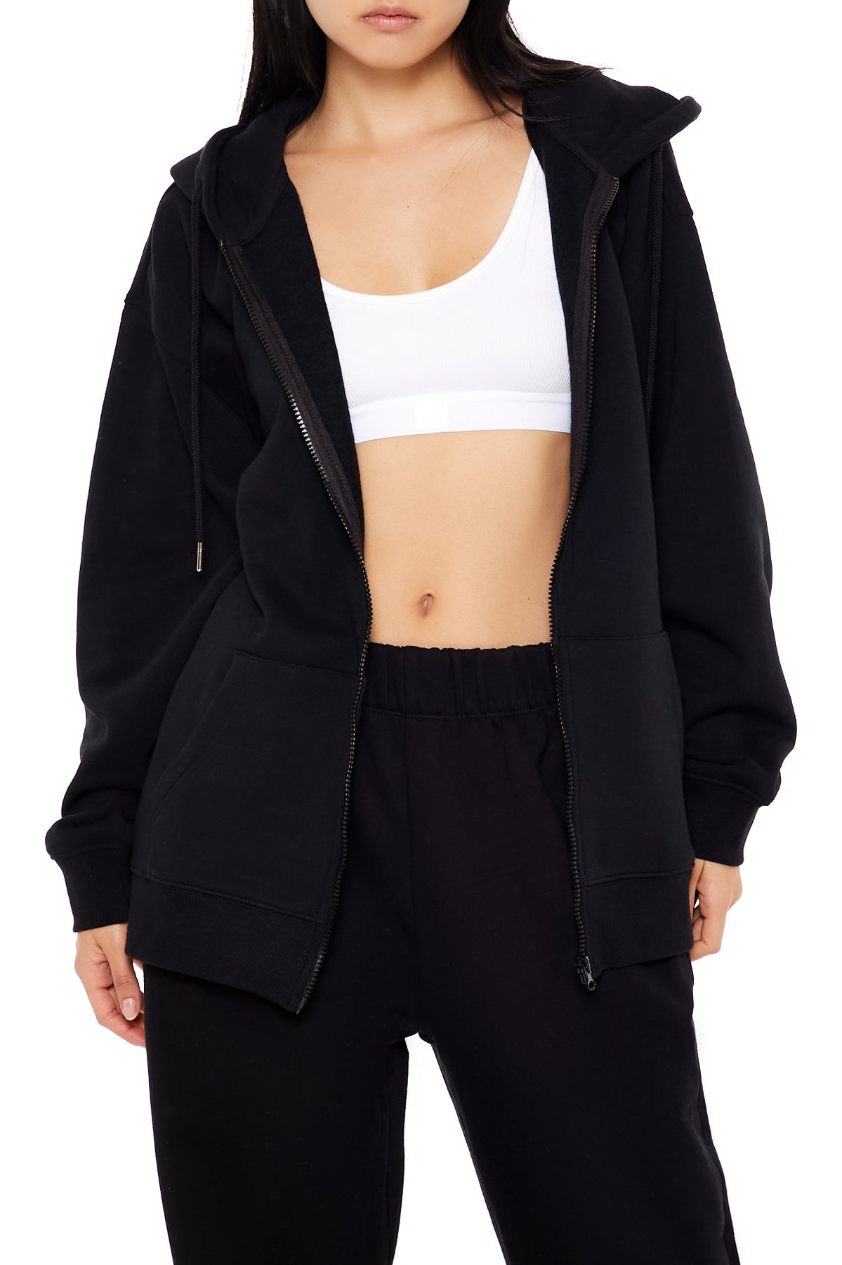 A fleece zip-up hoodie featuring dropped long sleeves, a drawstring hood, split kangaroo pocket, and an oversized fit.