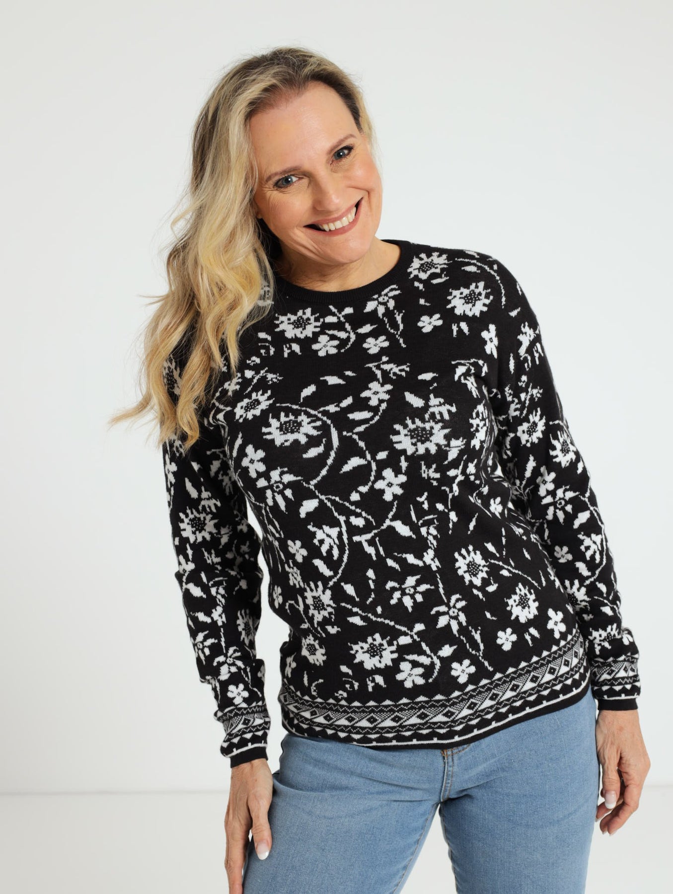 Floral Print Jacquard Knitwear - Black/White