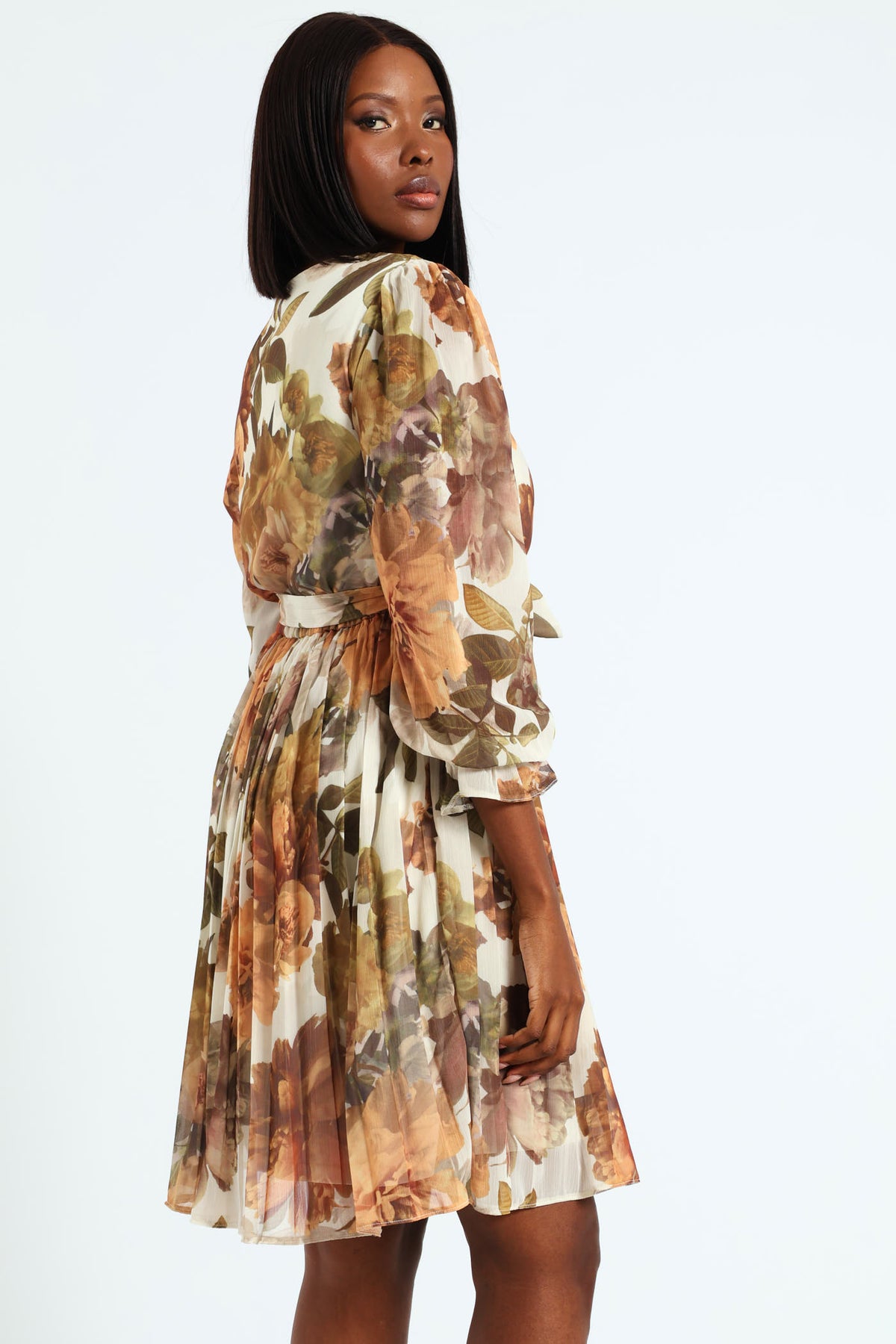 Front Key Hole Detail Pleated Tea Dress - Brown