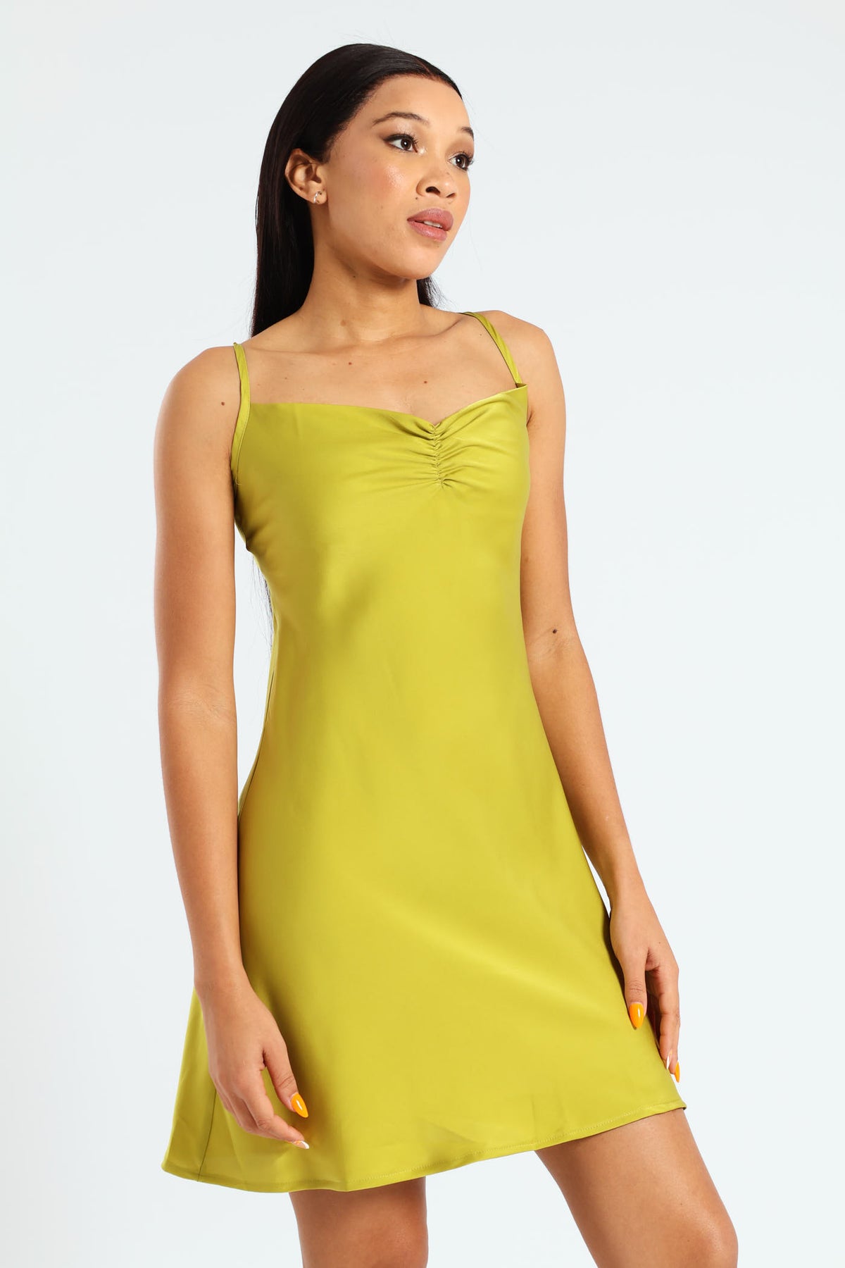 Gathered Front Satin Chemise With Tie Back - Chartreuse