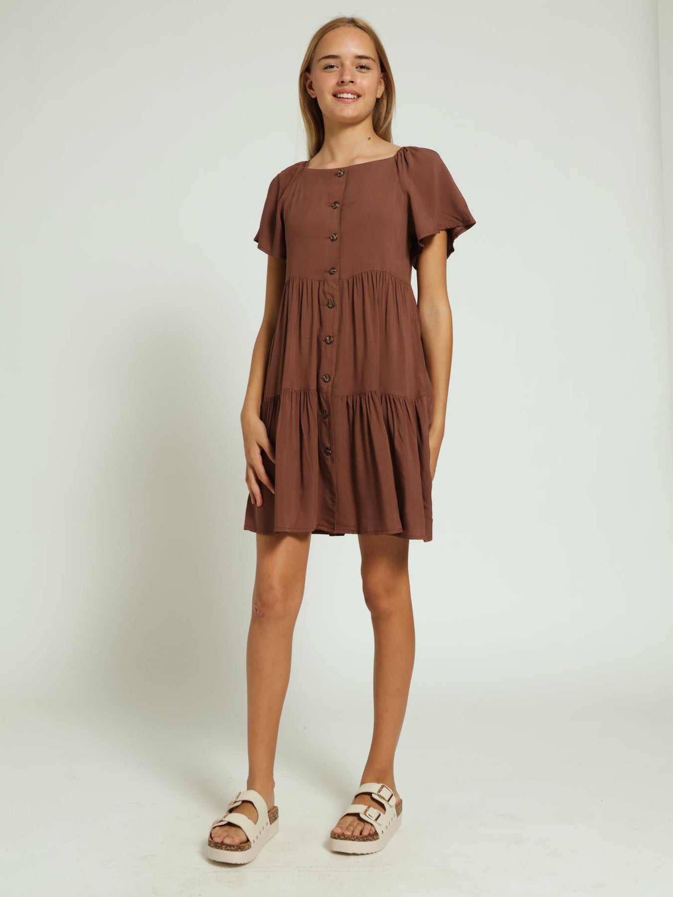 Girls Button Down Dress - Brown