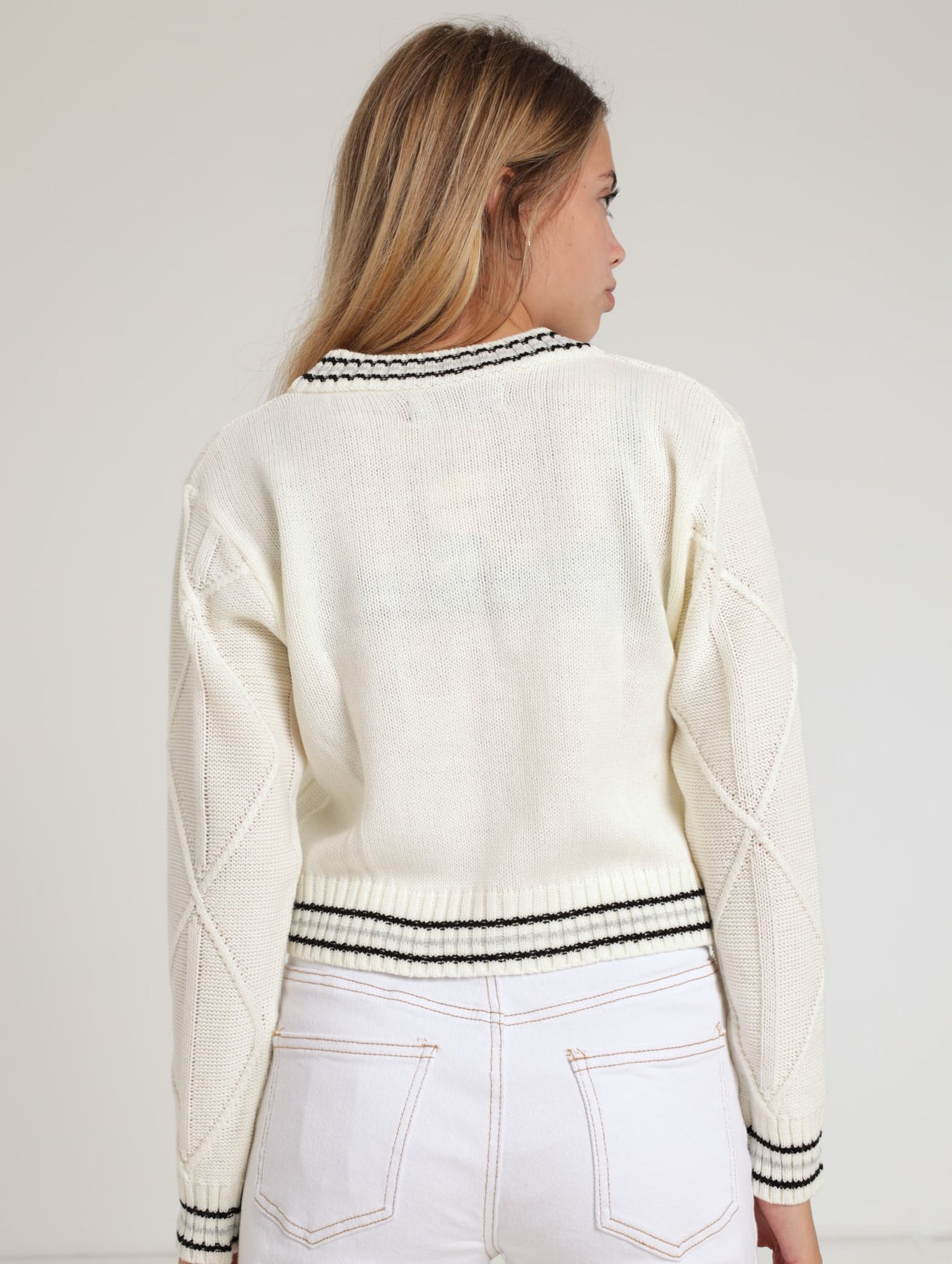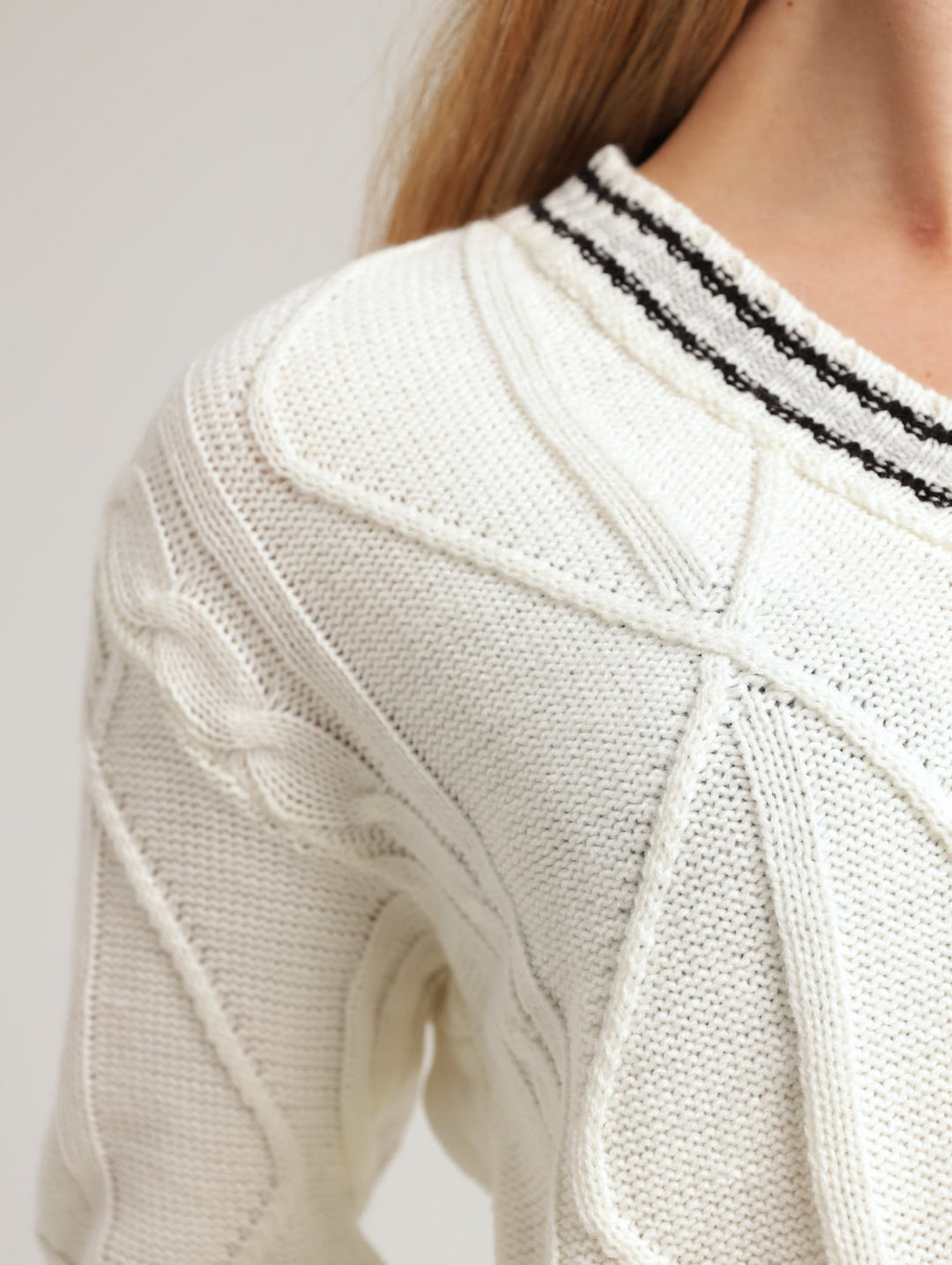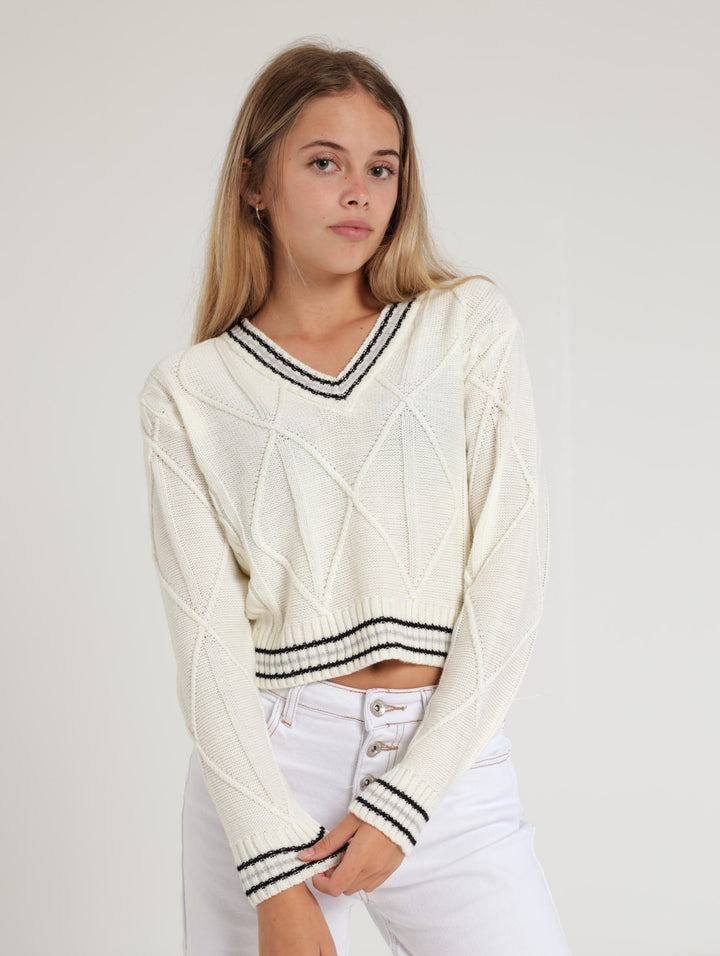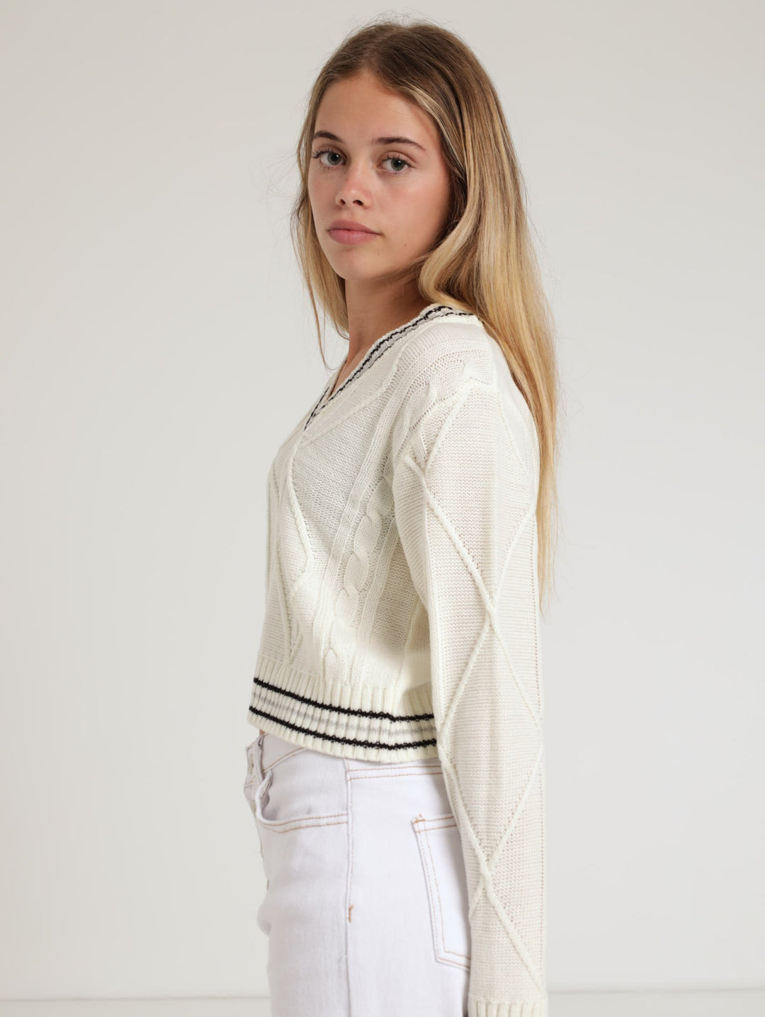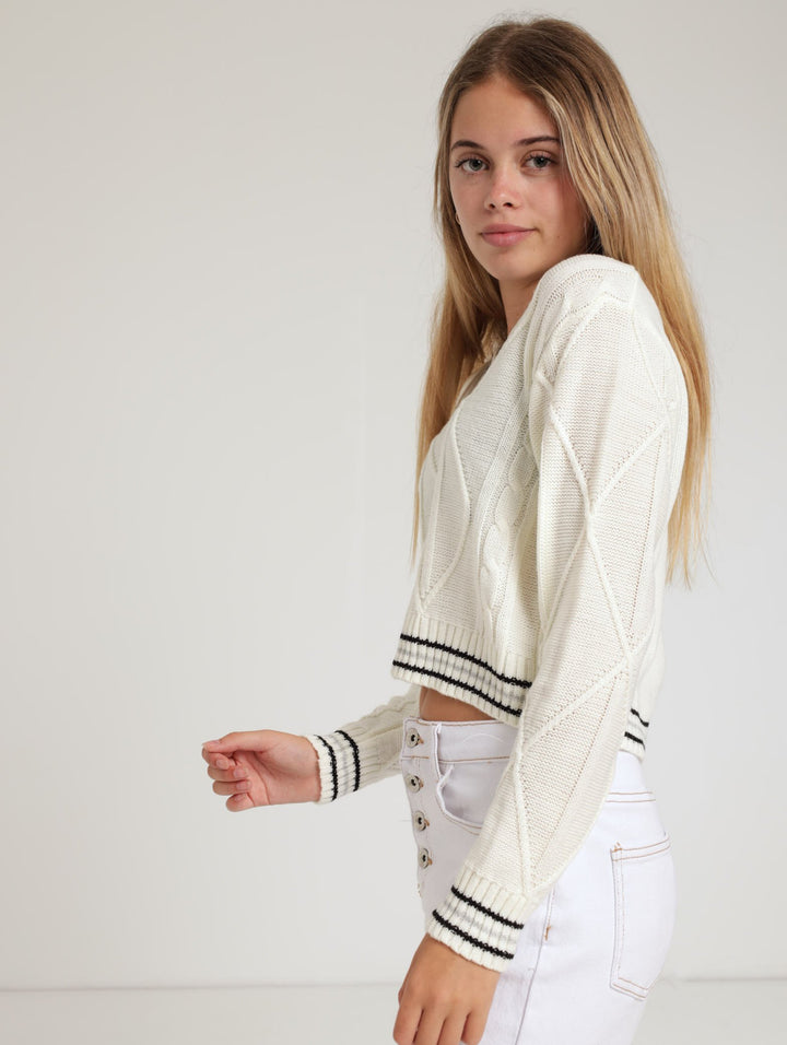 Girls Cable V-Neck Pullover - Cream