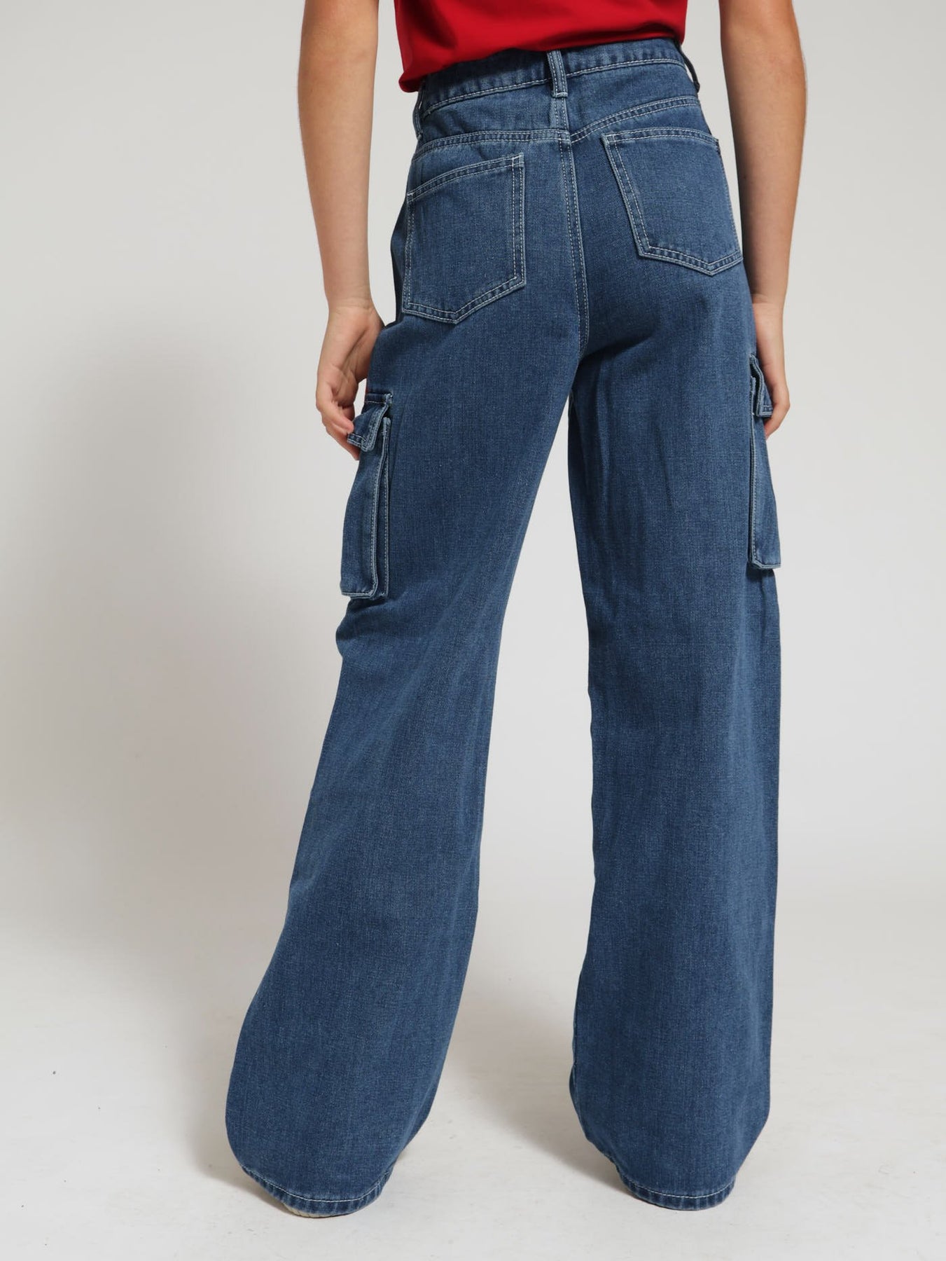 Girls Cargo Wide Leg Denim Jeans - Mid Blue