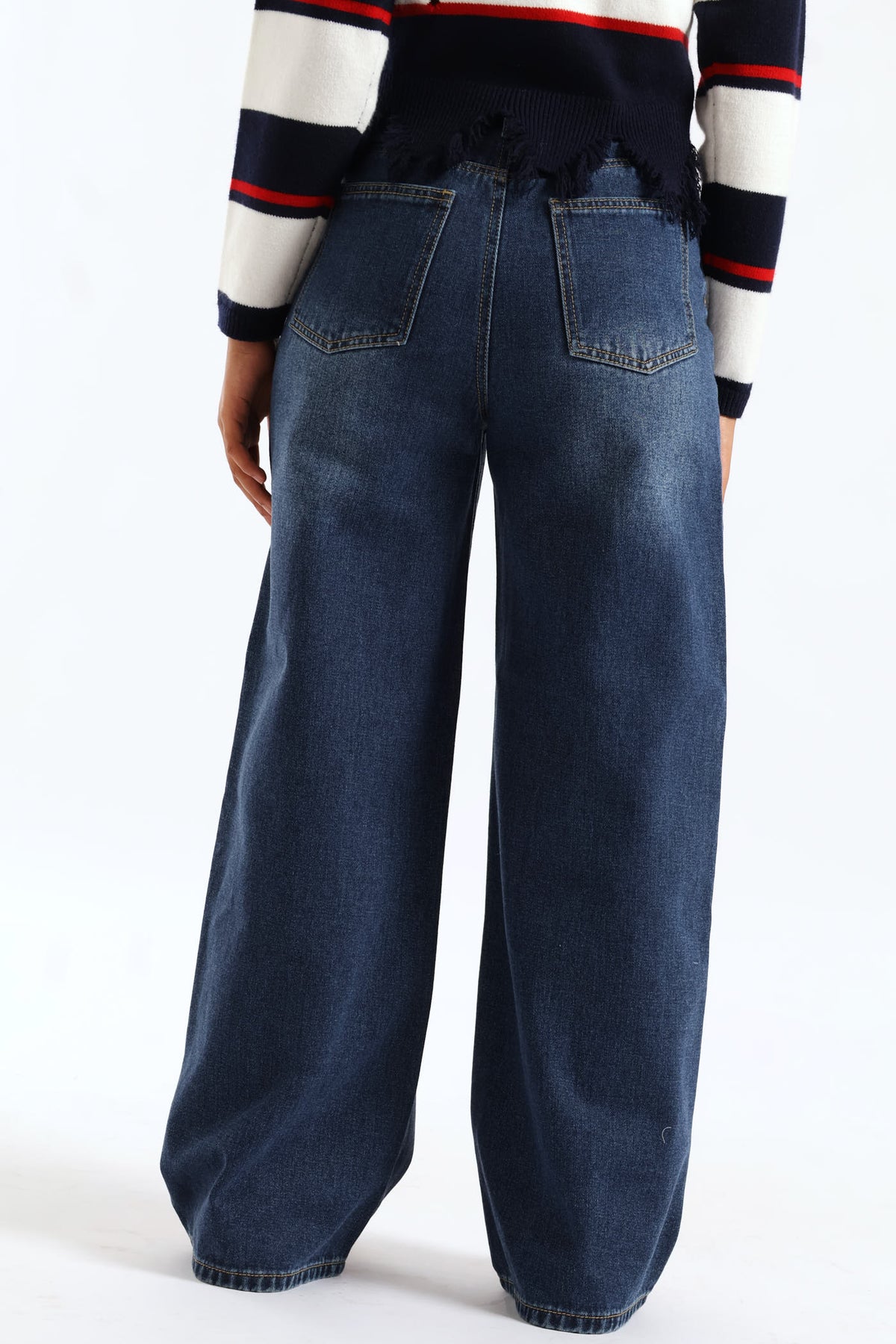 Girls Double Waistband Wideleg Denim Jean - Dark Blue
