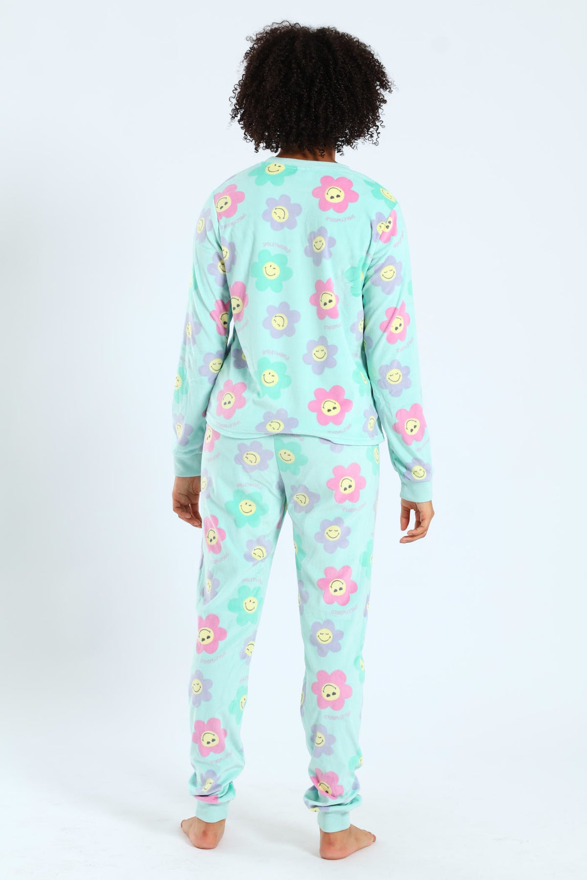 Girls Smiley Print Long Sleeve Sleep Set - Aqua Mist Green