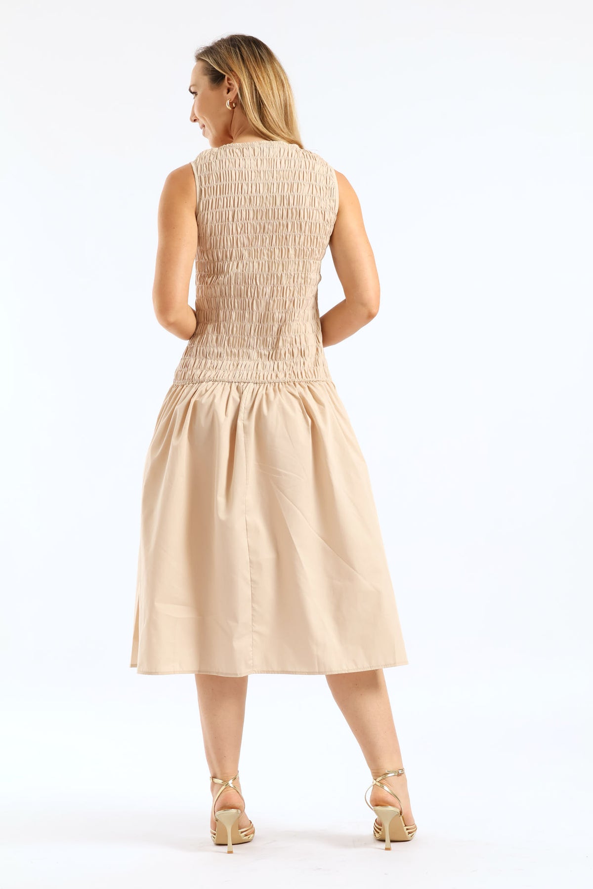 Hi-Neck Shirred Drop Waist Midaxi Dress - Light Stone