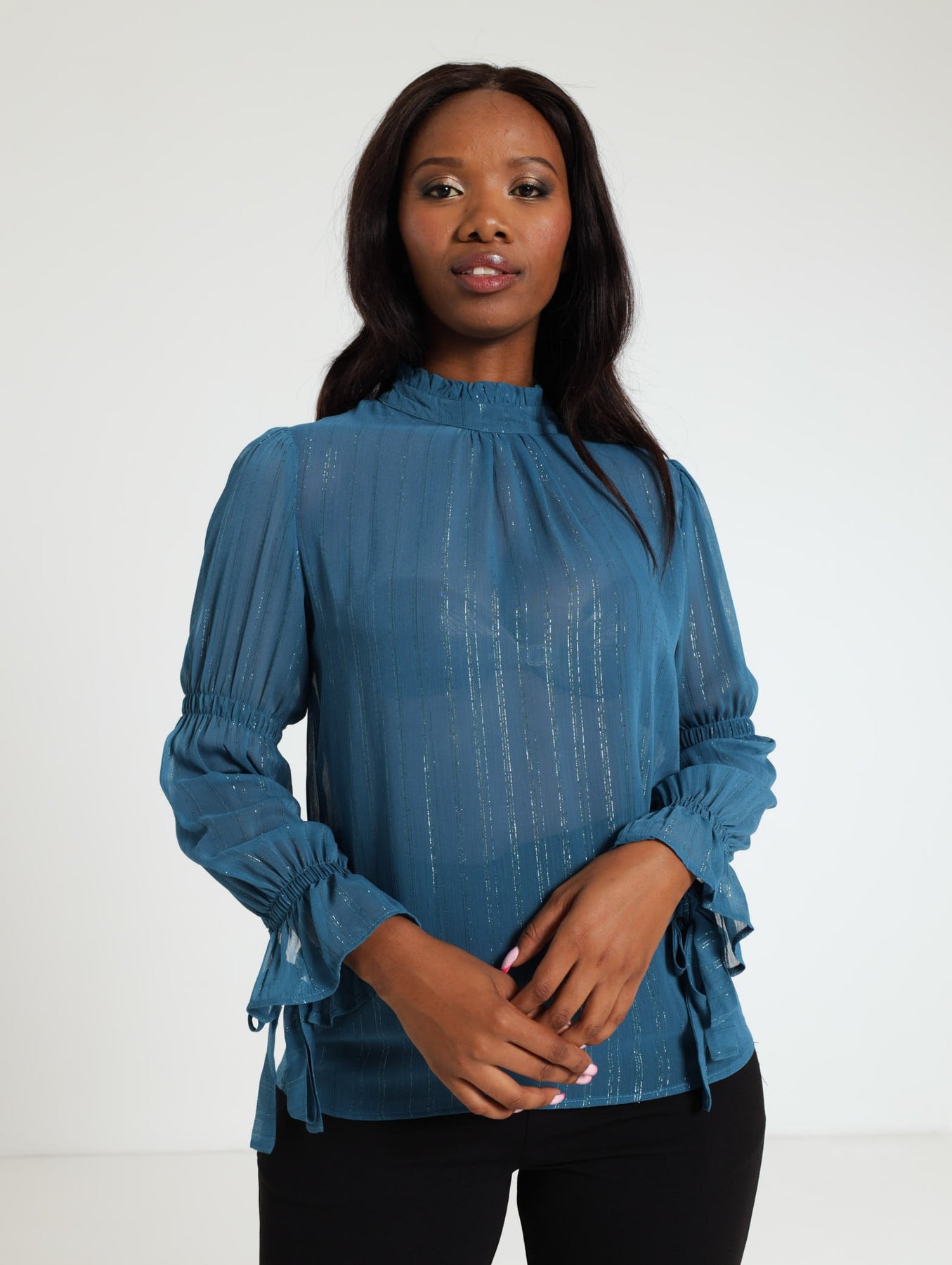 Hi Neck Tie Lurex Stripe Blouse - Teal