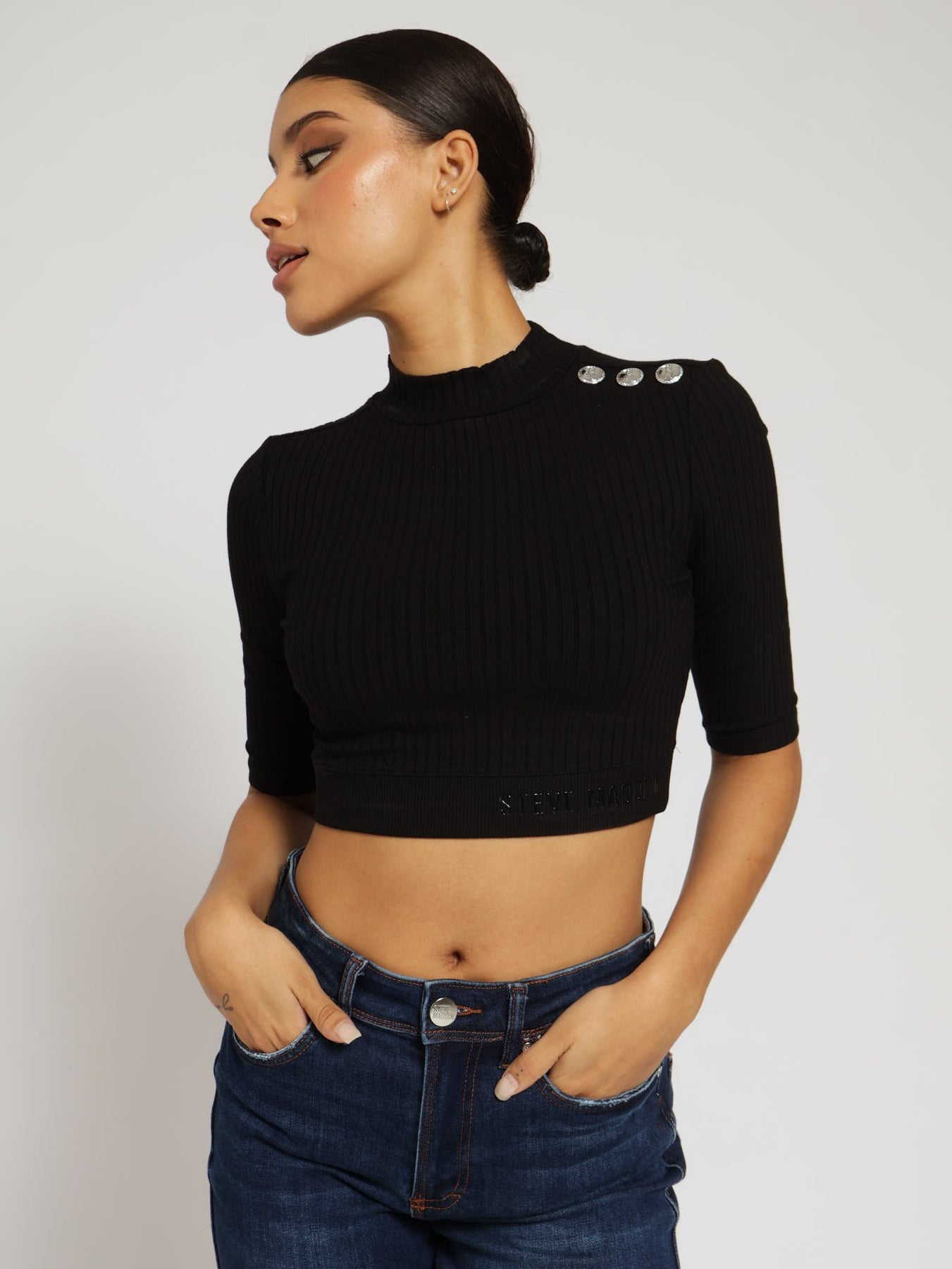 Indya Funnel Neck Rib Crop Top With Logo - Black