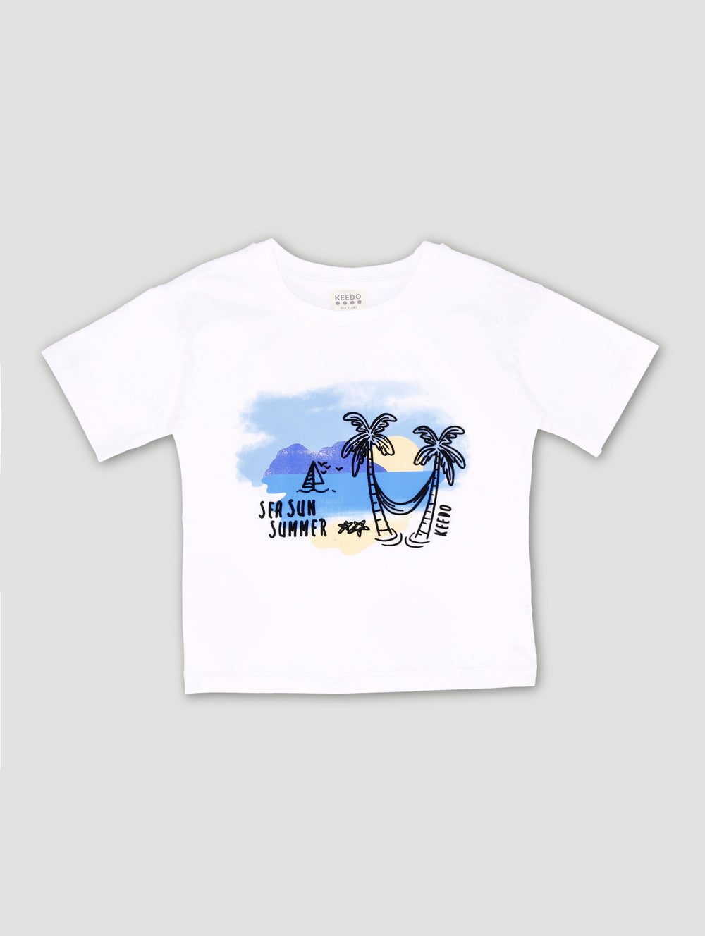 Discover the perfect summer tee for your little boy - the Boys White Sea Summer Tee! Made with comfortable cotton lycra and featuring a playful palm print, this tee will keep your child cool and stylish all season long. Bring a touch of the ocean to their wardrobe today!