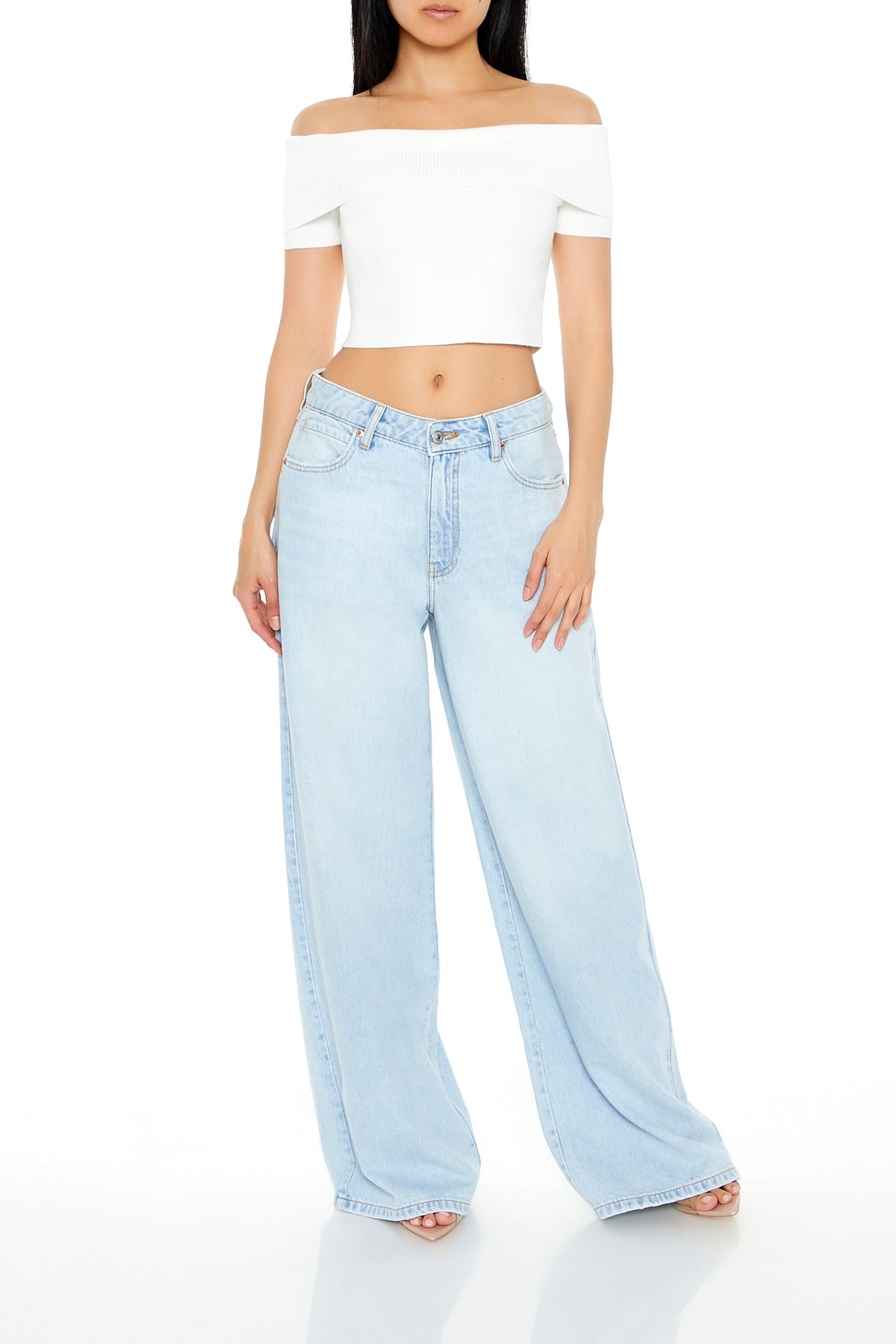 A sweater-knit crop top featuring a foldover off-the-shoulder neckline, ribbed trim, and short sleeves.