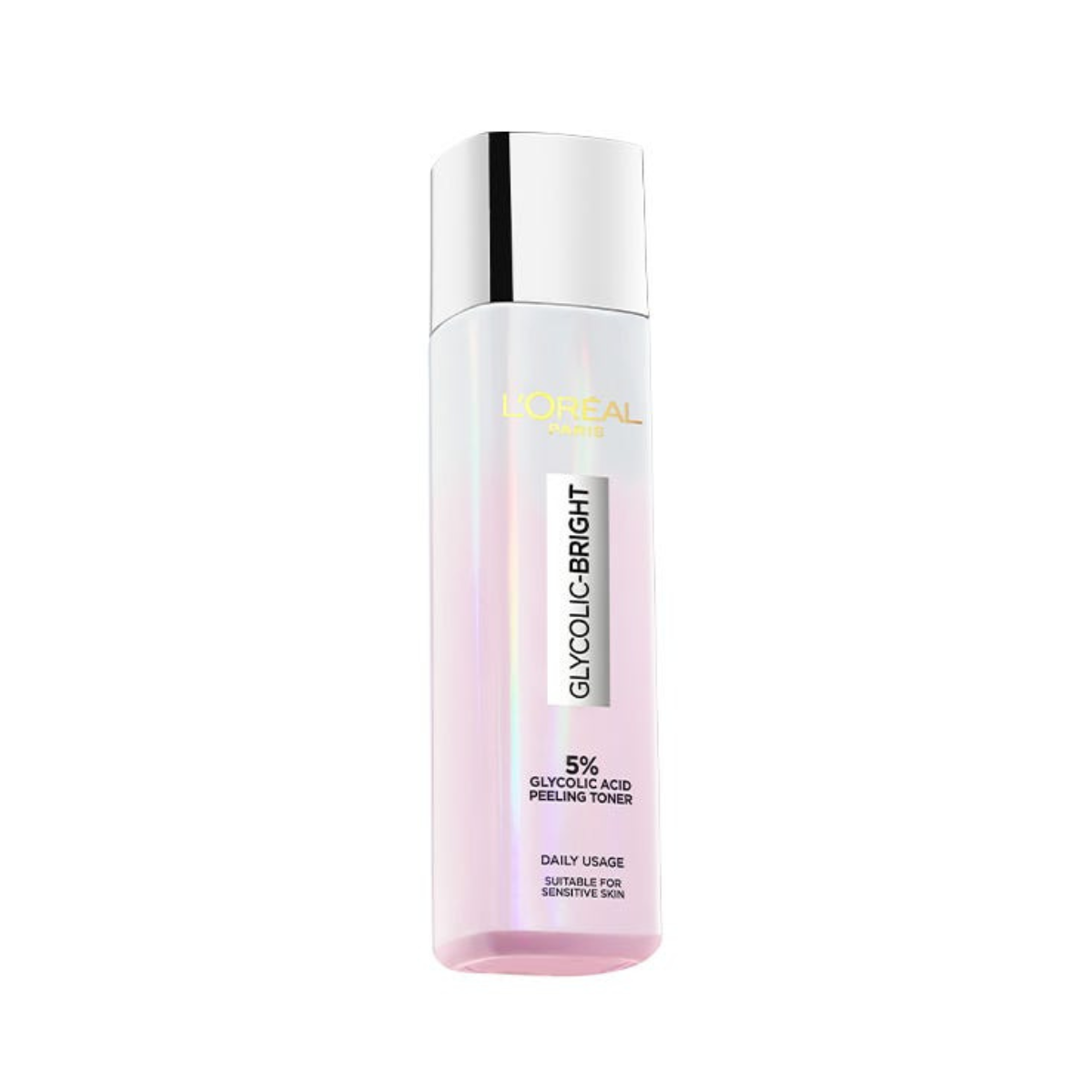The first mass market brightening toner with optimum 5% glycolic acid. concentration L’Oreal Skincare Laboratories developed GLYCOLIC-BRIGHT GLOWING PEELING TONER formulated with 5% Glycolic Acid, the dermatologist gold standard for professional peels, formulated for optimal efficiency and safety everyday. Clinically proven to reveal purified, fresh and glowing skin.