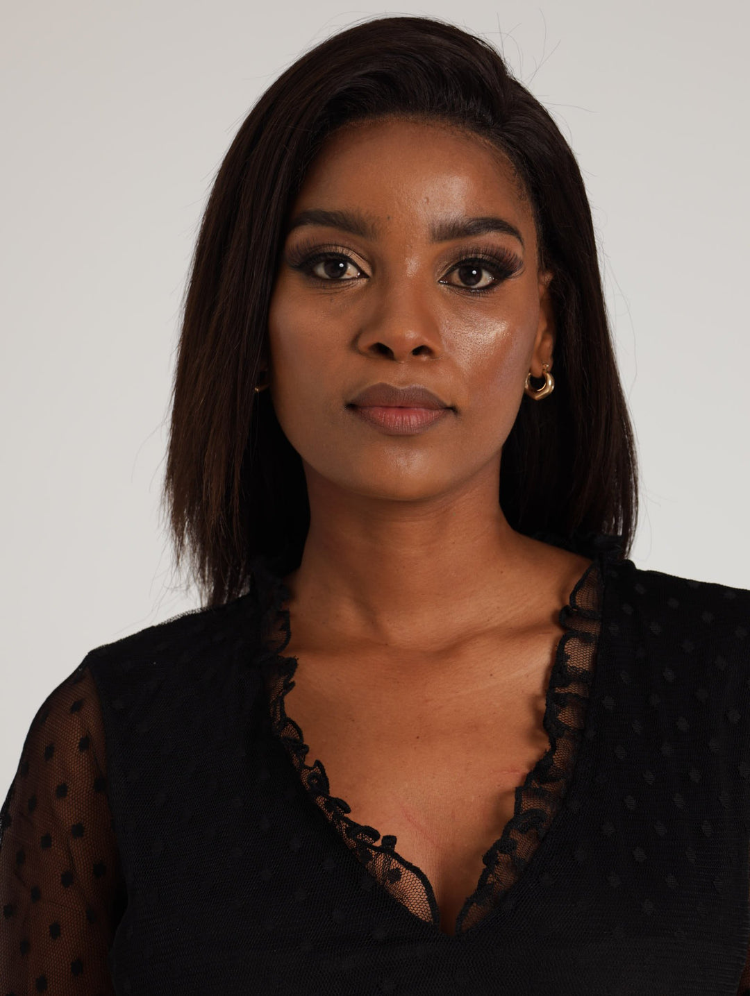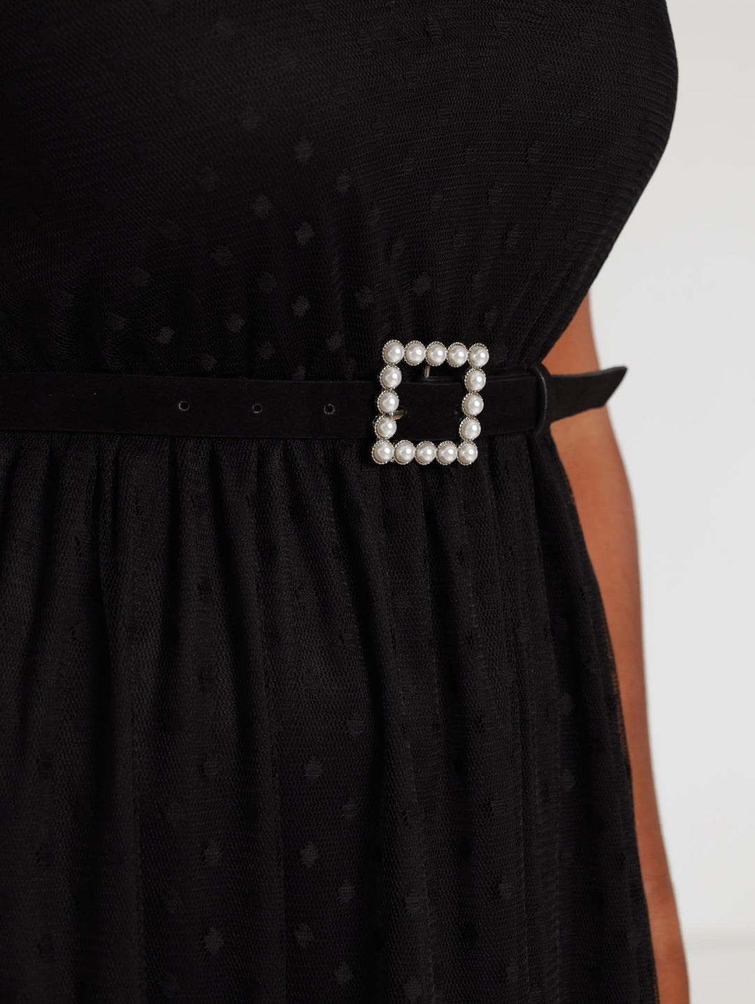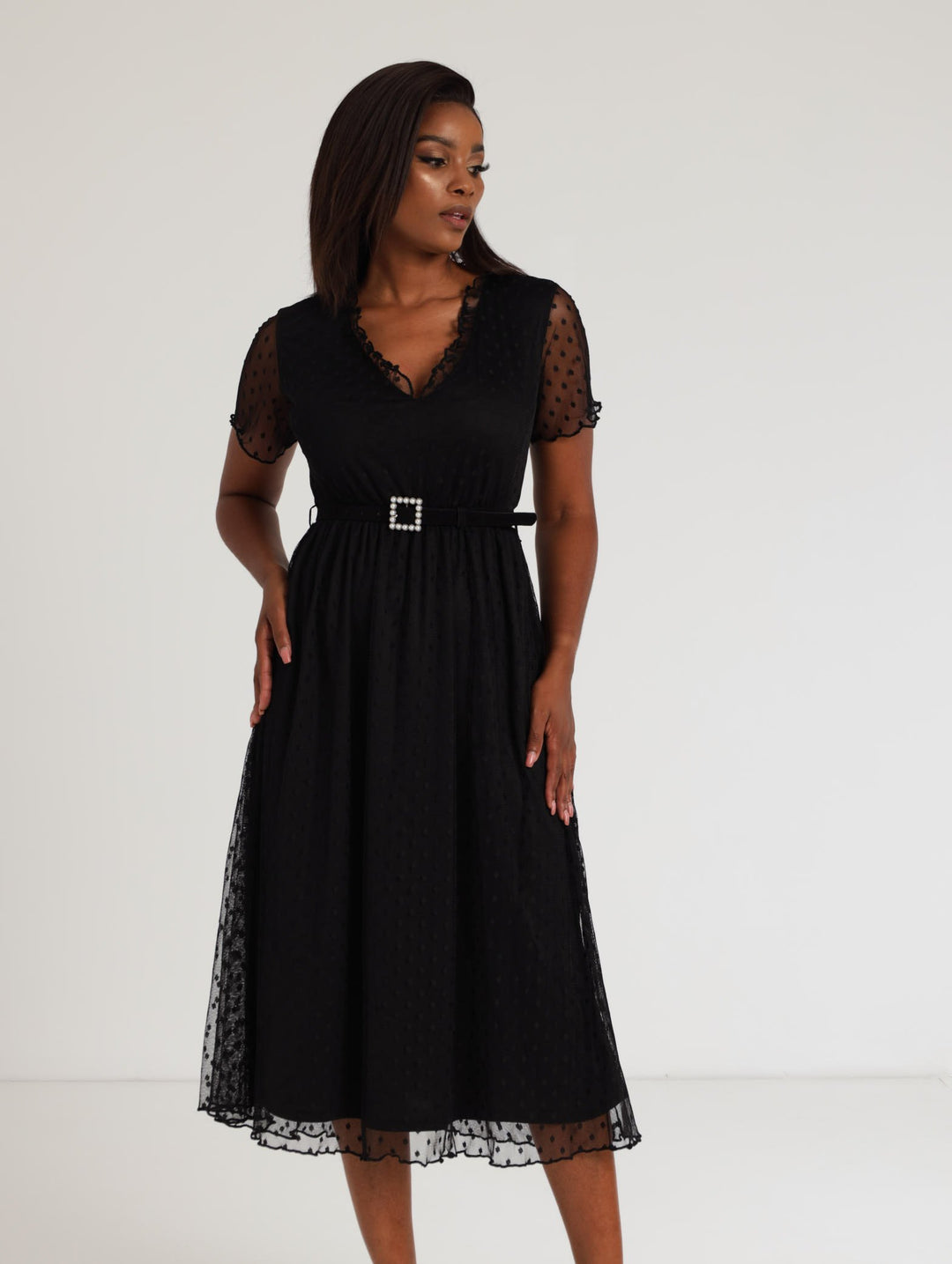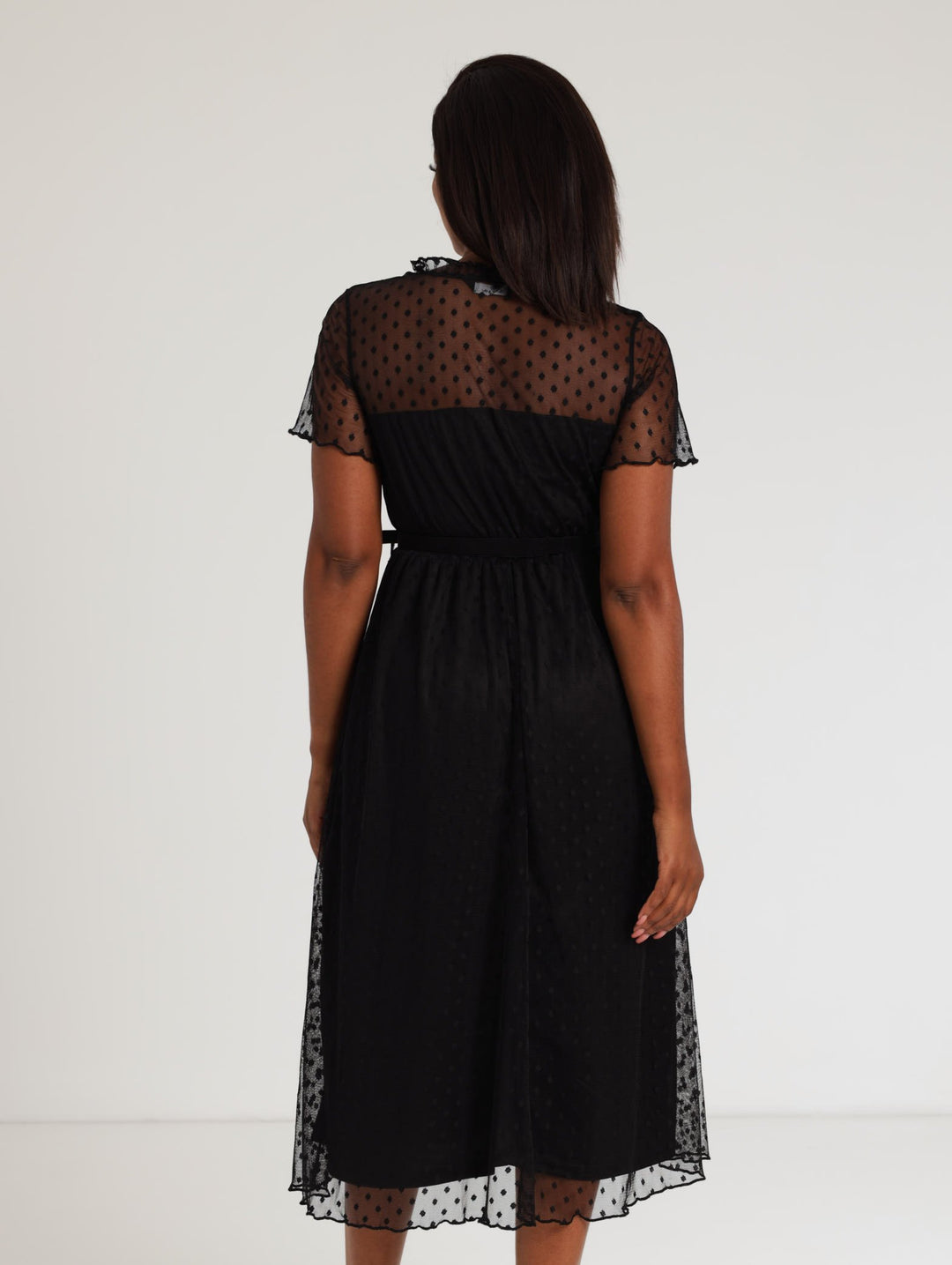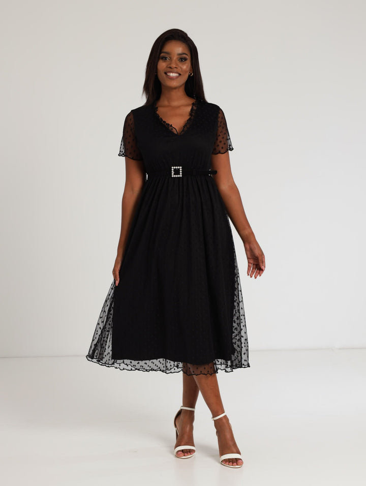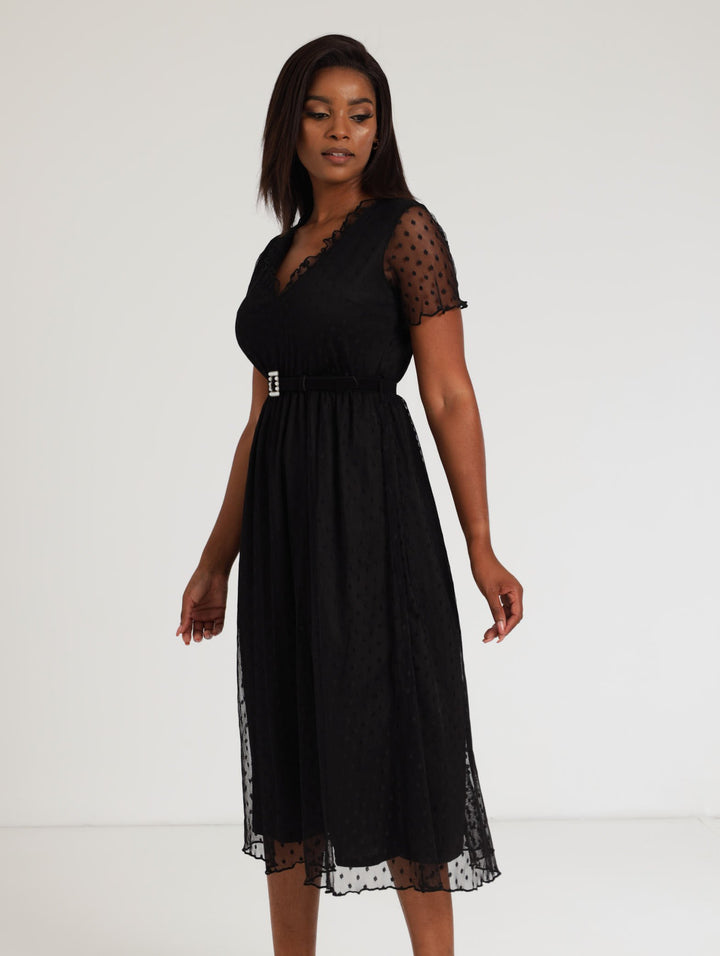 Ladies Belted Clip Spot Midi Dress - Black