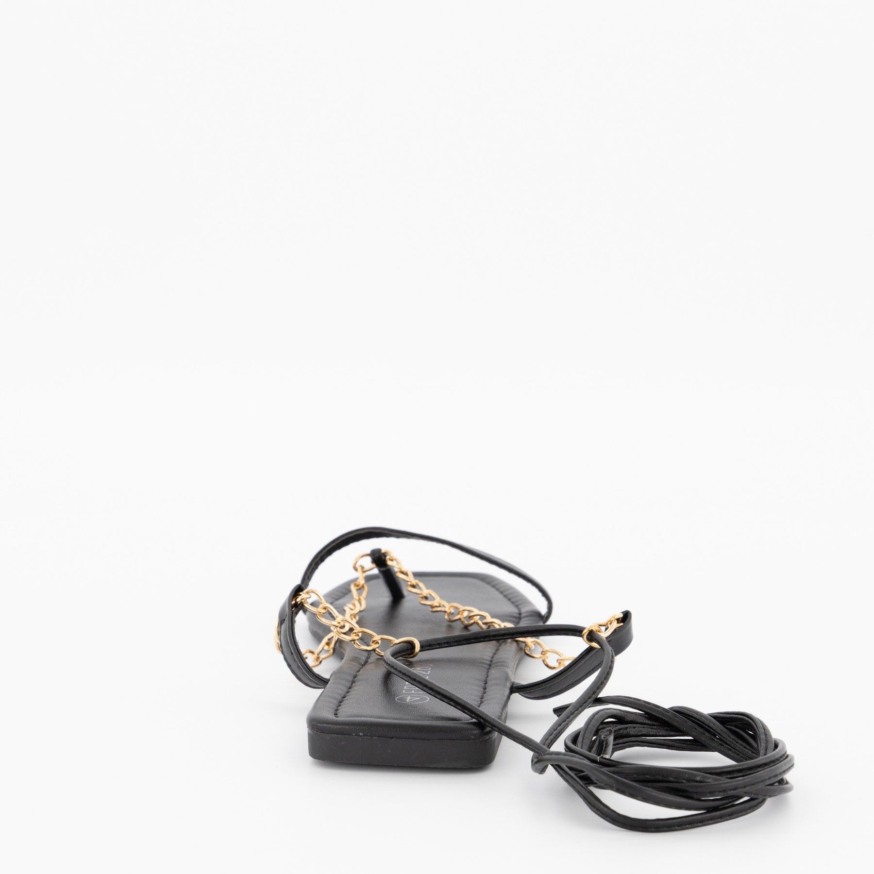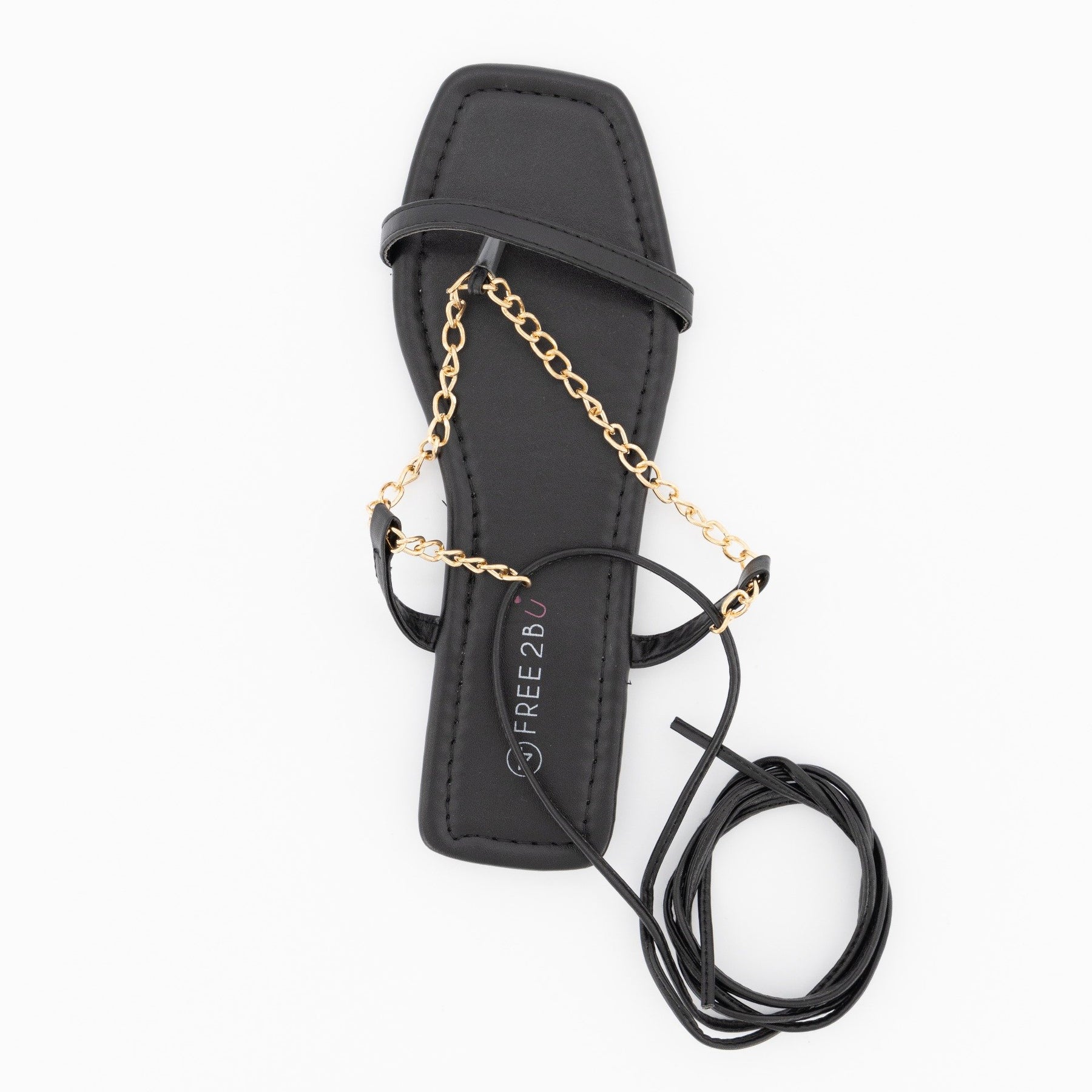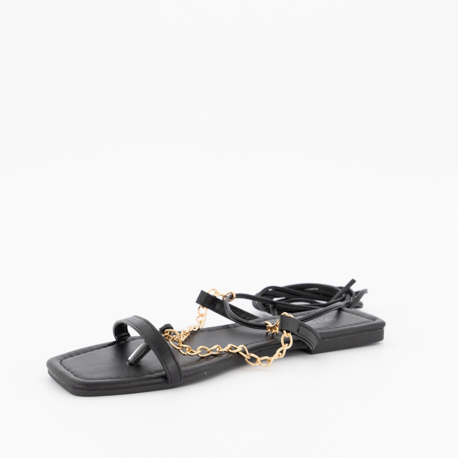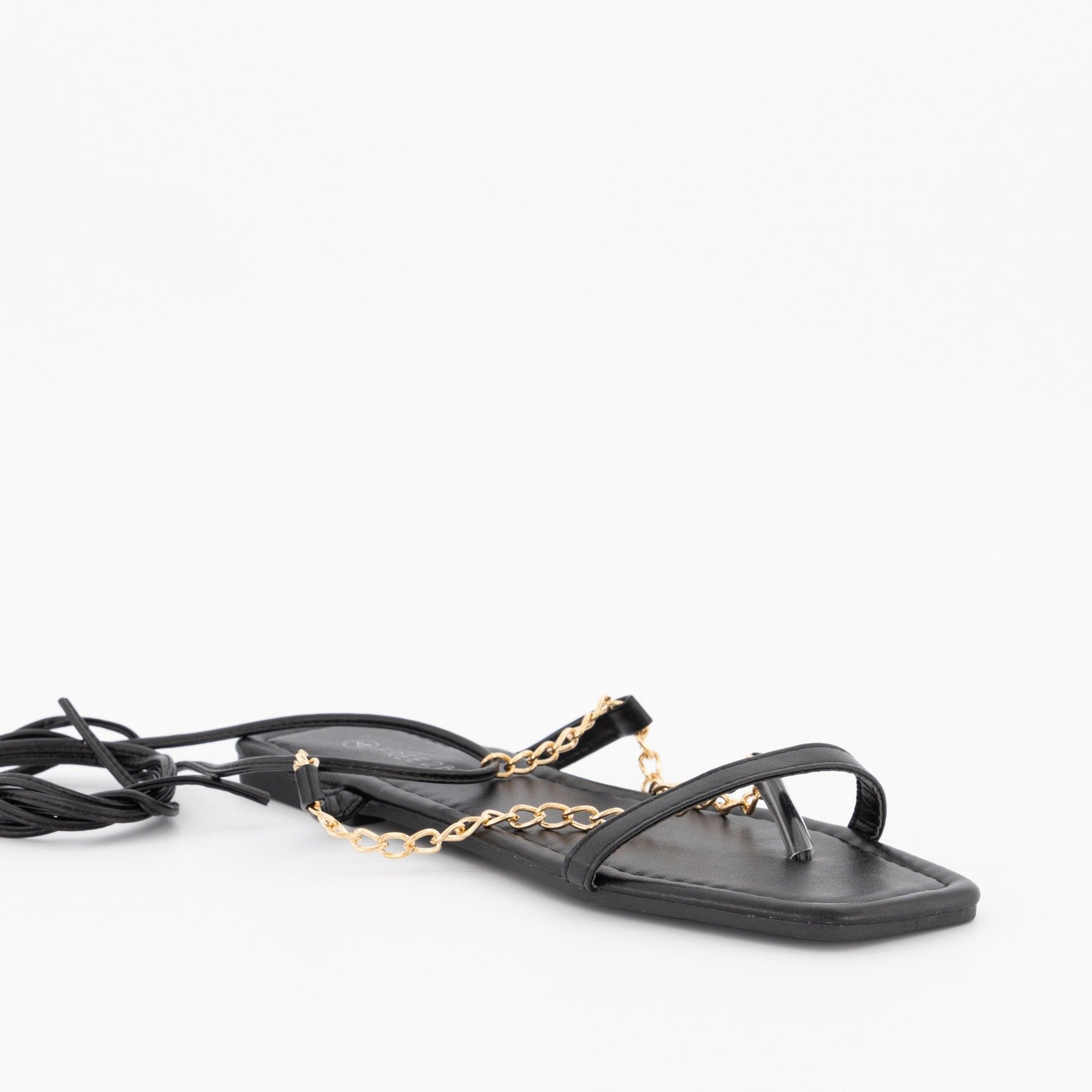 Ladies Chain Thong Lace-Up Flat Sandal - Black