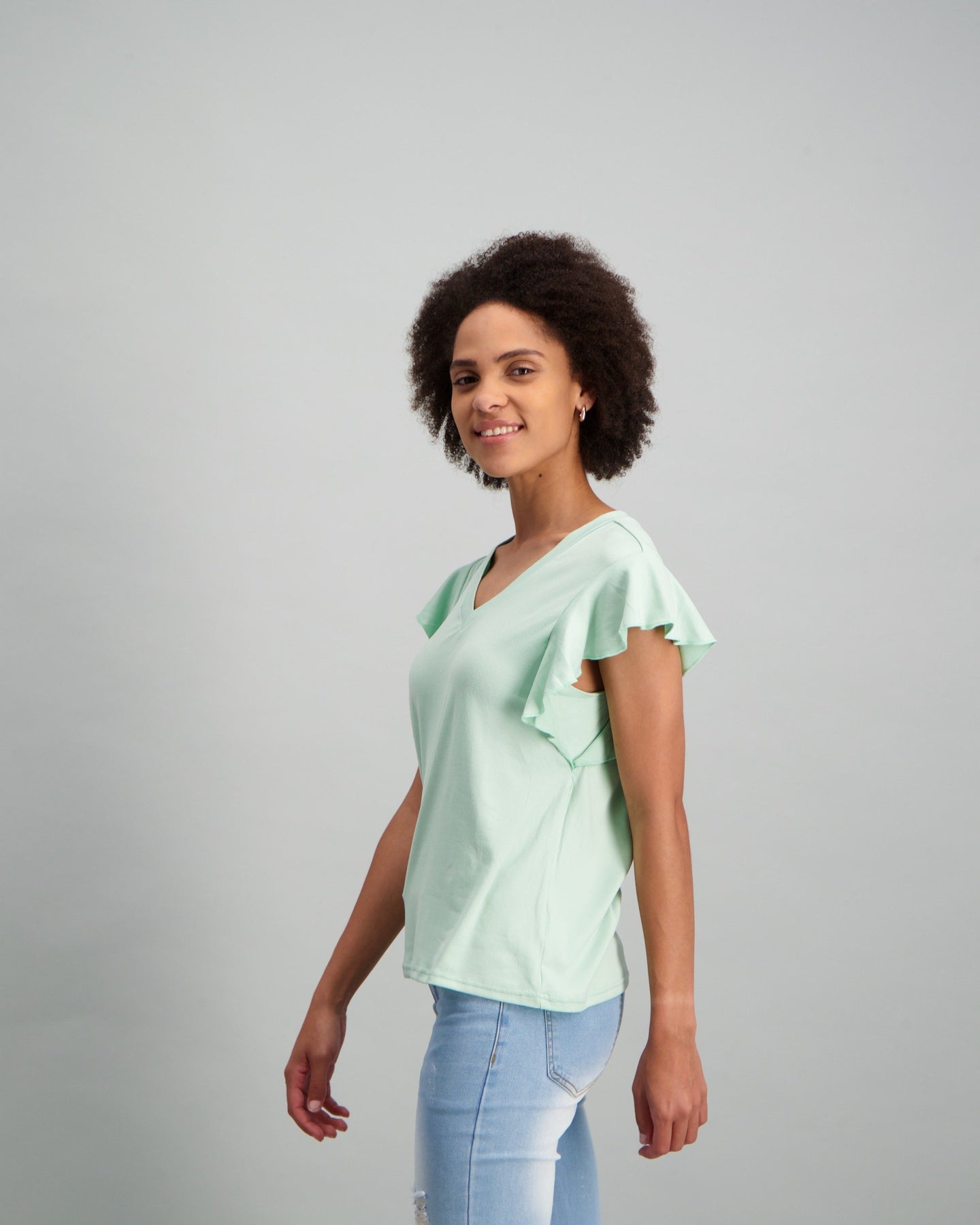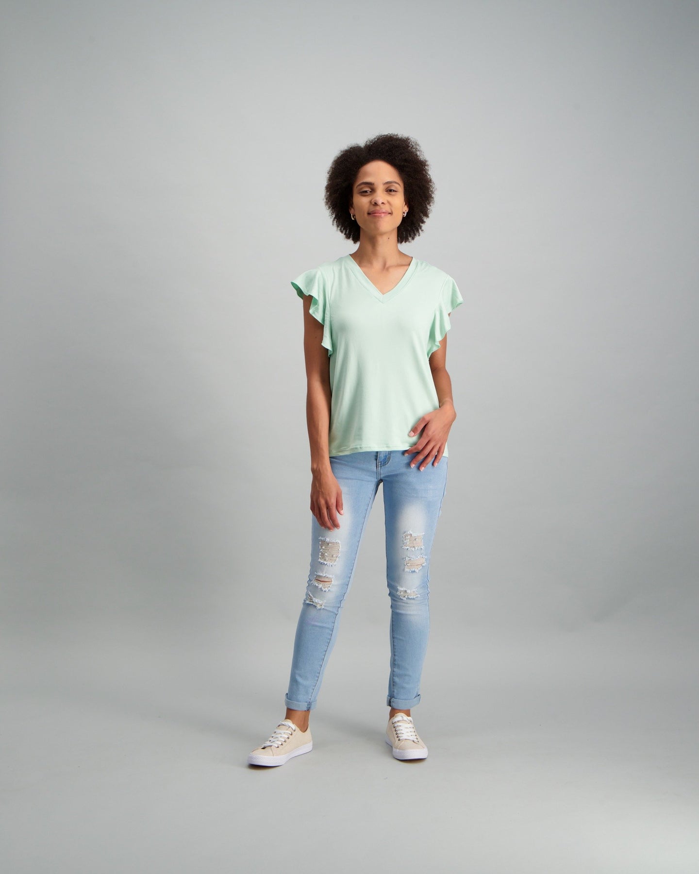 Features: V neckline, frill short sleeves and soft stretchy material.