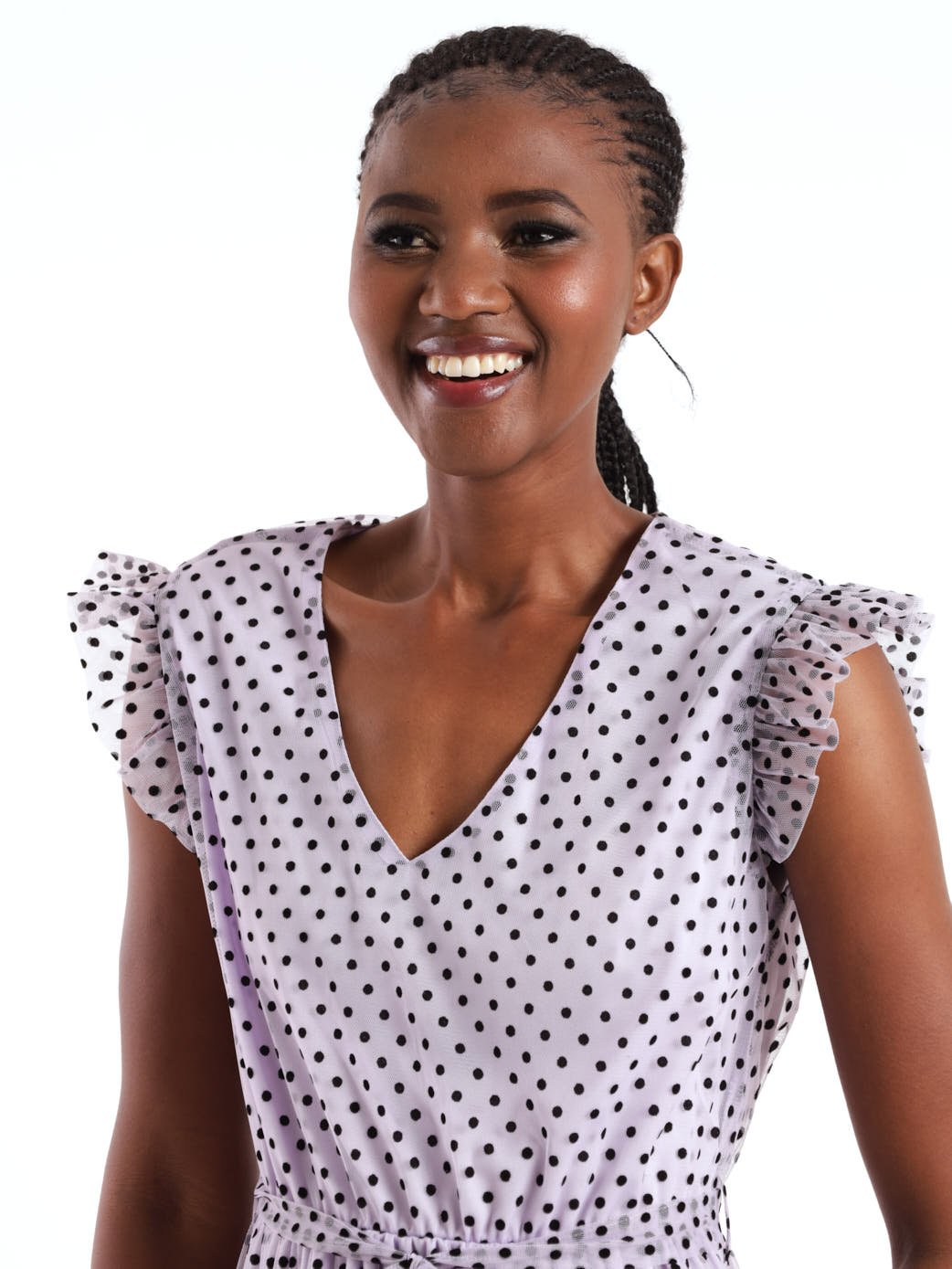 Ladies Frill Sleeve Flocked Mesh Dress - Lilac